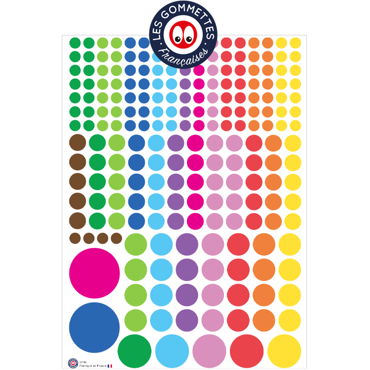 - Taille des gommettes : de 1 cm à 4,5 cm