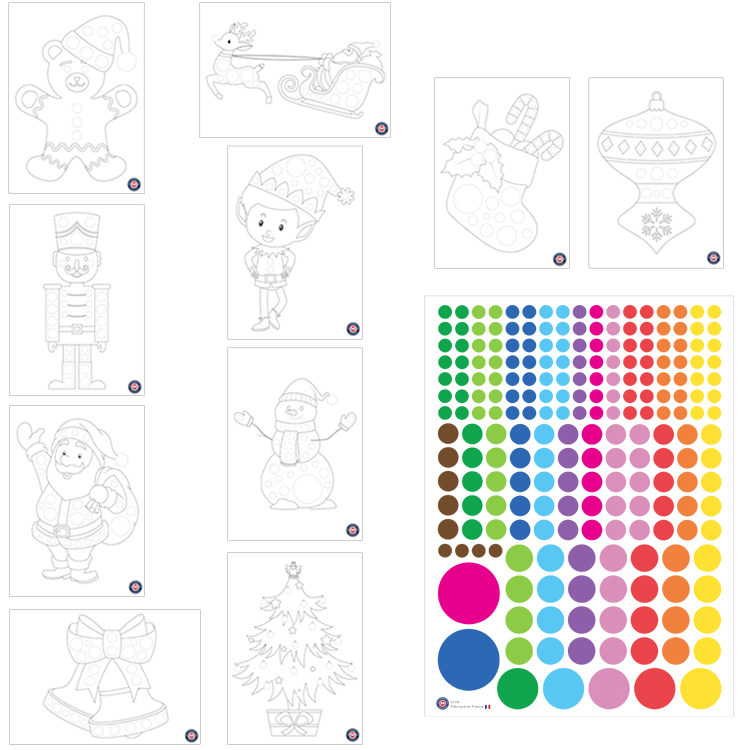 Le kit comprend : 218 gommettes rondes + 10 dessins à gommettes de Noël à décorer et à colorier.