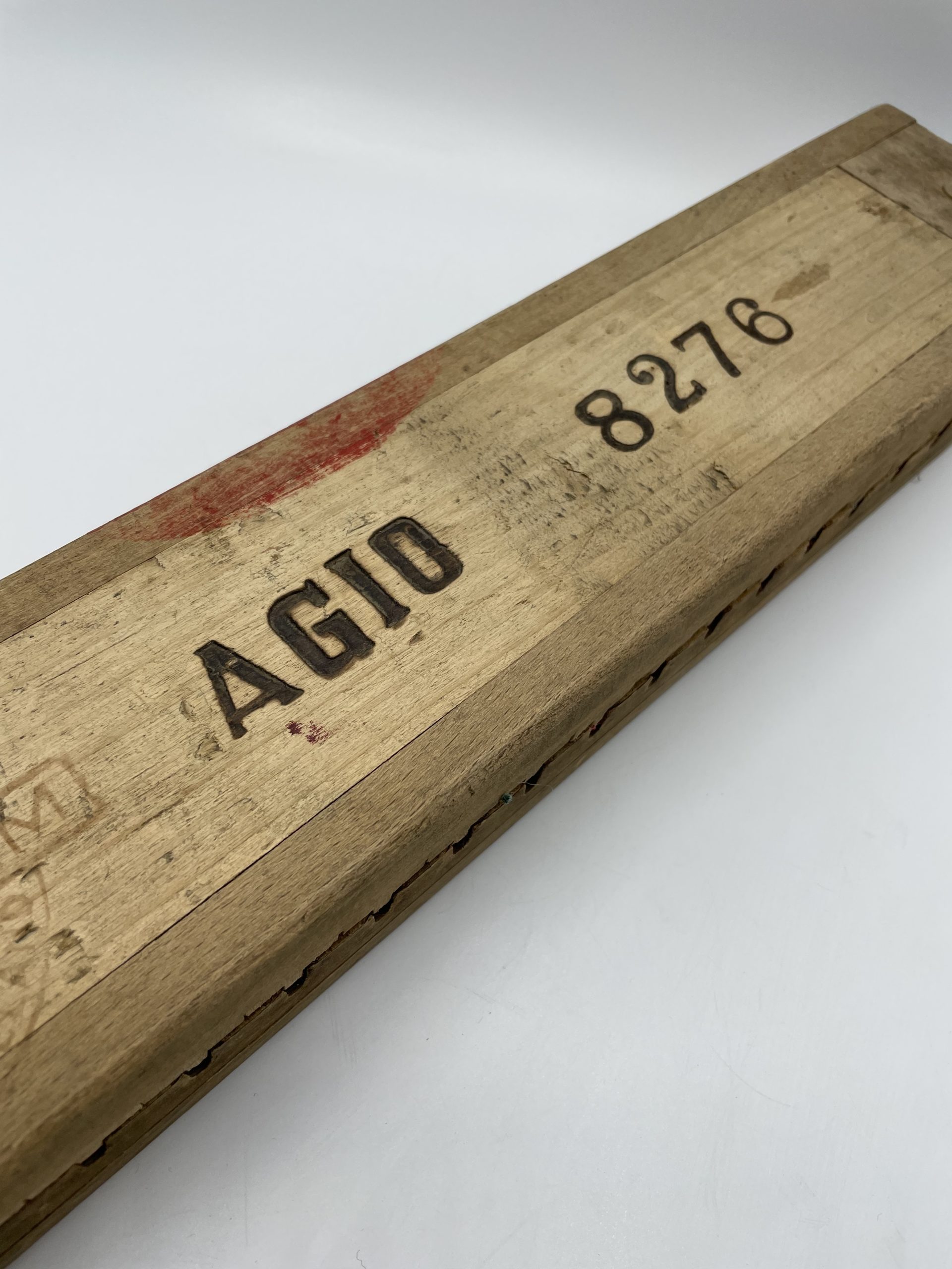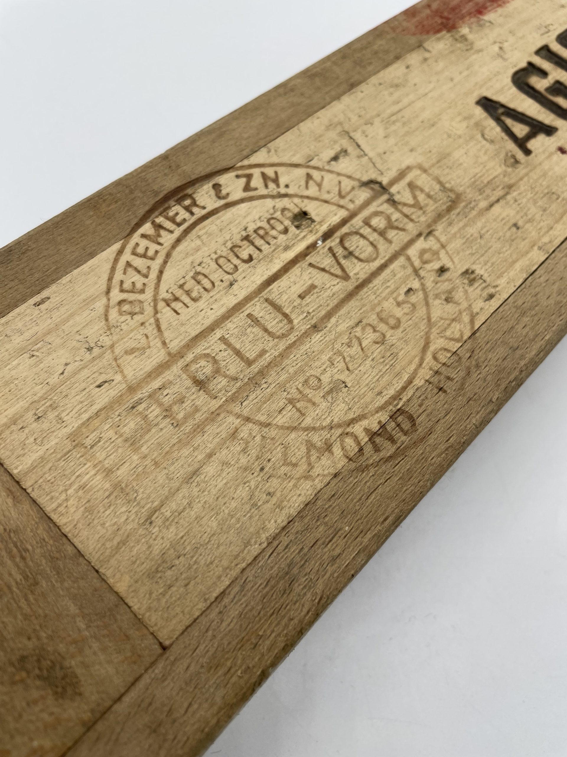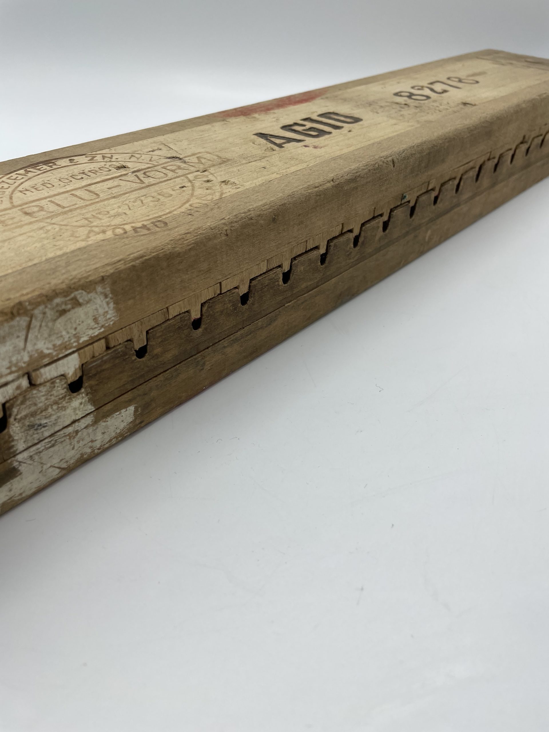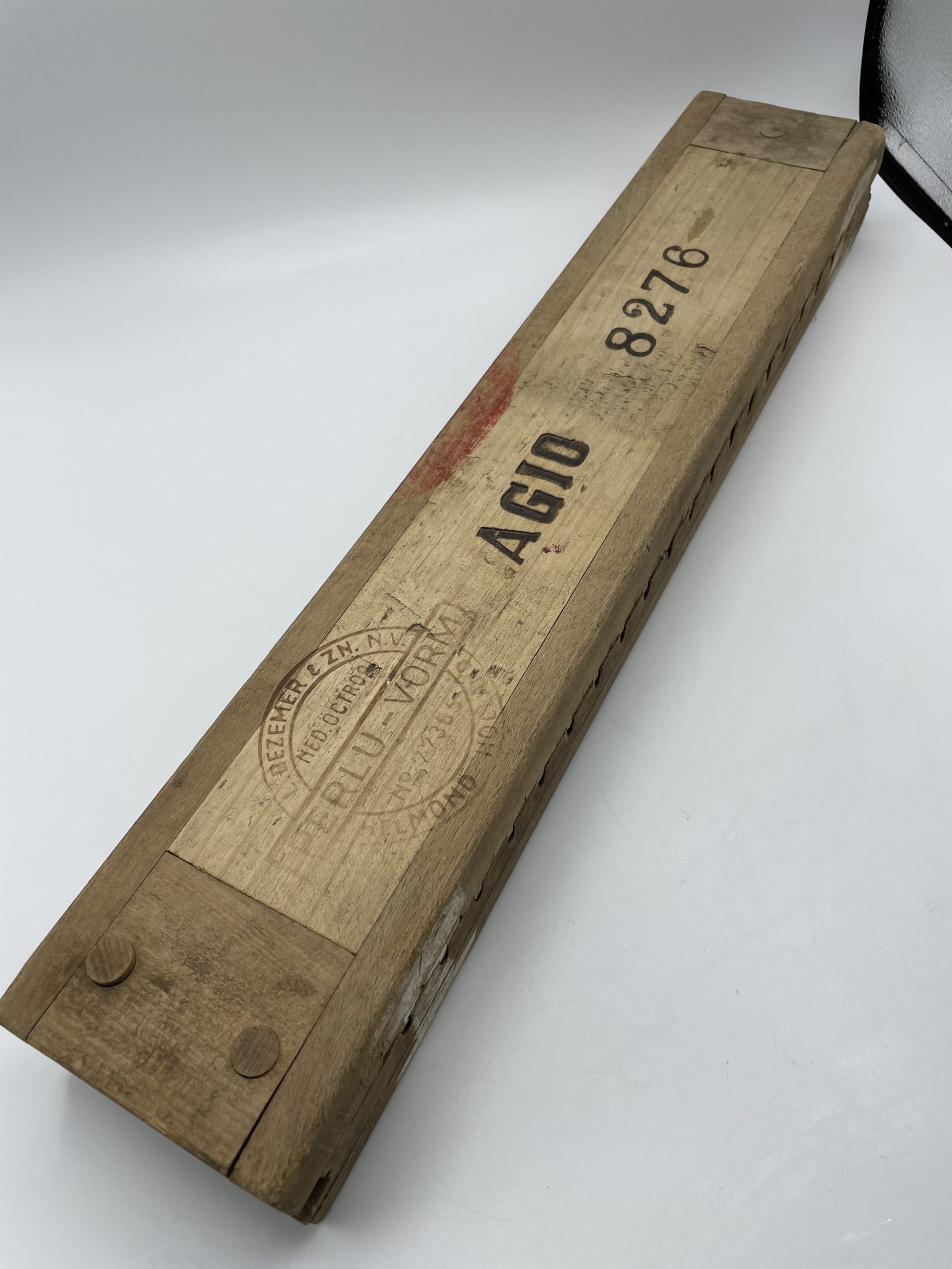 On craque d’amour pour cette ancienne presse à cigares vintage de la fabrique hollandaise Perlu Vorm. Marquages extérieurs numéroté n°77365 AGIO 82276  et marquage intérieur avec le nombre 1648. Prévu pour la presse de 20 cigares, ce moule ancien en bois est un objet superbe à collectionner ou à exposer comme décoration chez vous pour un esprit atelier !