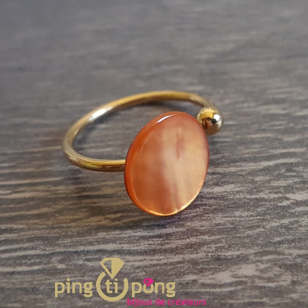 Très jolie bague plaquée or 24 carats ornée d’une pastille de nacre naturelle teintée ORANGE.