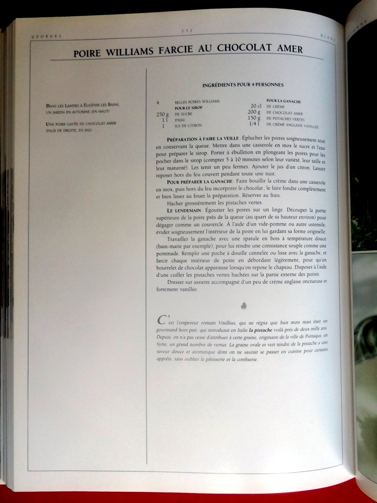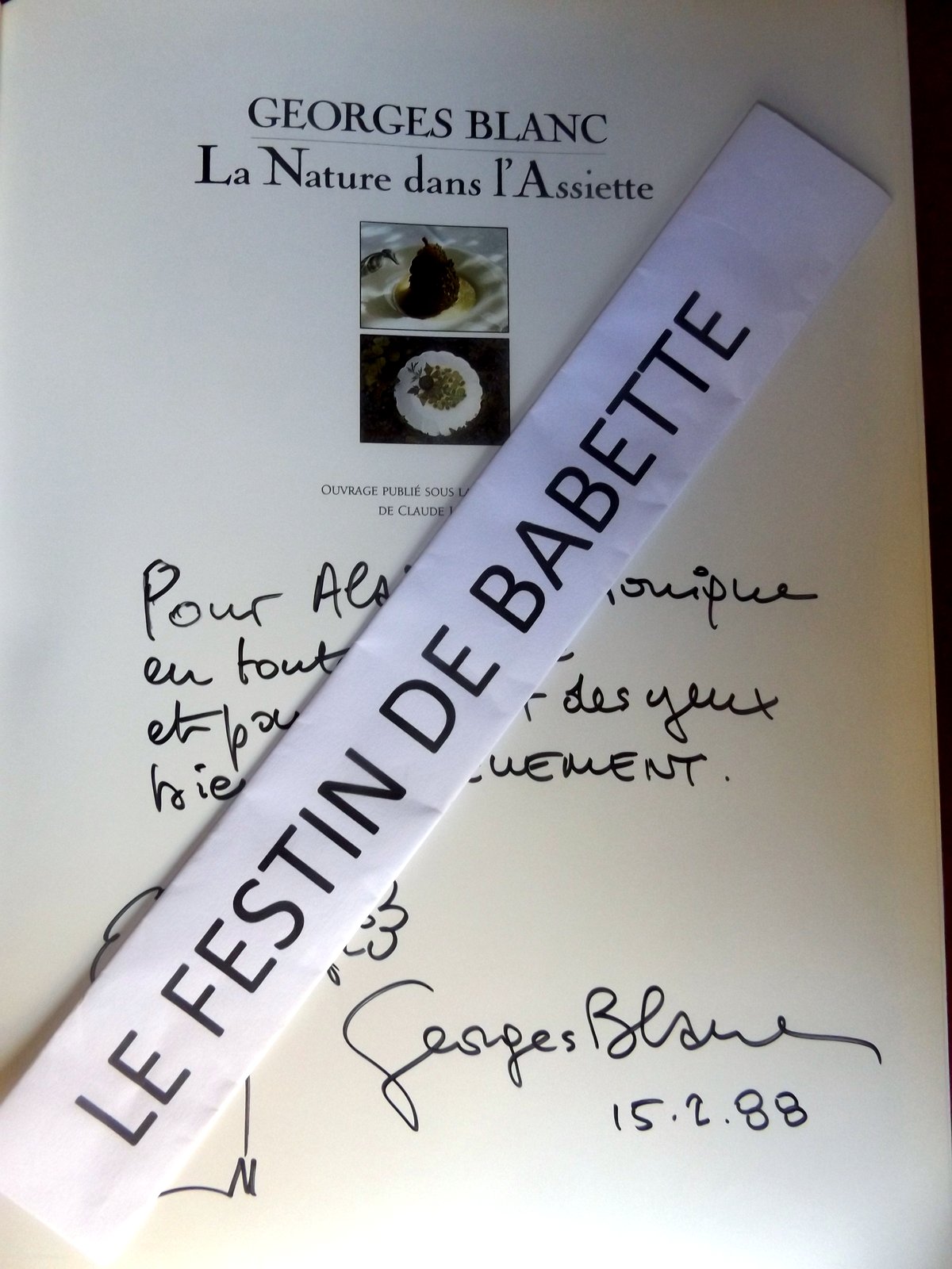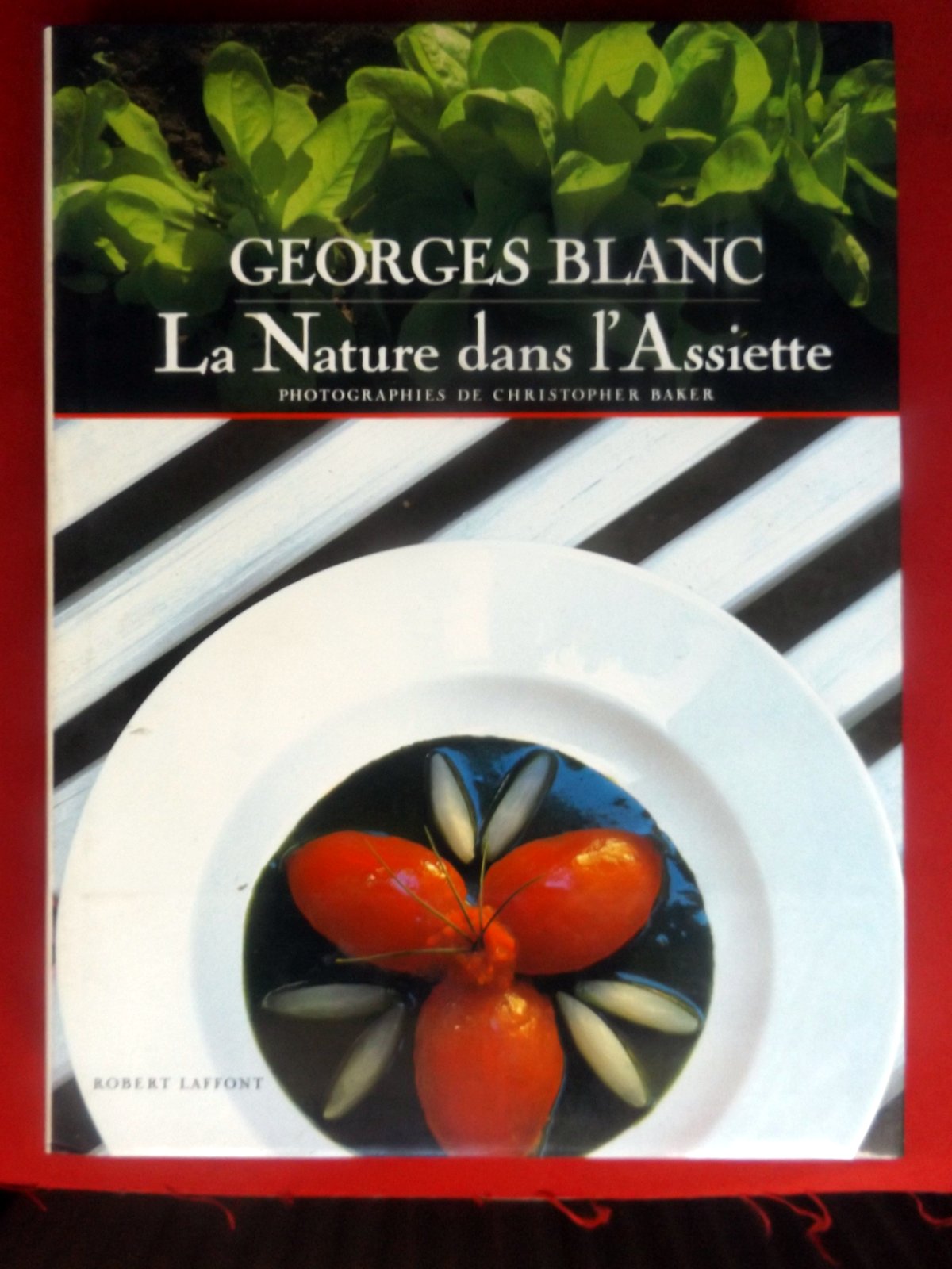 Paris, éd. Robert Laffont, 1987, EDITION ORIGINALE, gd. in-4, cartonnage toilé rouge éd., jaquette photos coul. éd., 320 pp., papier glacé, très nb. photos coul., sommaire, les produits en fonction des saisons (valeur énergétique, thérapeutique, etc.), index des recettes, très bel ENVOI de Georges Blanc à Alain et Véronique Guilloton, ancien propriétaire et chef de la « gourmandise » à Bergerac, ,