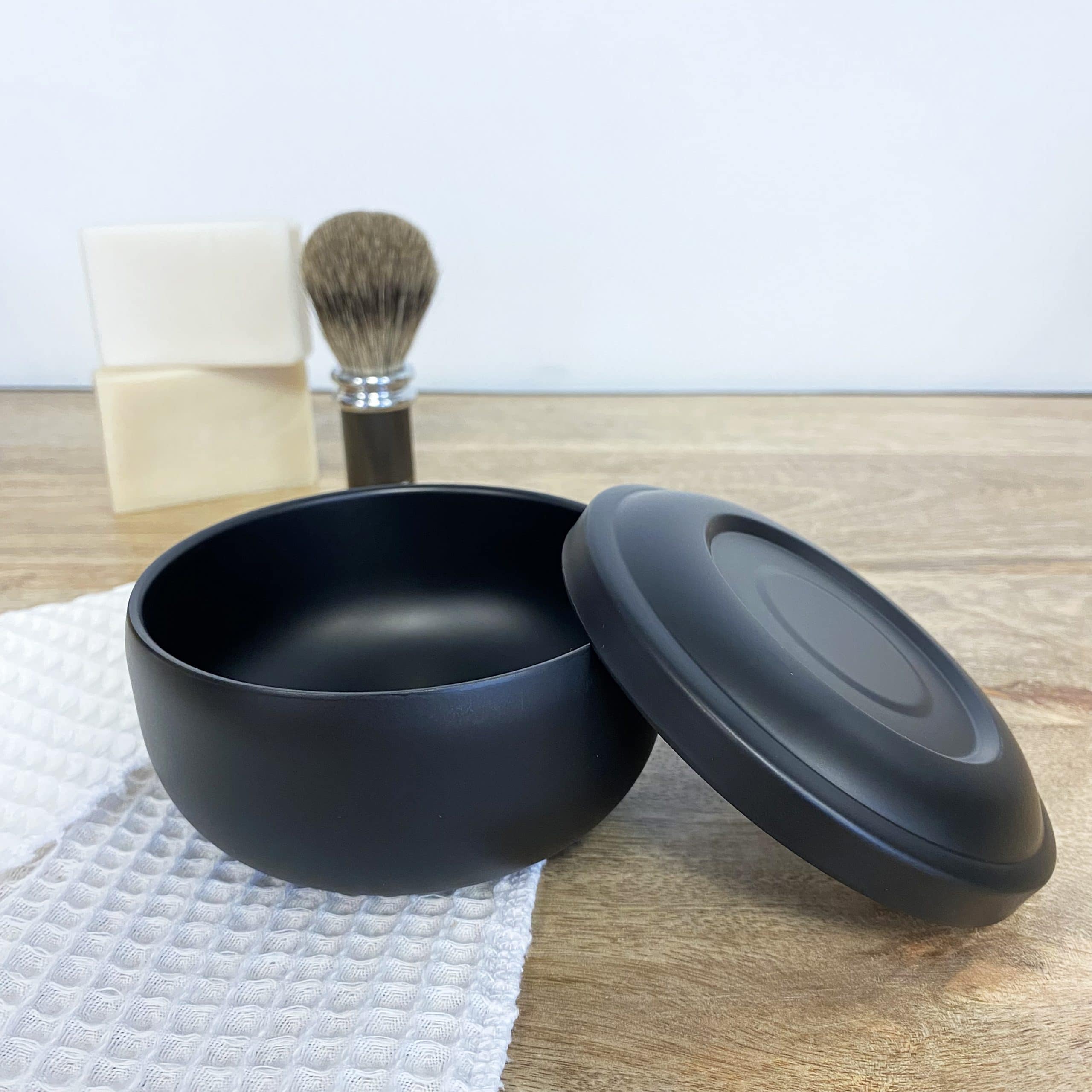 6. Rincez votre bol sous l’eau pour retirer le surplus de mousse, bien le sécher à l’aide d’un chiffon, replacez le savon et fermez le bol jusqu’à la prochaine utilisation.