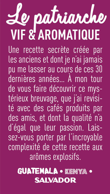 Dégustez ce café en grains « Le Patriarche », composé d’Arabicas grands crus du Guatemala, du Kenya et du Salvador. Vous aurez une tasse vive et aromatique. Café assemblé et torréfié artisanalement à La Teste de Buch
