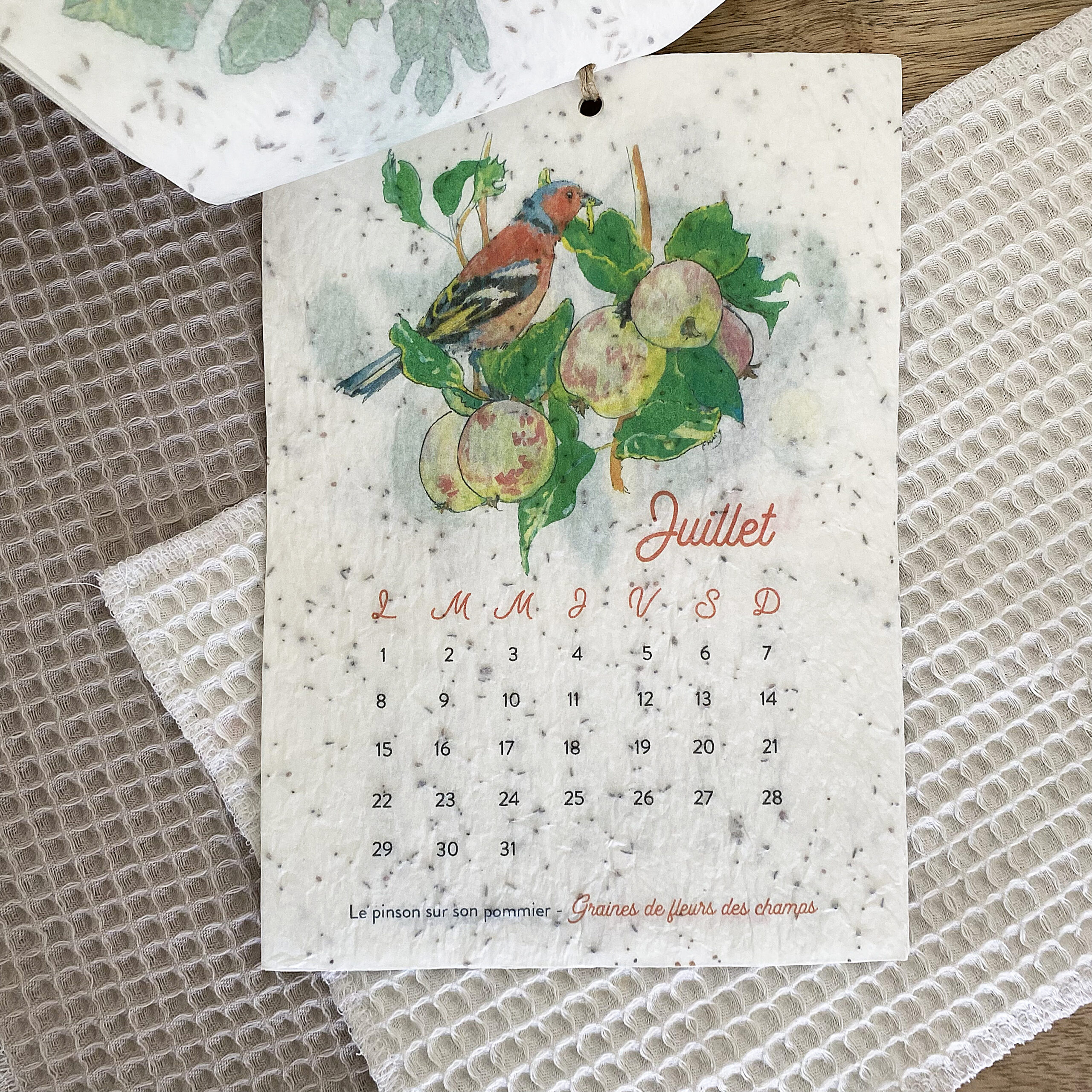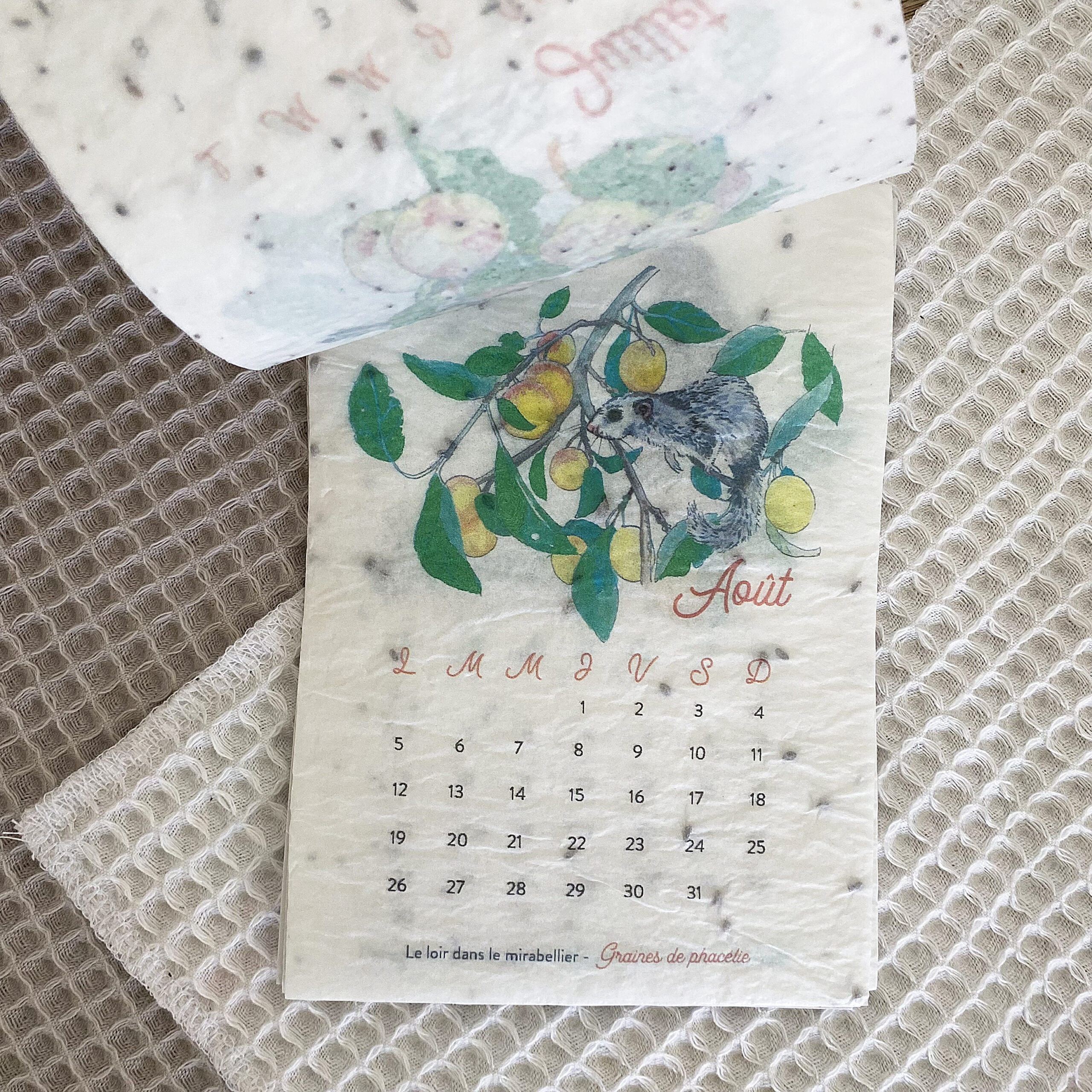 Calendrier à planter en papier naturel avec semences incorporées illustré mois par mois avec les animaux de nos jardins.