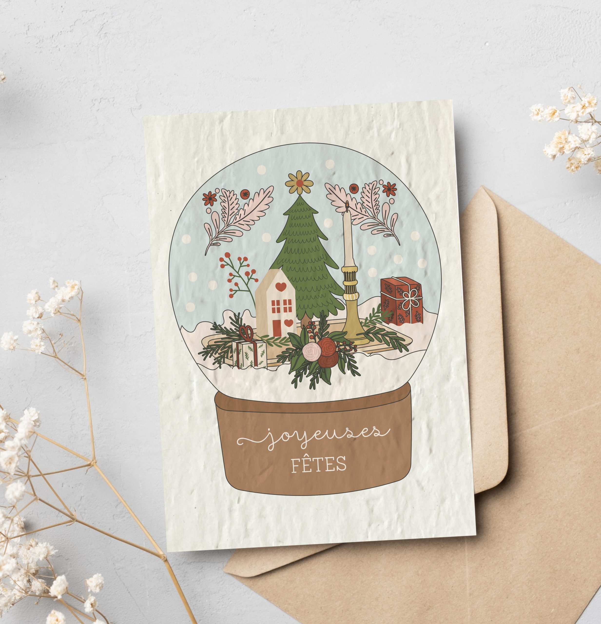Cette carte originale représente une jolie scène festive dans une boule de neige et porte le message “Joyeuses Fêtes”. Une fois le message reçu, elle peut être plantée pour laisser pousser des fleurs des champs, un geste éco-responsable qui allie fête et nature.