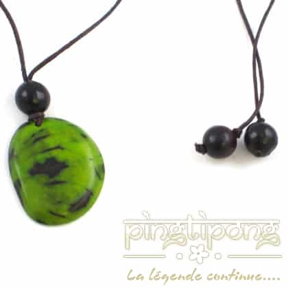 Le pendentif vert est taillé dans une noix : la noix de tagua appelée aussi ivoire végétal teintée en vert pomme.