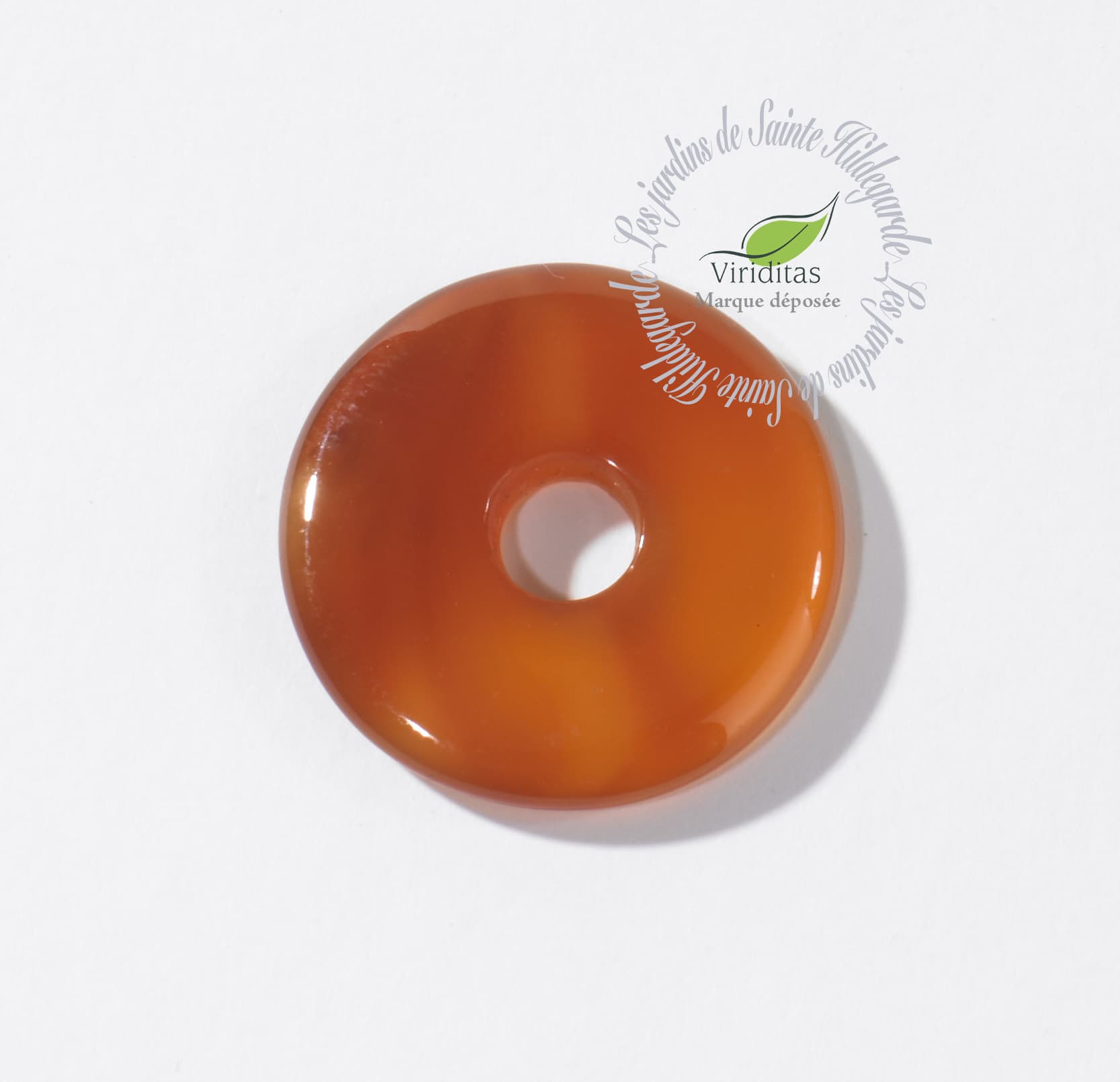 Description : Le donut se porte comme un pendentif avec un lien de cuir qui passe au centre. Circonférence de 20 à 25 mm et épaisseur de 2 à 3 mm.