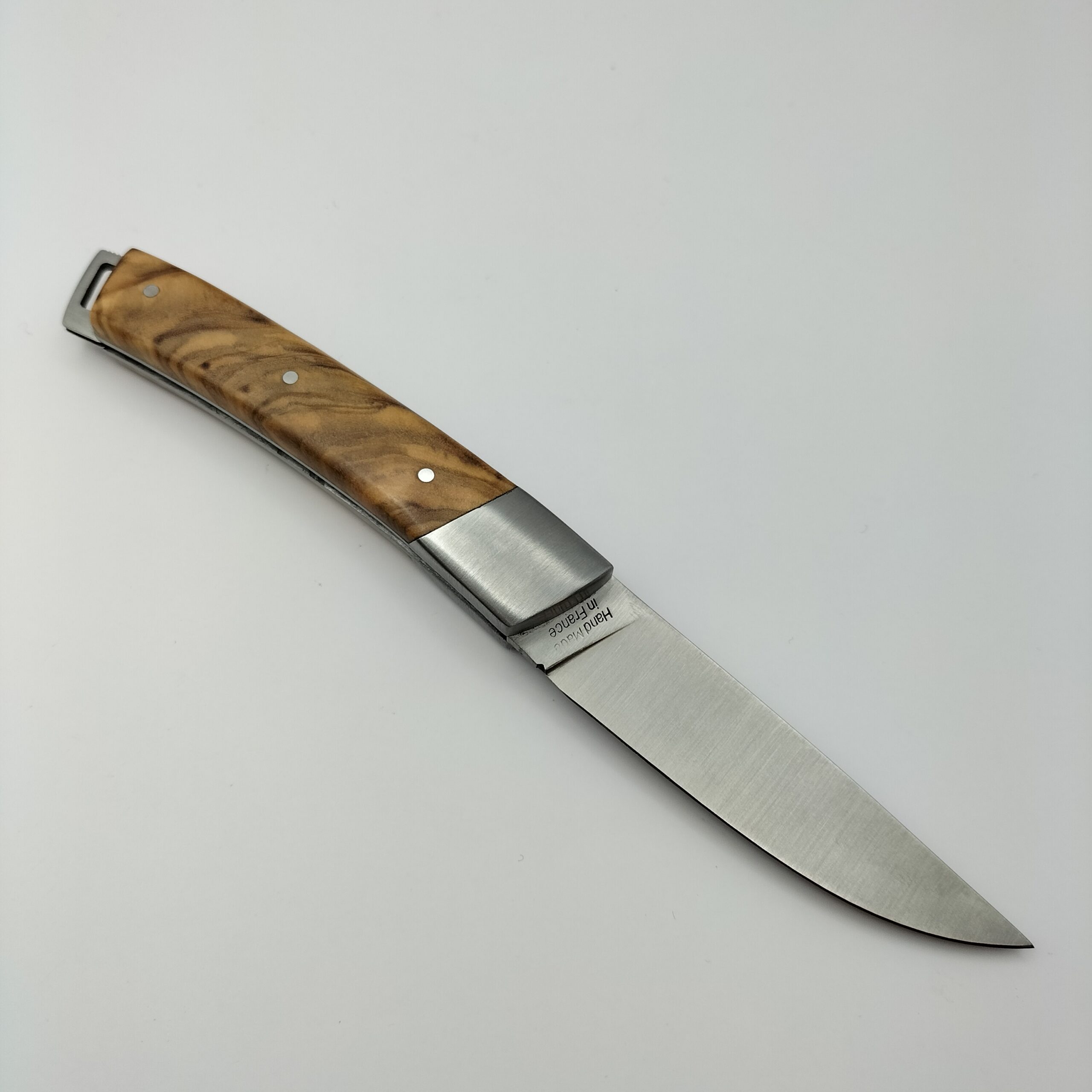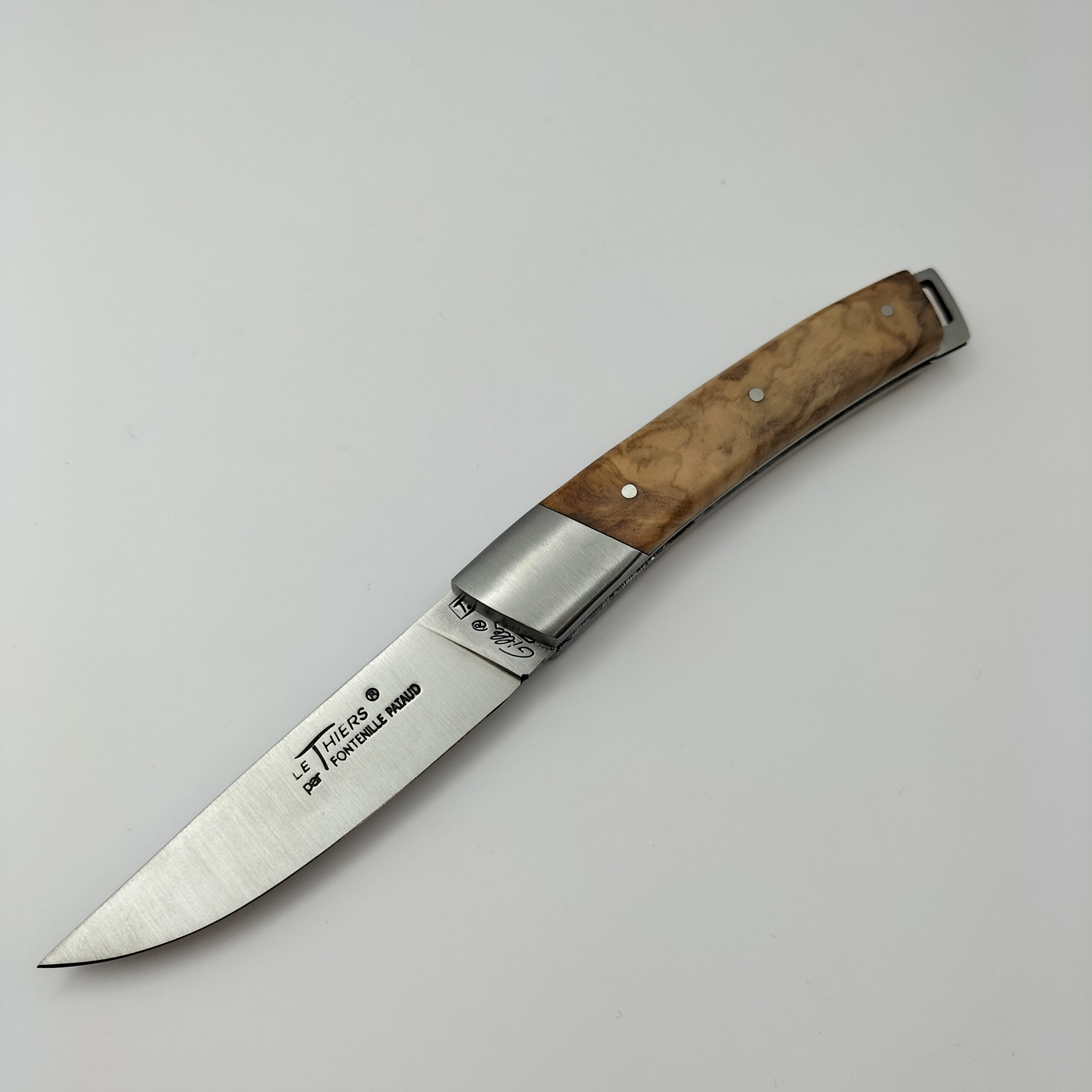 Le couteau de poche Thiers Gilles Olivier incarne l’élégance et la qualité artisanale. Son manche en olivier offre une esthétique naturelle et raffinée, soulignée par un ressort guilloché qui ajoute une touche d’artisanat précieux.