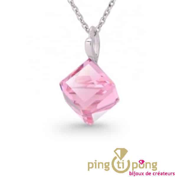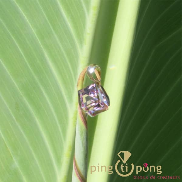 Petit cube rose en cristal de Swarovski monté sur une attache en argent rhodié.