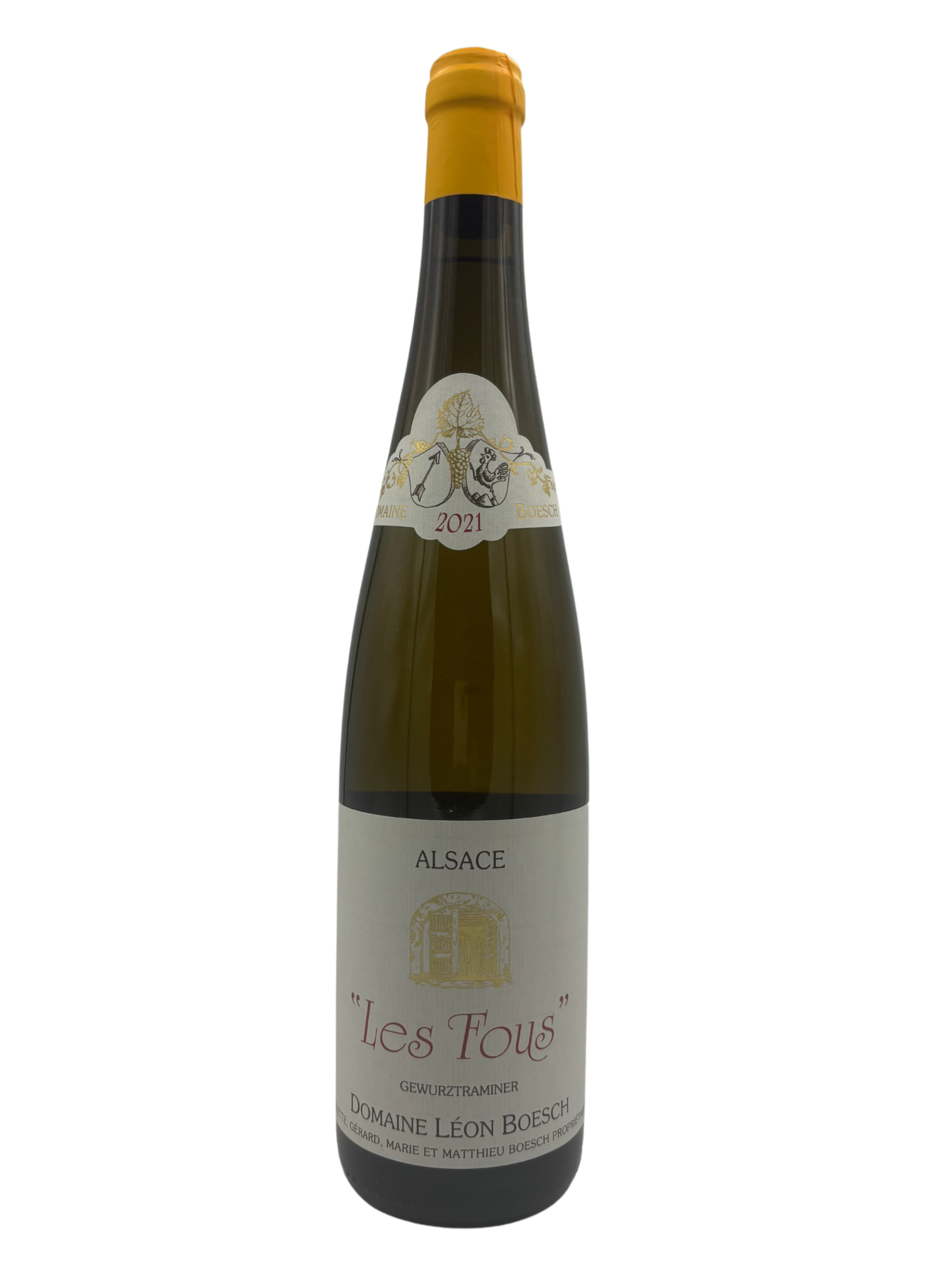 Gewurztraminer Les Fous Leon Boesch. Le Domaine Léon Boesch est un domaine viticole familial situé à Soultzmatt, au cœur de la vallée noble en Alsace. Il est fondé en 1640 et est aujourd’hui dirigé par la 11e génération de la famille Boesch. Le domaine est aujourd’hui reconnu pour son engagement en faveur de la viticulture biodynamique depuis 2000. Ici on ne triche pas avec la nature, les vins reflètent fidèlement les terroirs alsaciens. Ce Gewurztraminer Les Fous 2021 présente une belle intensité aromatique et un joli nez expressif, il exprime pleinement le caractère du cépage Gewurztraminer. On y retrouve des notes de litchi, de rose et d’épices. Le vin est parfaitement sec, droit et ciselé.