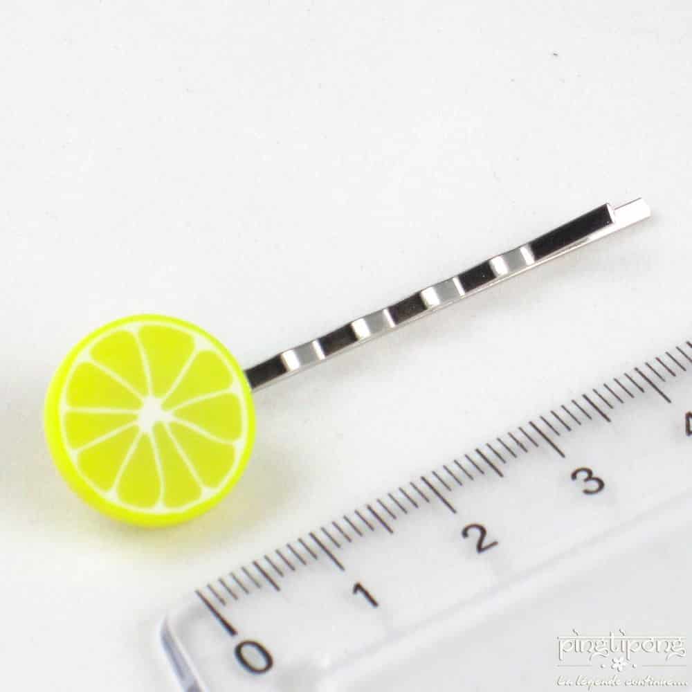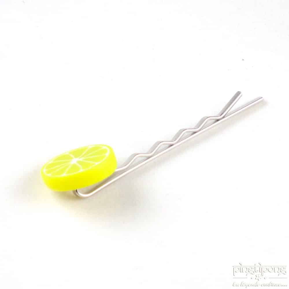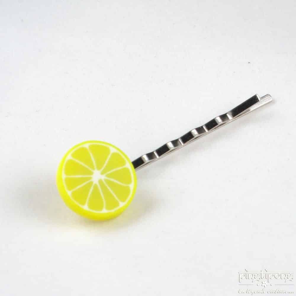 Une grande barrette à croquer en forme de fruit frais : un petite tranche de citron jaune.
