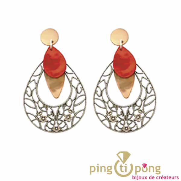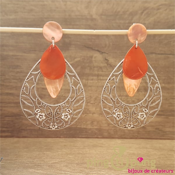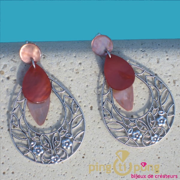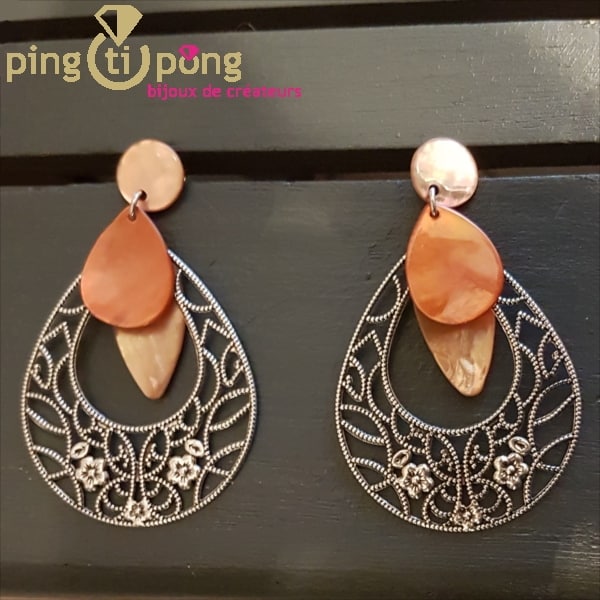 Ces boucles pendantes en nacre et métal ont été inspirées par des bijoux indiens.