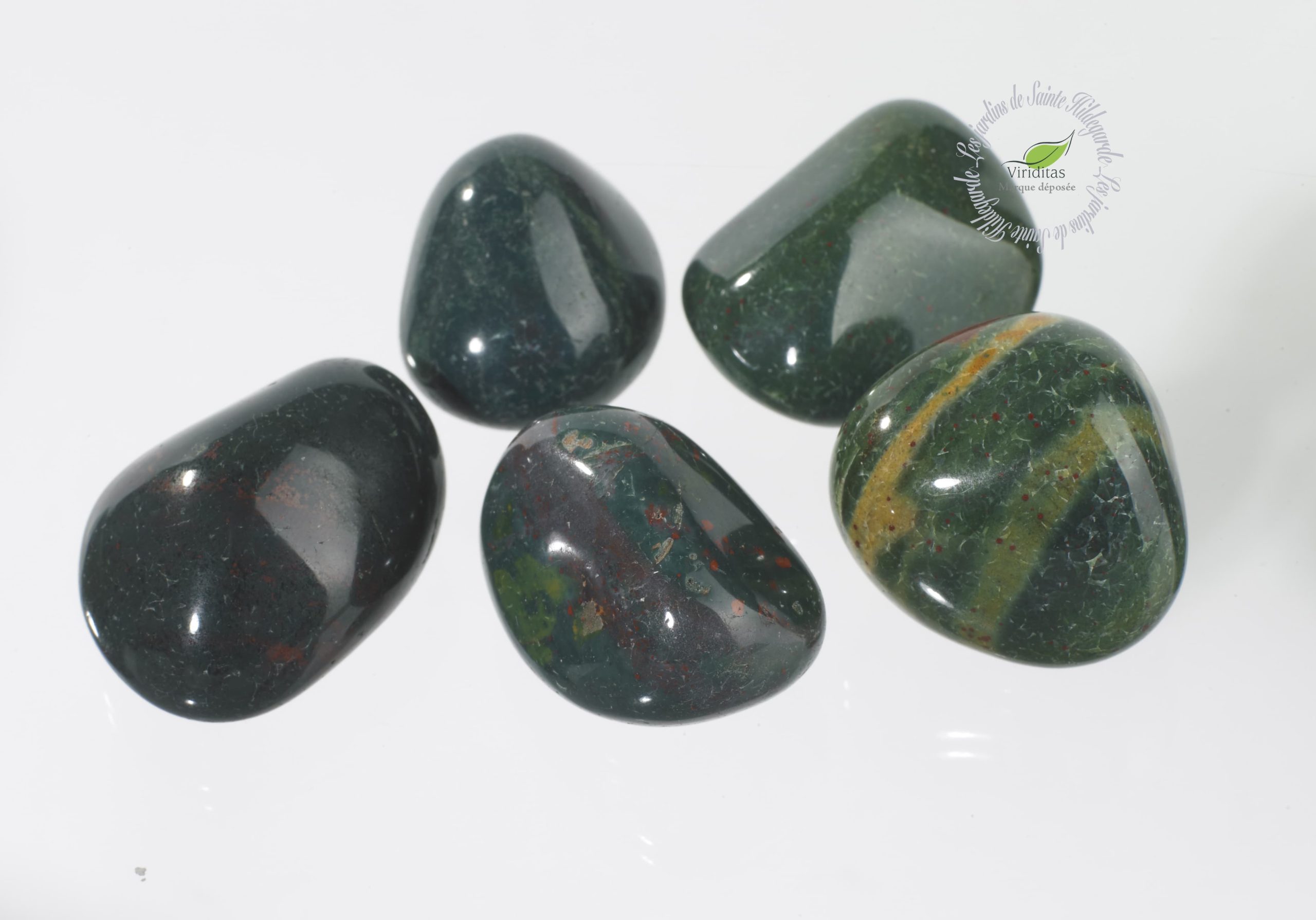 Couleurs : Vert sombre piqueté de points rouges – nuances uniques pour chaque pierre