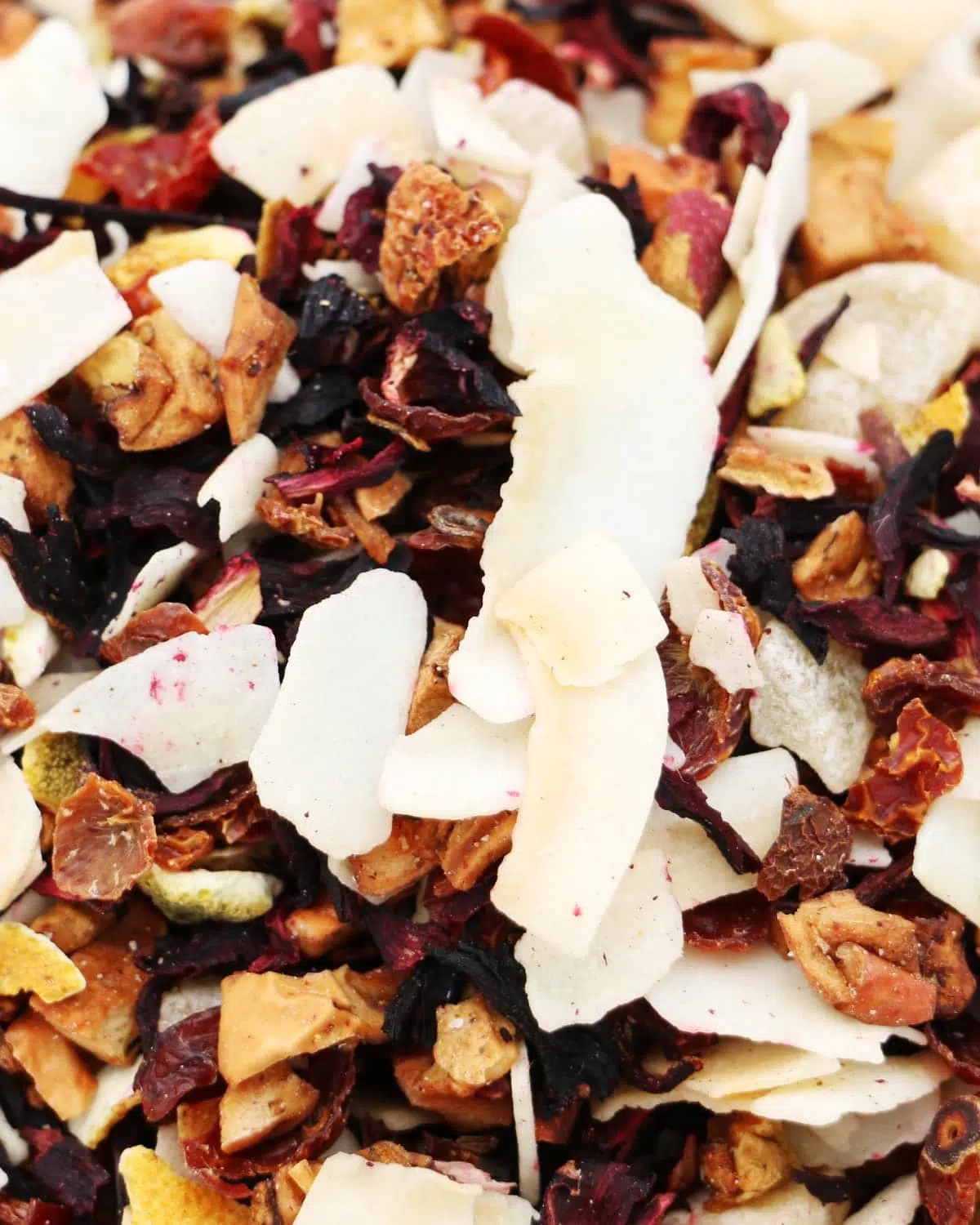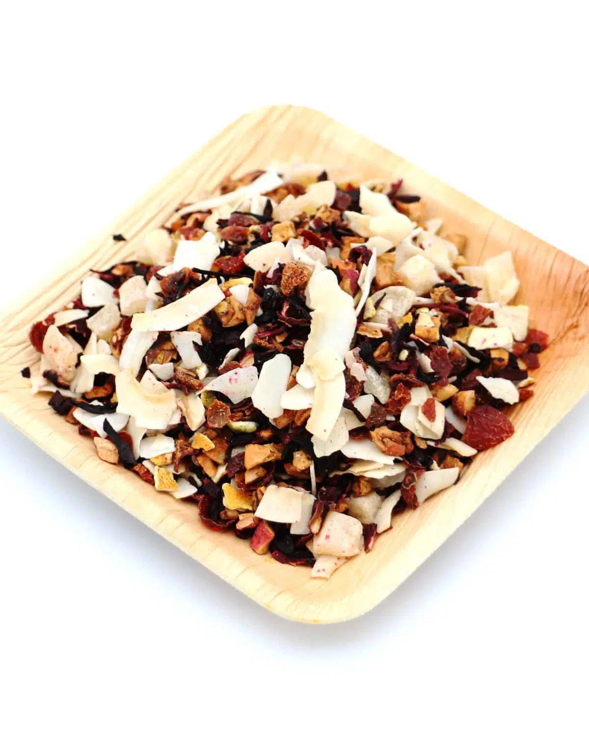 Inspirée du célèbre cocktail portoricain, cette infusion allie à merveille la douceur de la pomme avec l’exotisme de la noix de coco et de l’ananas. La fleur d’hibiscus vient souligner cette composition fruitée avec une pointe d’acidité.