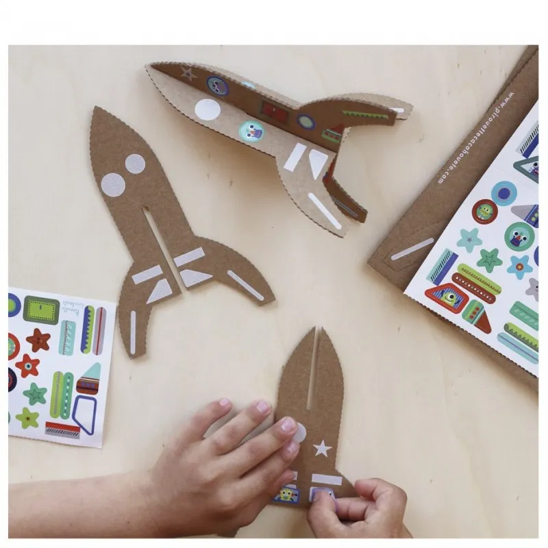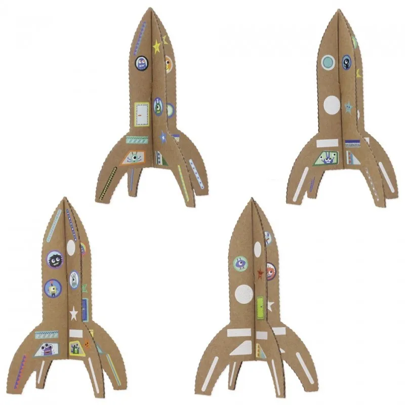 Une activité créative sans colle ni ciseaux. Juste quelques pièces de carton à assembler pour construire de vraies petites fusées. Chaque enfant pourra ensuite s’amuser à personnaliser la sienne à l’aide de stickers aux formes d’étoiles, d’hublots, de petits voyageurs venus d’une autre planète. Certains hublots blancs n’attendent plus que le coup artistique d’un crayon ou d’un feutre pour être décorés.