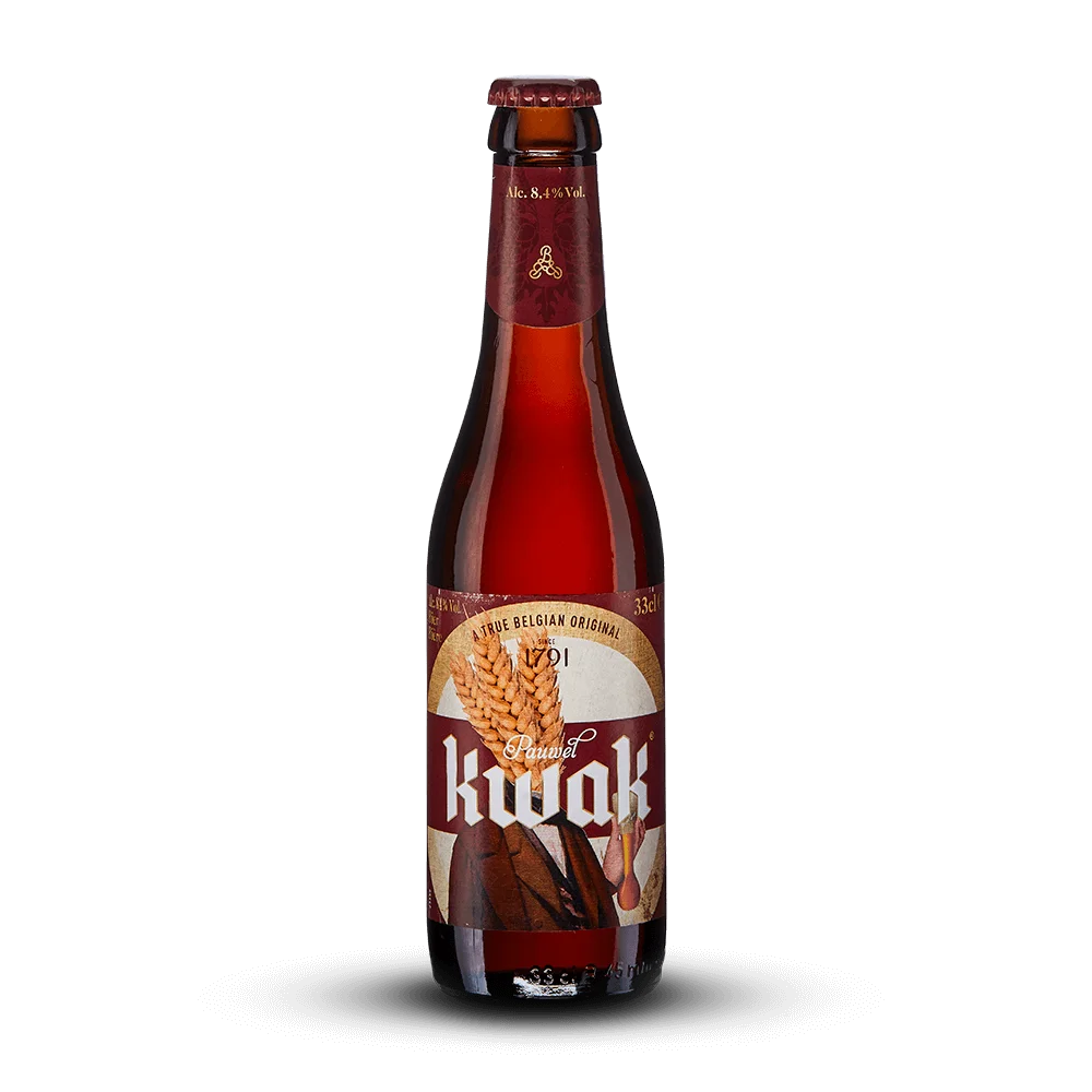 Histoire : A l’époque de Napoléon, Pauwel Kwak était brasseur et propriétaire de l’auberge ‘De Hoorn’ (Le Cor) dans la région de Termonde. Chaque jour, des diligences faisaient une pause dans cet établissement. Mais, à cette époque, les cochers ne pouvaient pas abandonner leur attelage pour étancher leur soif en compagnie des passagers. L’aubergiste inventif a donc fait souffler un verre Kwak spécial pouvant être accroché à la diligence. Les cochers avaient ainsi toujours leur bière Kwak à portée de main. Aujourd’hui, la Kwak est l’une des rares bières belges historiques restantes et elle est toujours servie dans son verre Kwak d’origine par respect de la tradition. Reconnaissable, spécial et tout aussi unique que la saveur de la bière même.