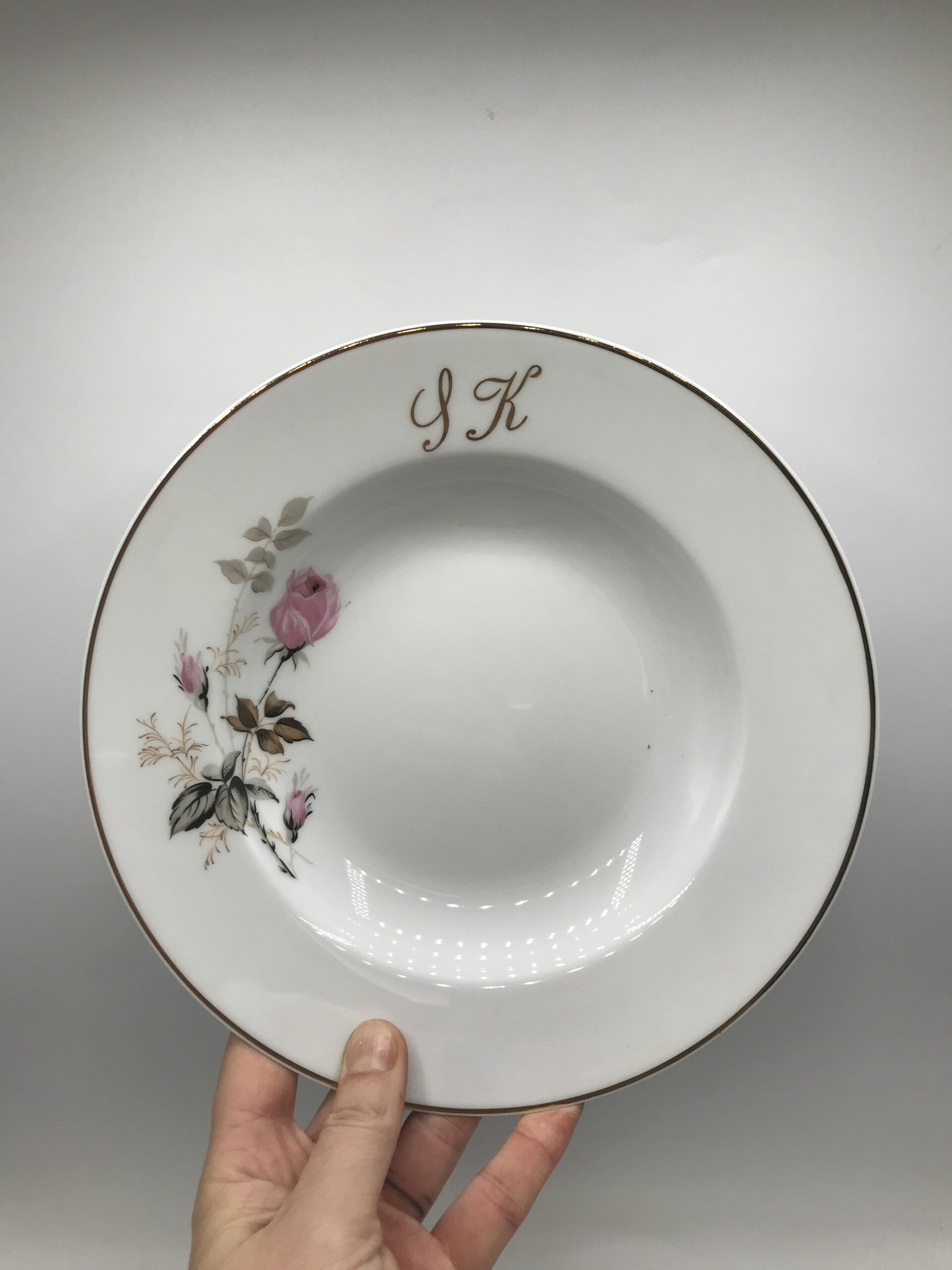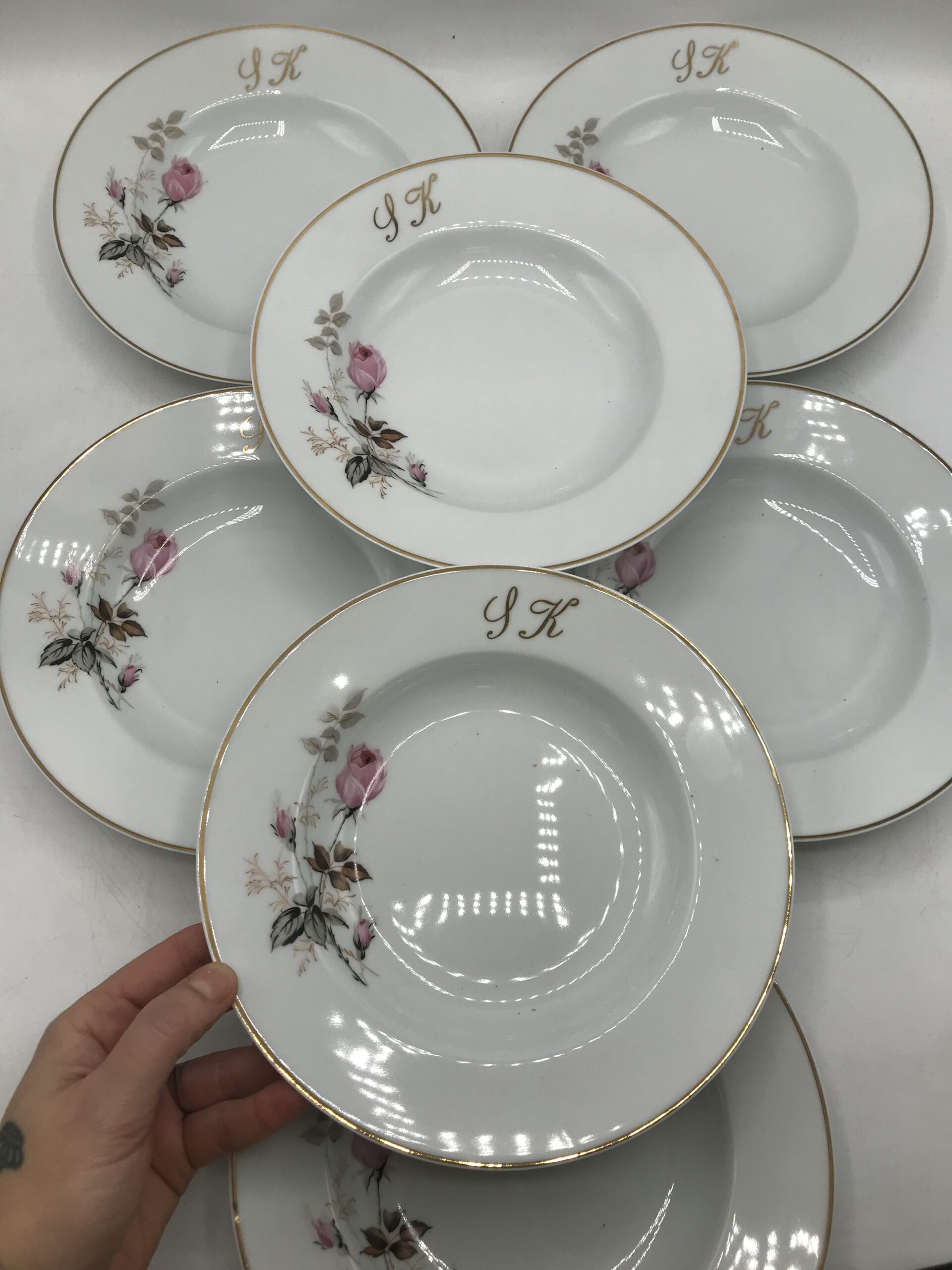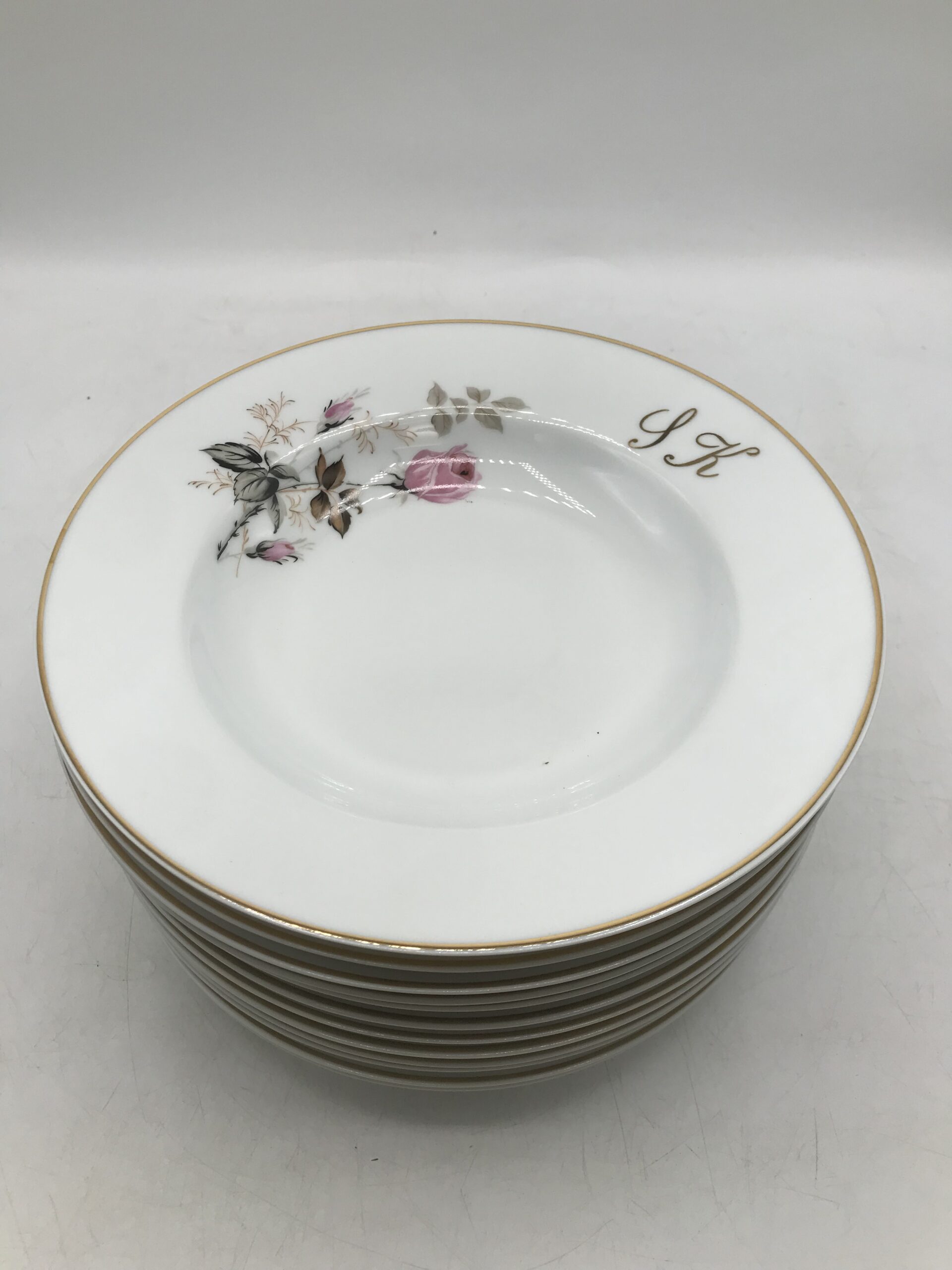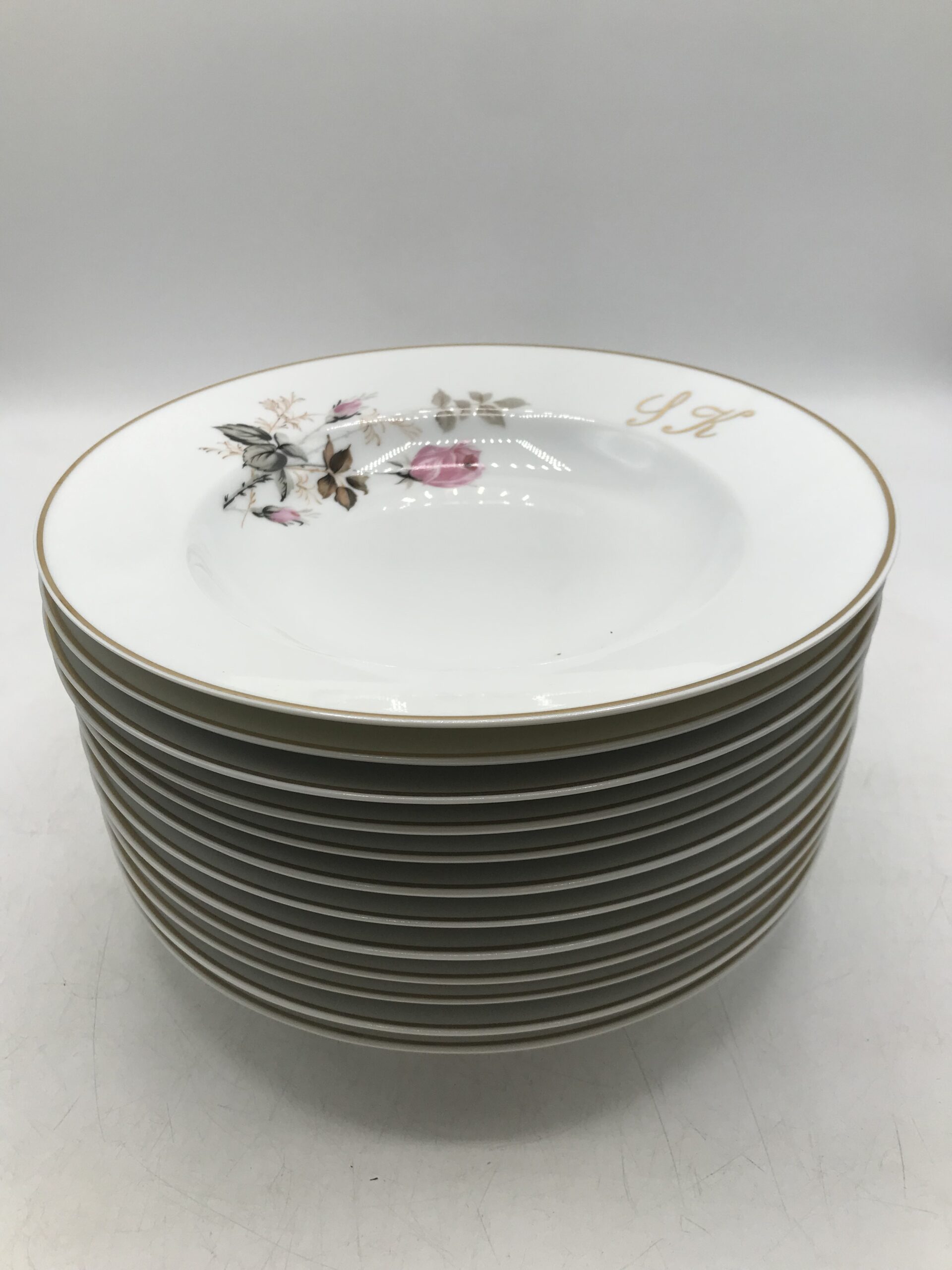 Lot 12 assiettes creuses monogrammes SK. Chineurs et amateurs de vaisselle ancienne. Cet ensemble vous plaira, il est composé de 12 assiettes creuses signées porcelaine de Limoges, elles sont en bon état général pas de casse. De petites marques d’usure sont à prévoir mais rien de bien voyant (cf photos). De belles assiettes à sortir au moment d’une bonne soupe de potimarron. Les assiettes ont un diamètre de 22,5 cm pour une hauteur de 4 cm. De couleur blanches avec une jolie illustration de boutons de roses. Un joli liseré doré vient rehausser le tout. Ces assiettes portent les monogrammes « SK ». Réunissez vos proches et amis autour d’un succulent repas, ce service apportera sa touche de finesse et viendra clôturer le tout. La vaisselle ancienne et son charme fou.