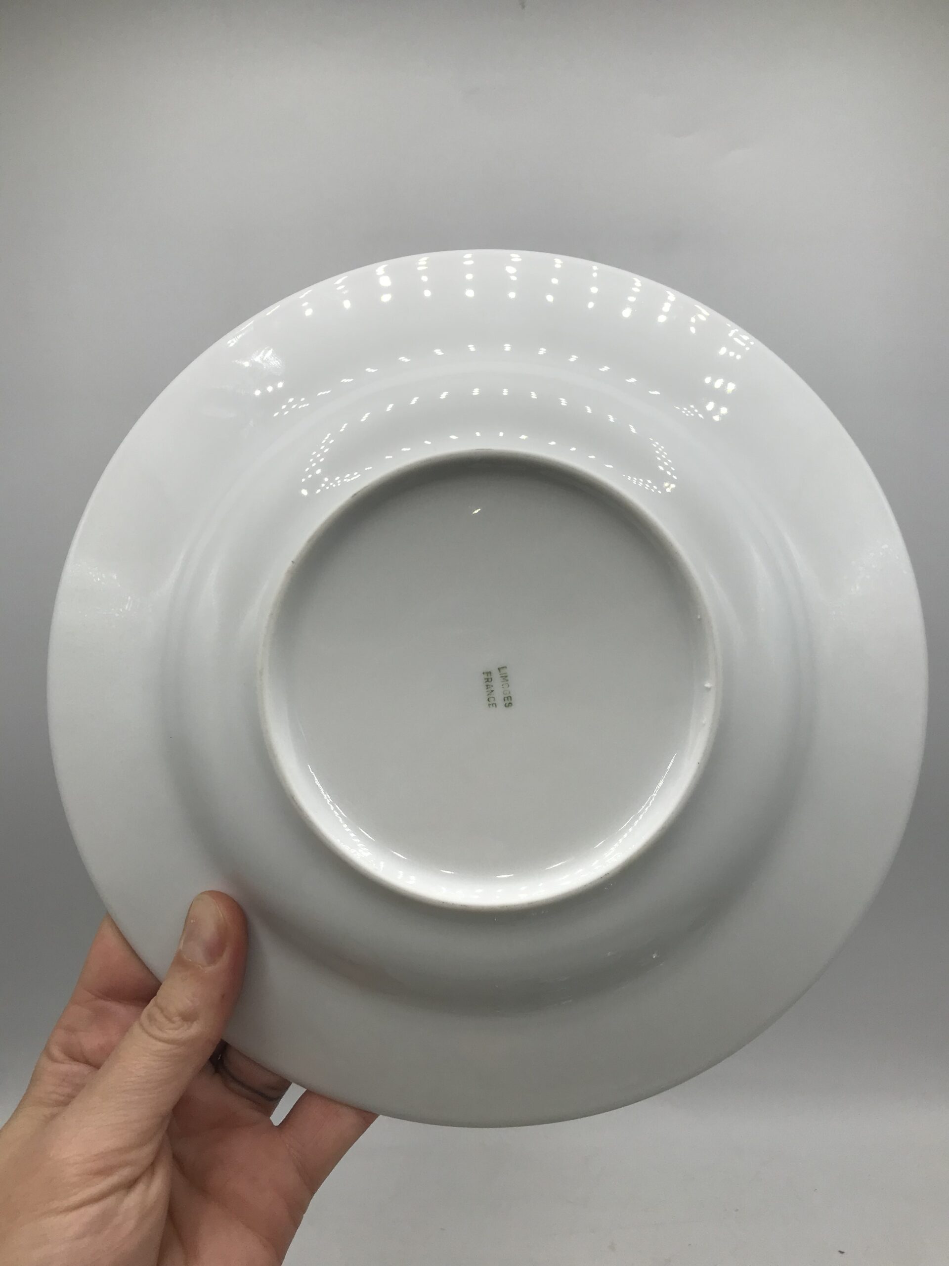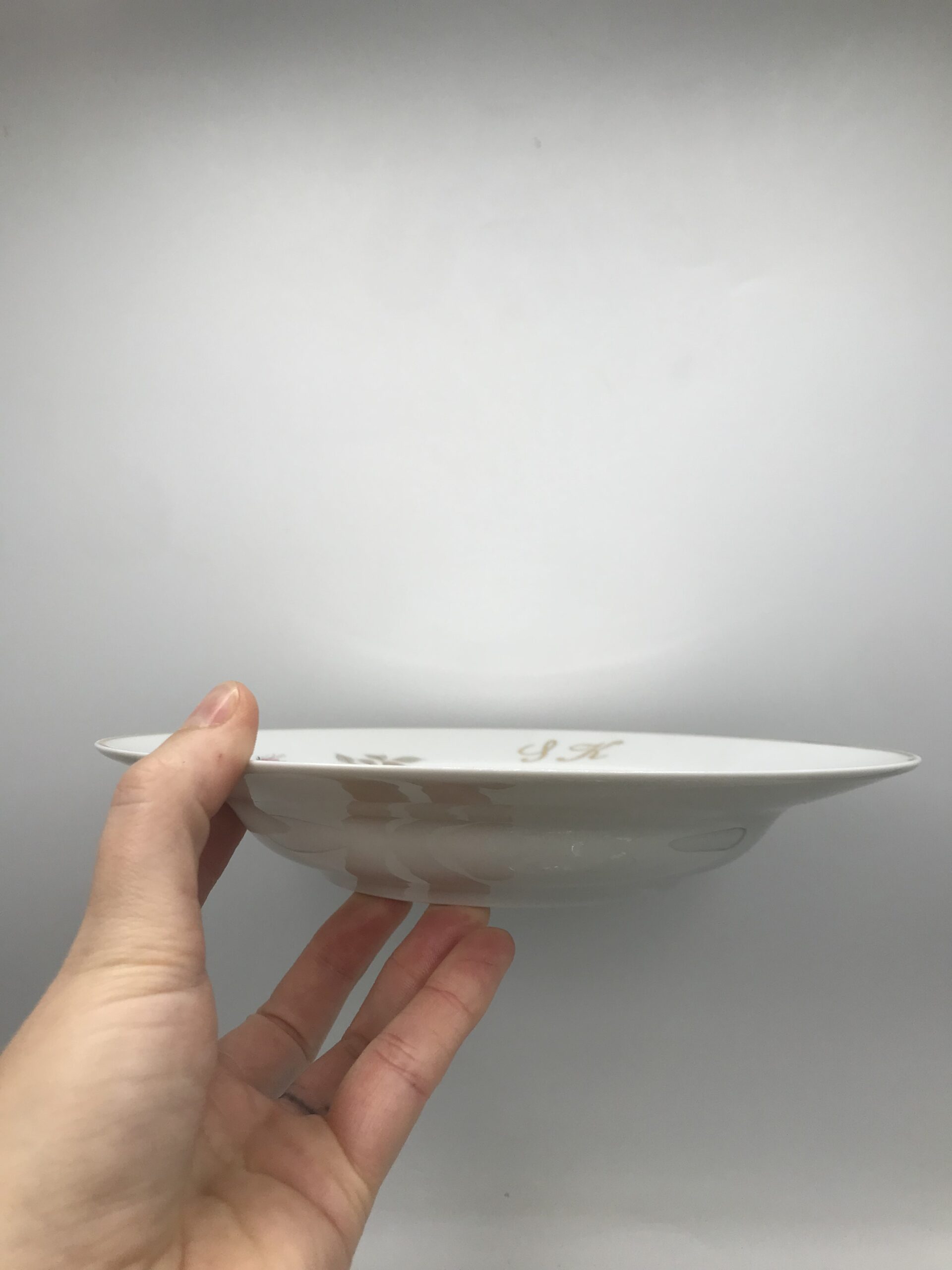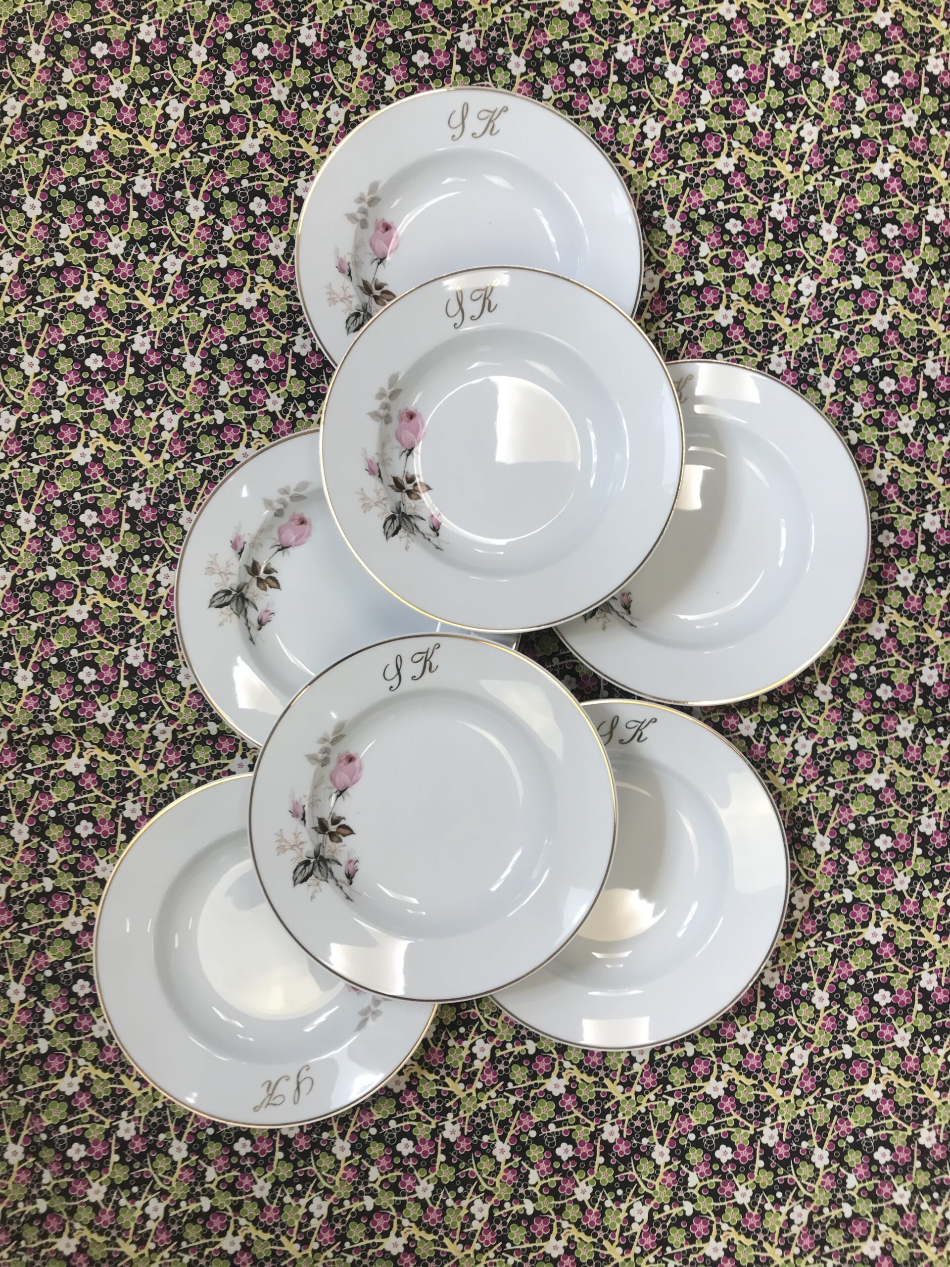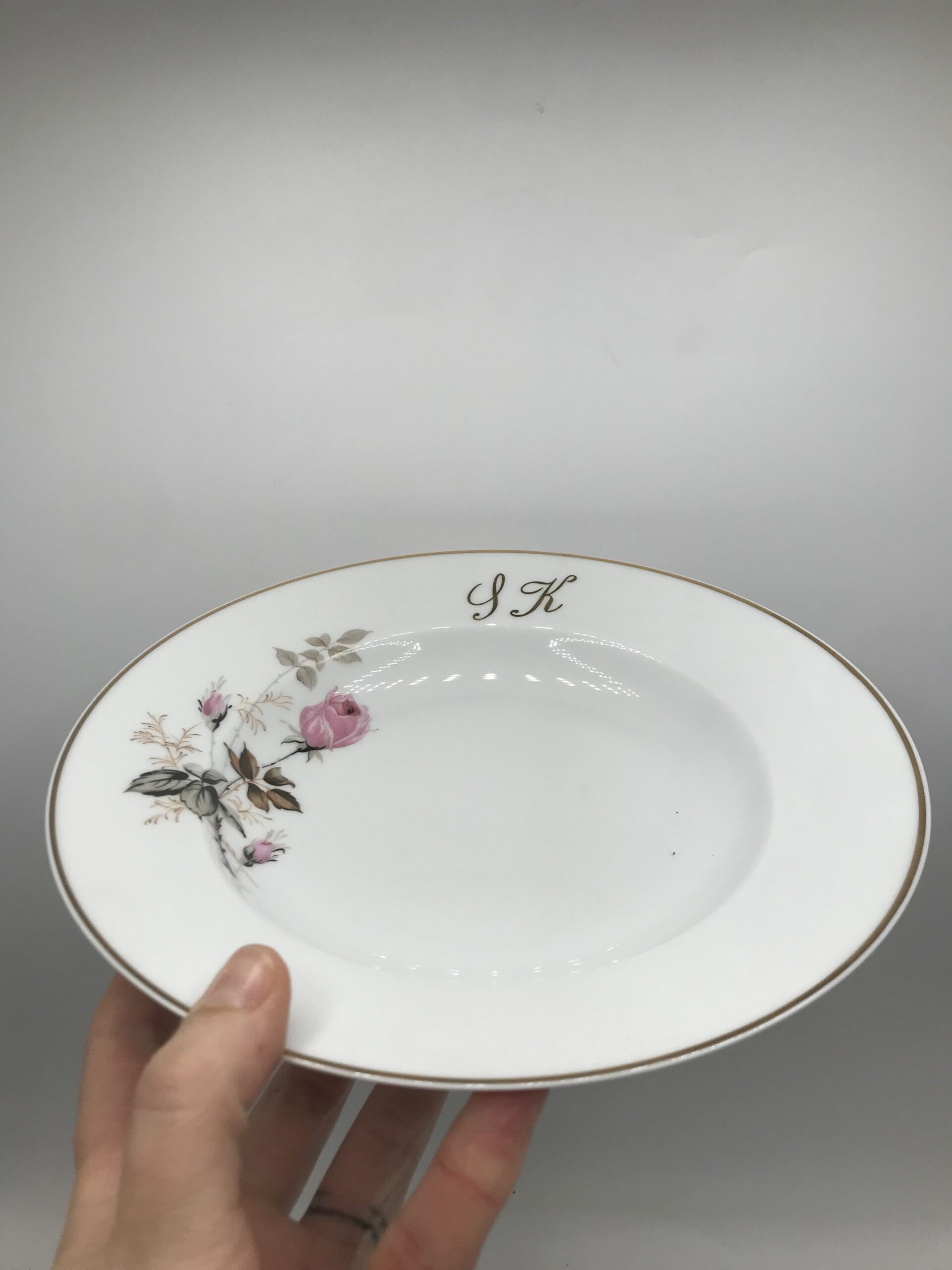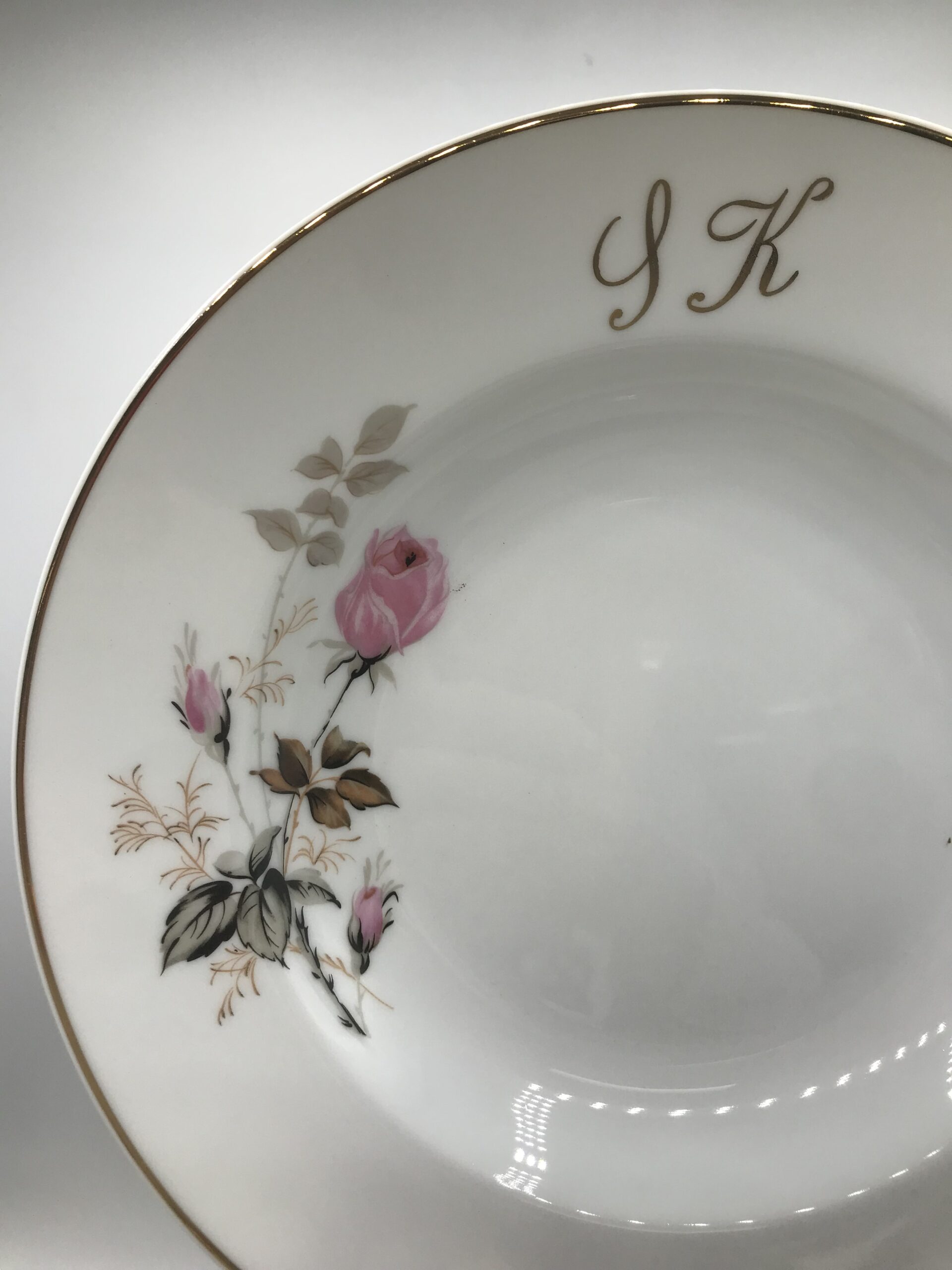 Lot 12 assiettes creuses monogrammes SK. Chineurs et amateurs de vaisselle ancienne. Cet ensemble vous plaira, il est composé de 12 assiettes creuses signées porcelaine de Limoges, elles sont en bon état général pas de casse. De petites marques d’usure sont à prévoir mais rien de bien voyant (cf photos). De belles assiettes à sortir au moment d’une bonne soupe de potimarron. Les assiettes ont un diamètre de 22,5 cm pour une hauteur de 4 cm. De couleur blanches avec une jolie illustration de boutons de roses. Un joli liseré doré vient rehausser le tout. Ces assiettes portent les monogrammes « SK ». Réunissez vos proches et amis autour d’un succulent repas, ce service apportera sa touche de finesse et viendra clôturer le tout. La vaisselle ancienne et son charme fou.