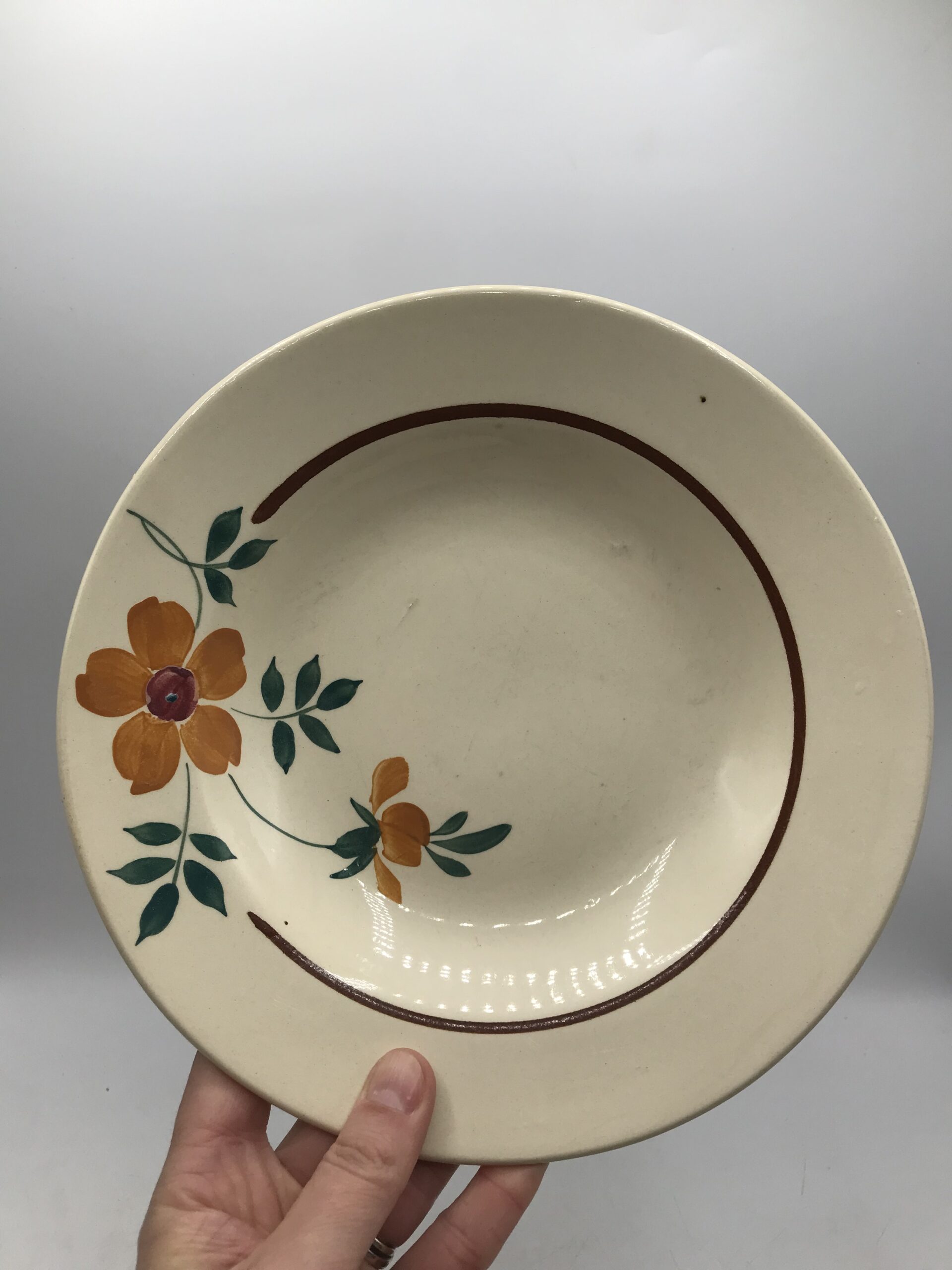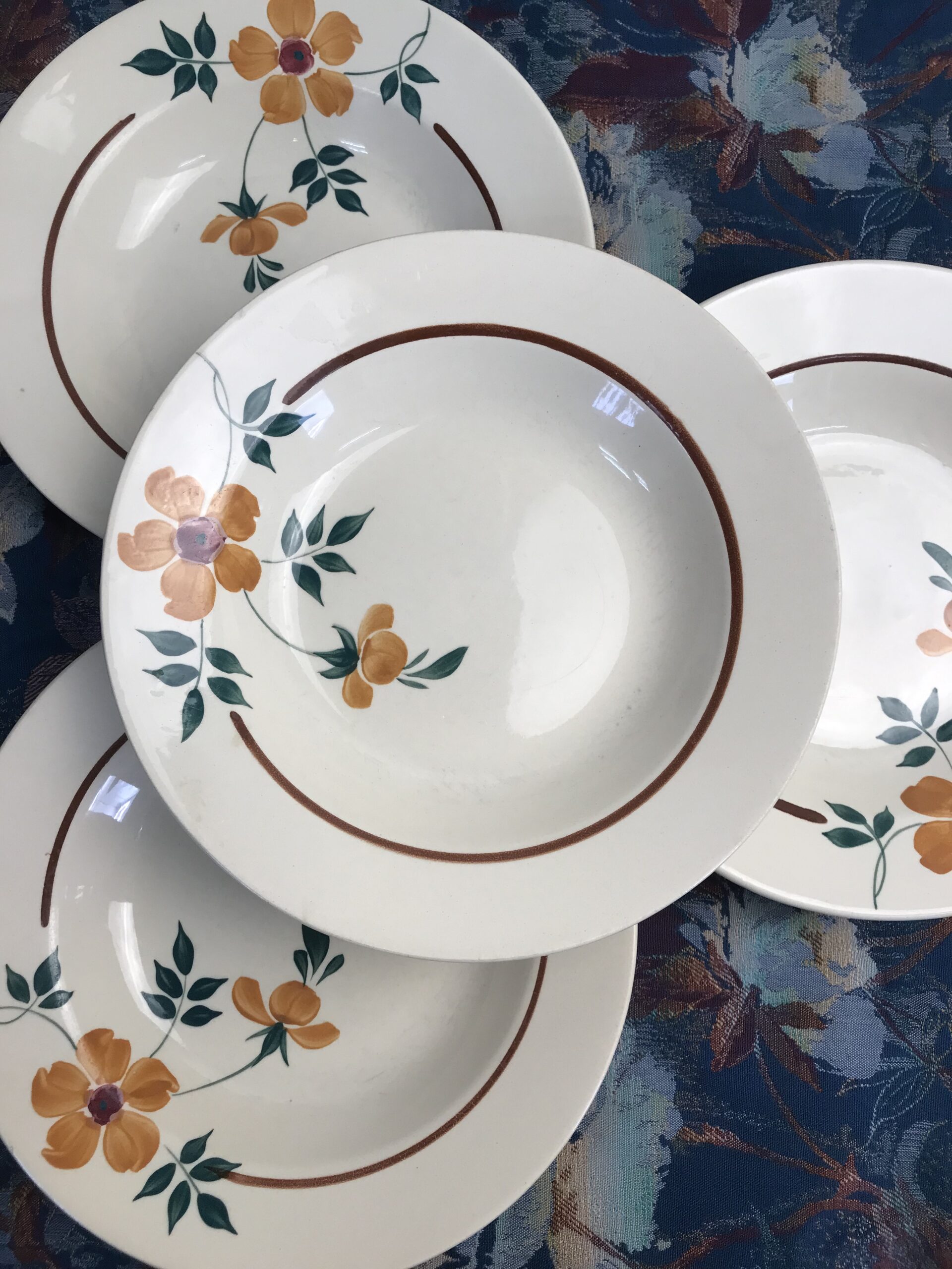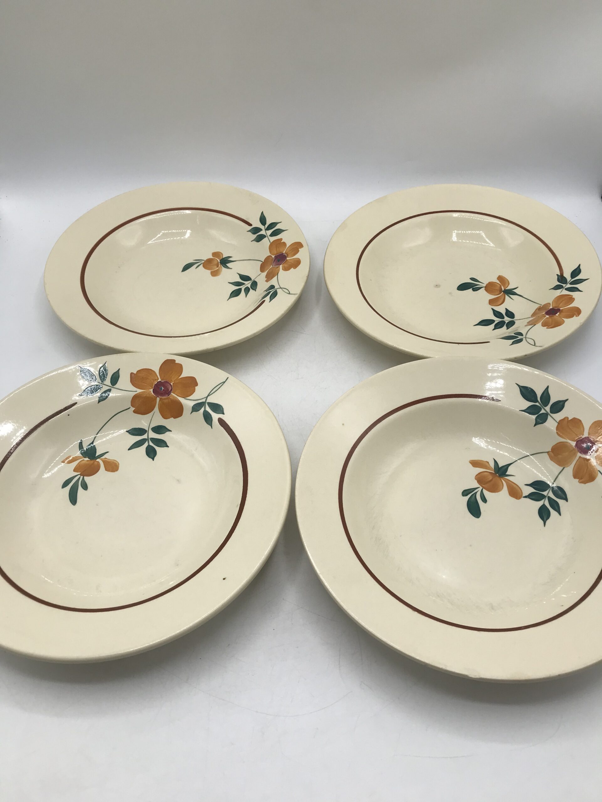 Lot de 4 assiettes creuses St Amand « Amélie ». Superbe lot de 4 assiettes creuses, elles ont un diamètre de 23 cm pour une hauteur de 4 cm. Magnifique modèle de la collection « Amélie », cette série représente des fleurs de couleur orange. Magnifique motifs vintage de vaisselle ancienne. Les assiettes portent quelques points de patine, deux portent un éclat sur le bord (cf photos). Magnifique vaisselle ancienne de chez Moulin des loups. Pour les amoureux de vaisselle signée vous aller fondre.