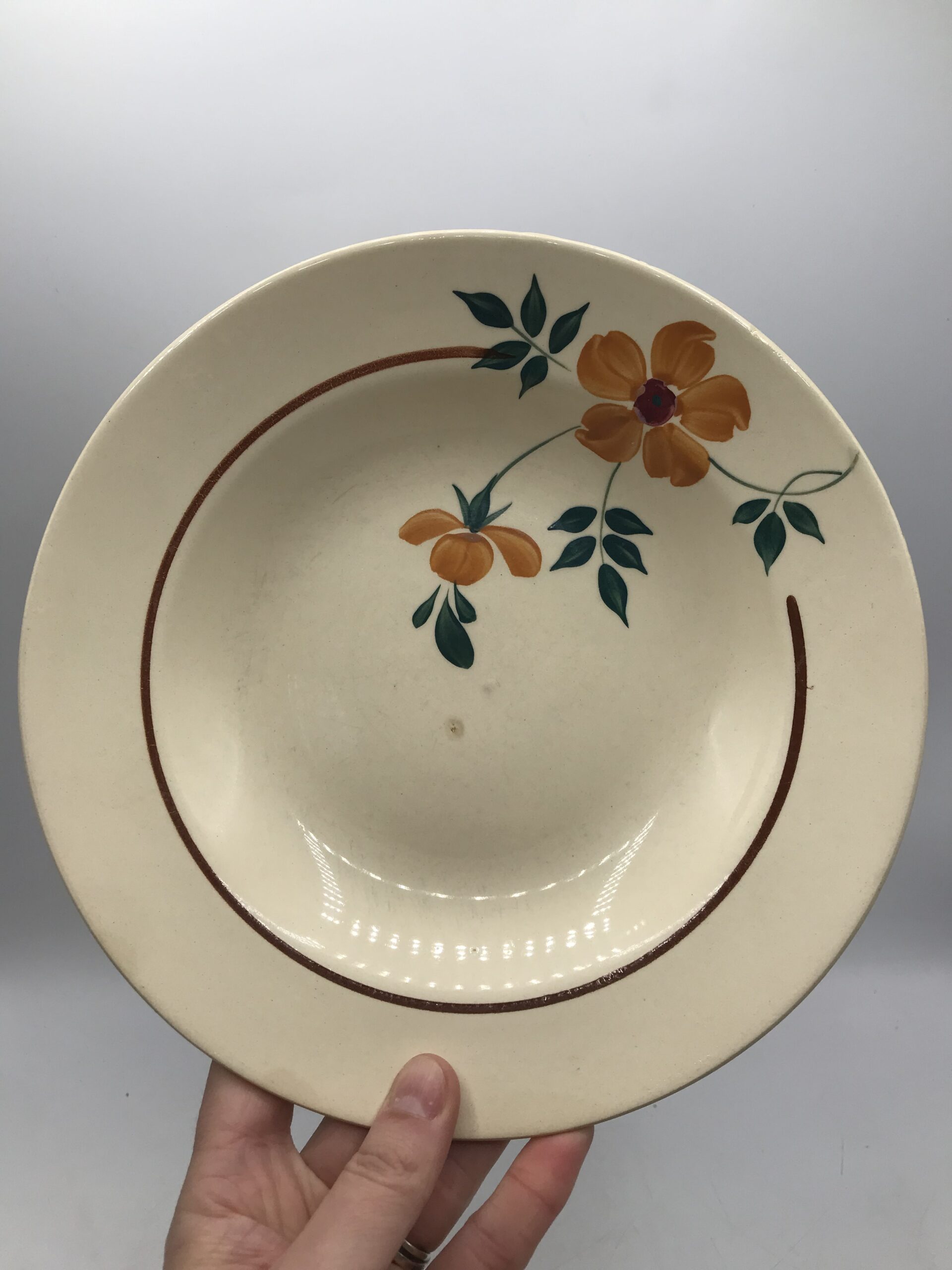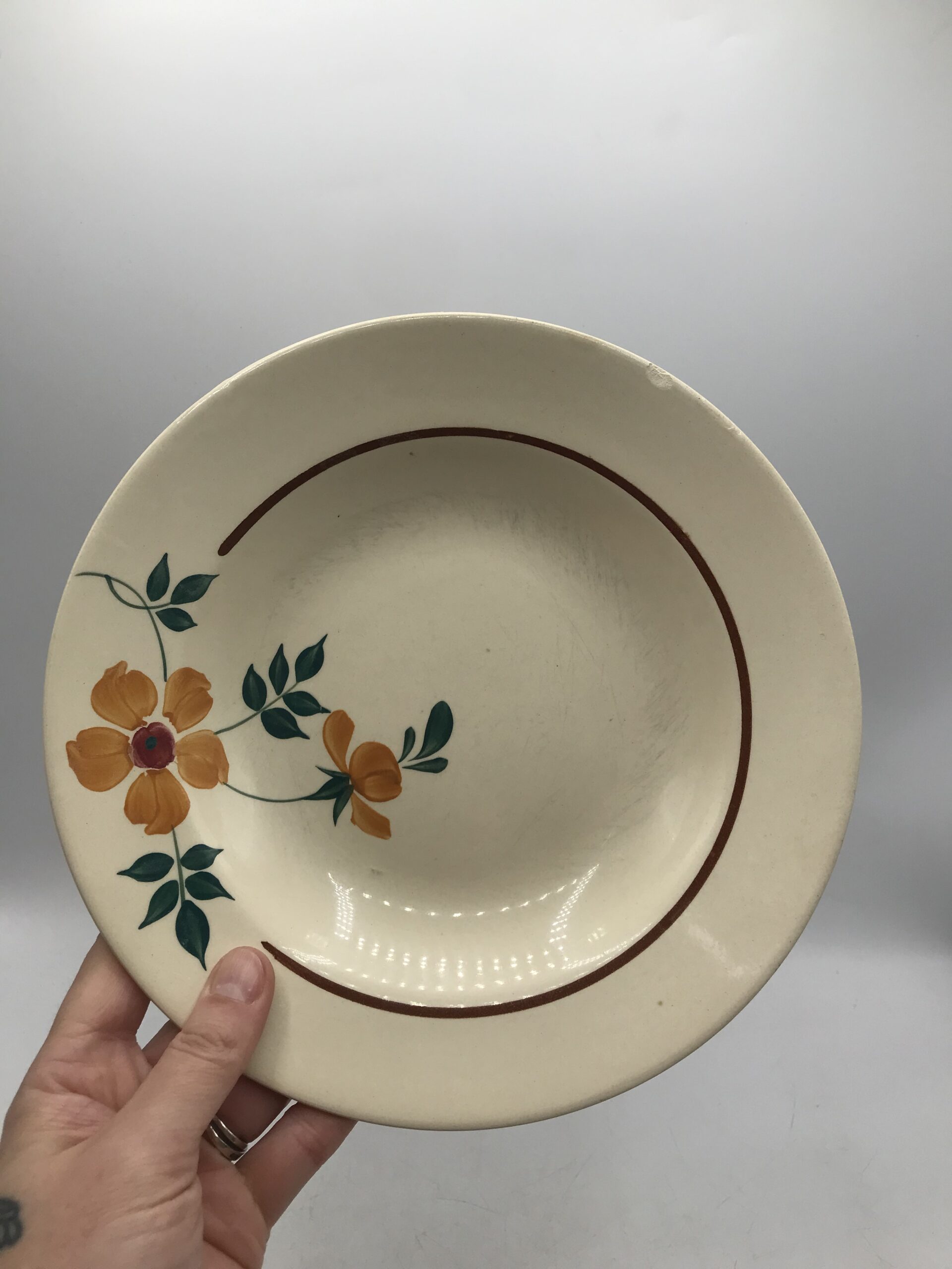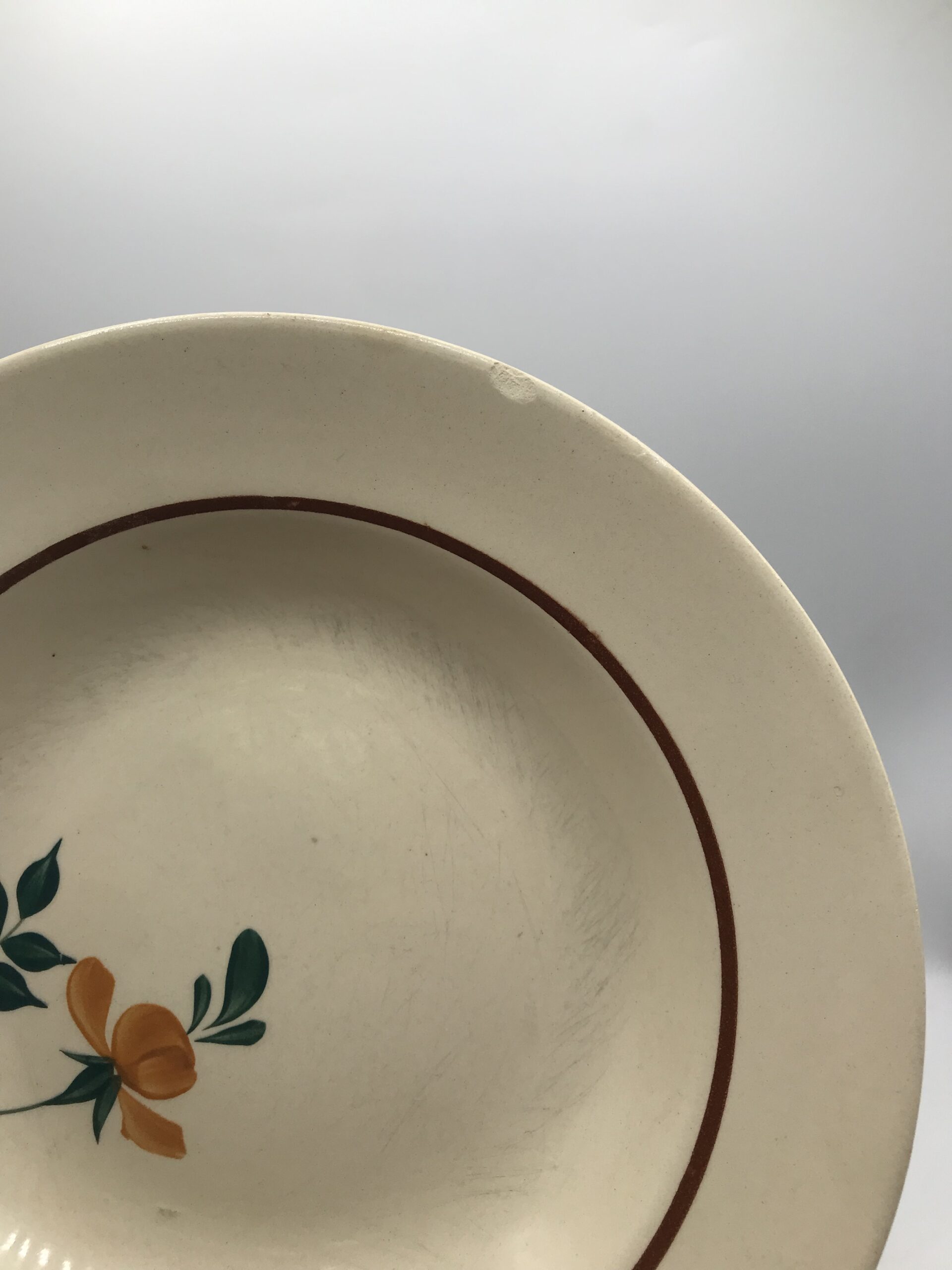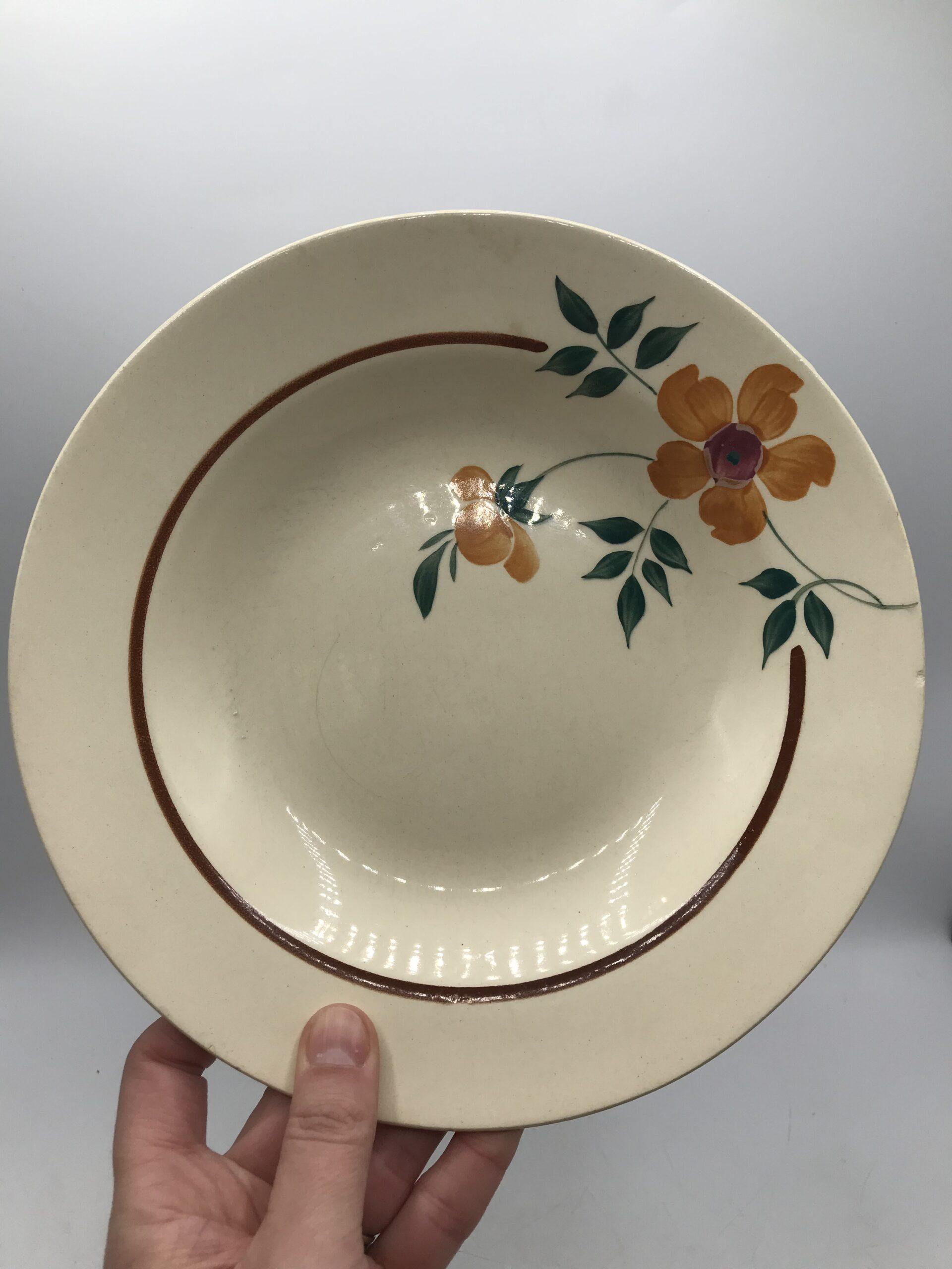 Lot de 4 assiettes creuses St Amand « Amélie ». Superbe lot de 4 assiettes creuses, elles ont un diamètre de 23 cm pour une hauteur de 4 cm. Magnifique modèle de la collection « Amélie », cette série représente des fleurs de couleur orange. Magnifique motifs vintage de vaisselle ancienne. Les assiettes portent quelques points de patine, deux portent un éclat sur le bord (cf photos). Magnifique vaisselle ancienne de chez Moulin des loups. Pour les amoureux de vaisselle signée vous aller fondre.