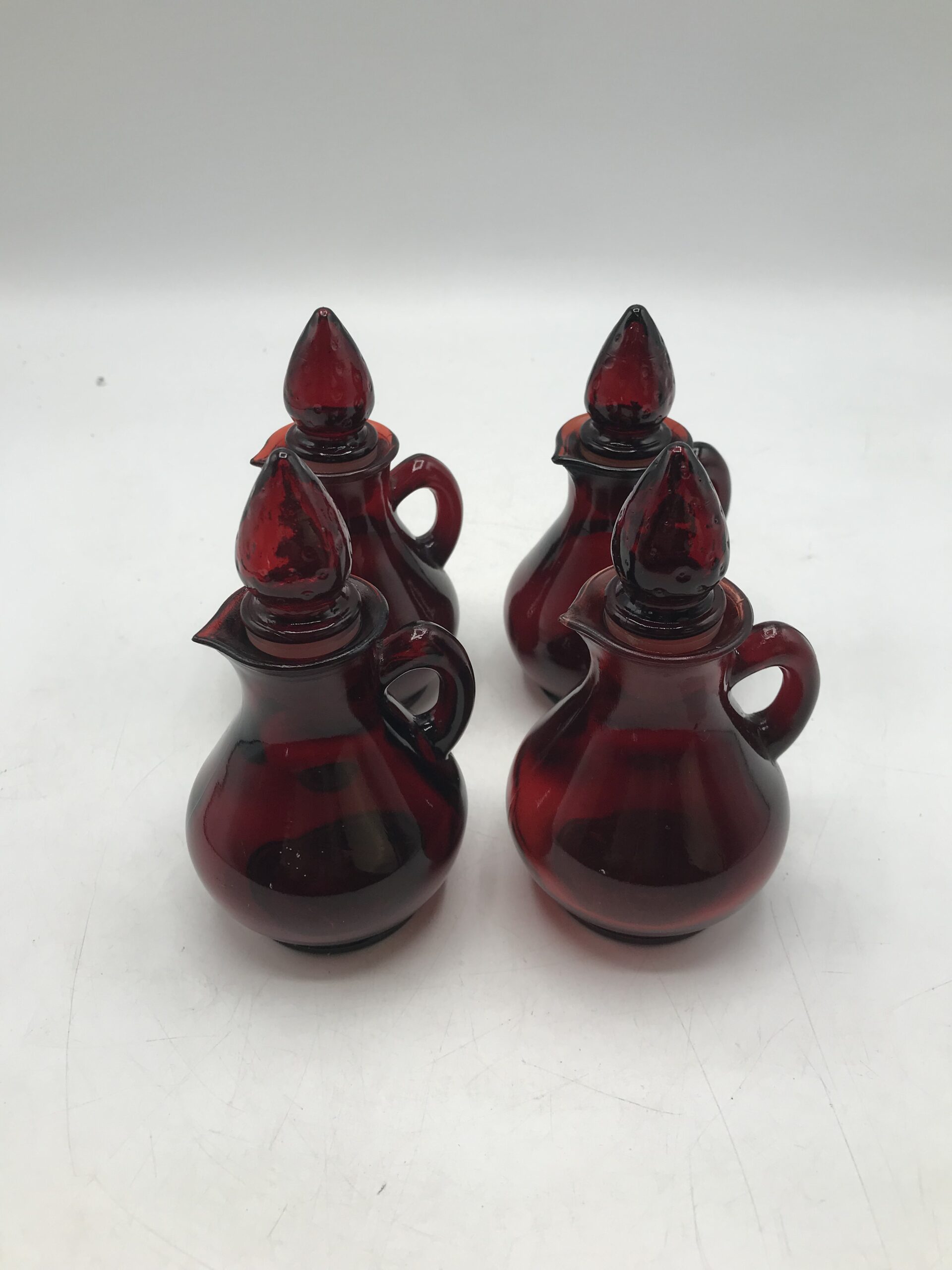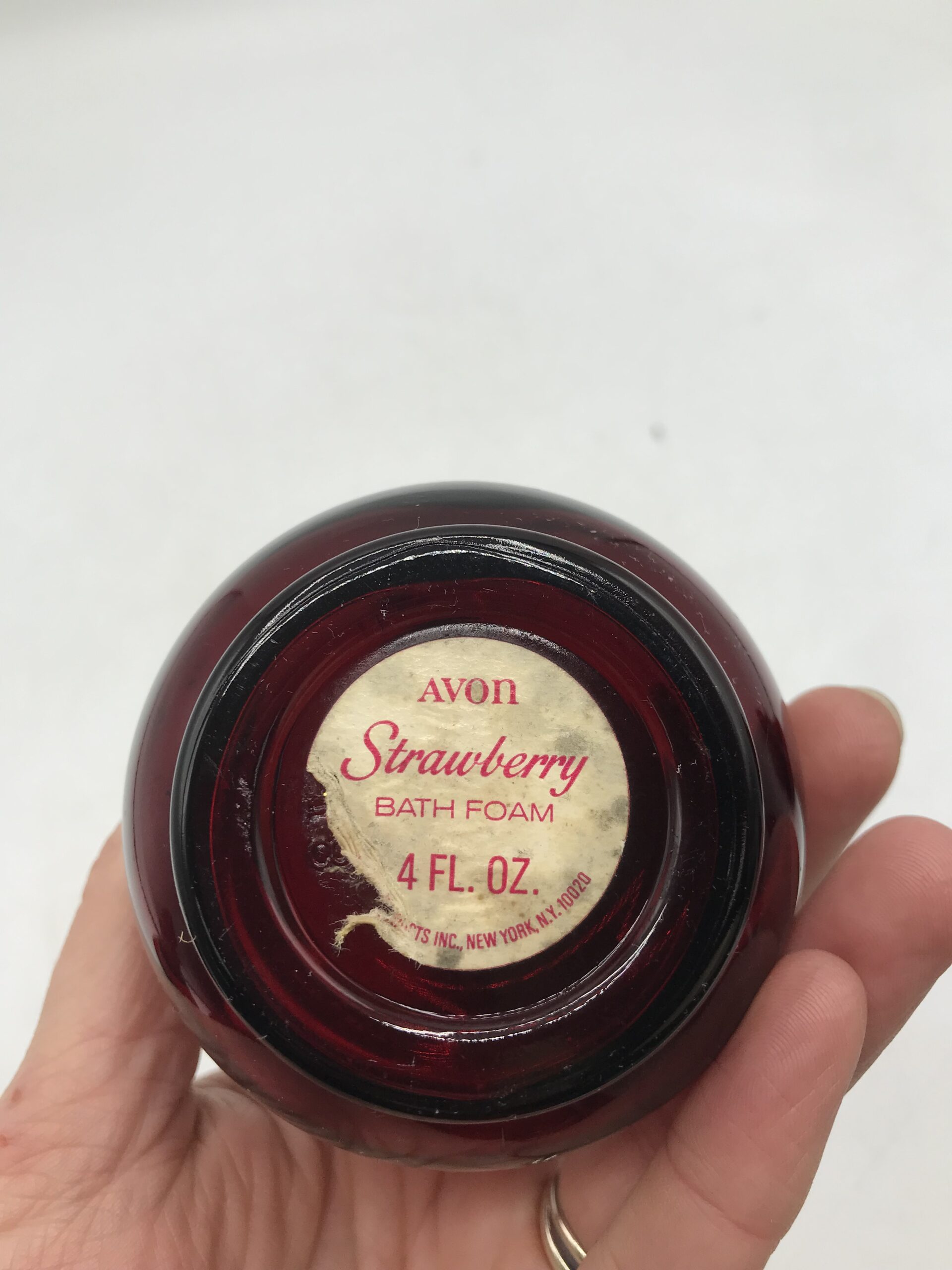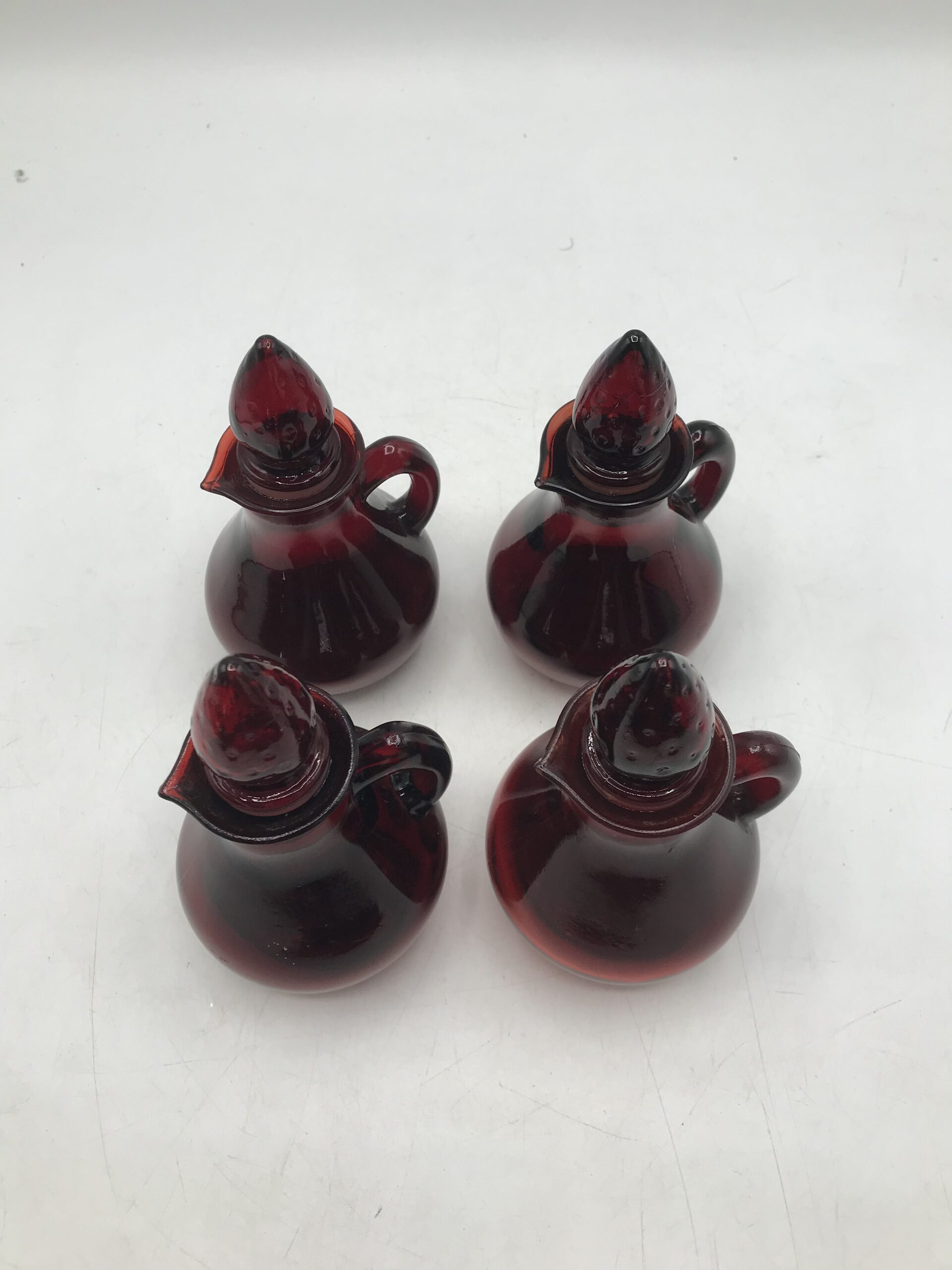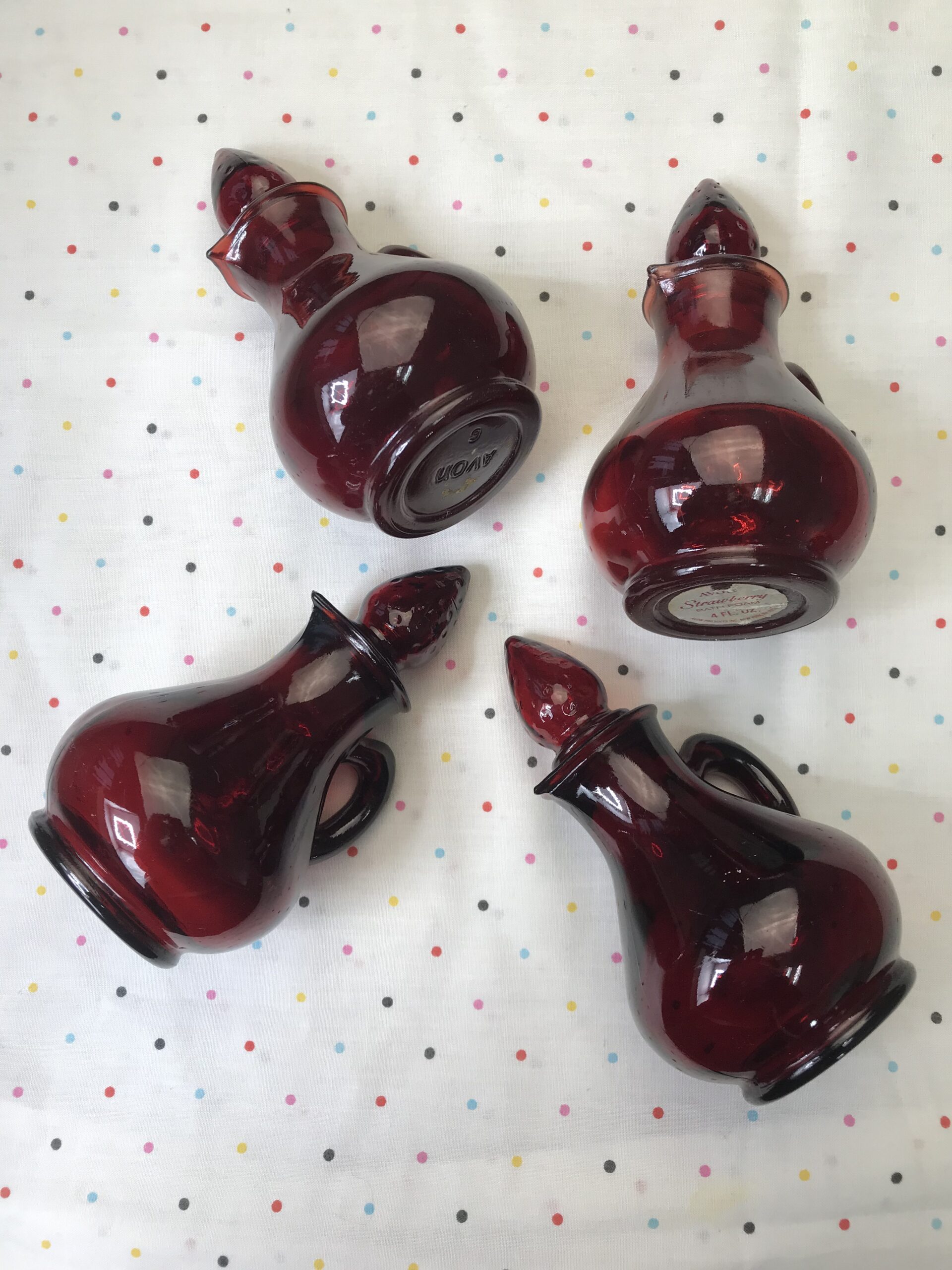 Lot de 4 petits flacons rouge en verre. Produits promotionnels de la marque AVON, modèle Strawberry, contenance 4FL OZ. Petites merveilles que sont ces flacons. Ils arborent tous un petit bouchon en forme de fraise plus que craquant. Un petit ensemble pour décorer sa salle de bain. Belle note de déco vintage pleine de charme et de douceur. Les flacons sont dans un très bon état. Avis aux amateurs ou collectionneurs de la marque AVON.