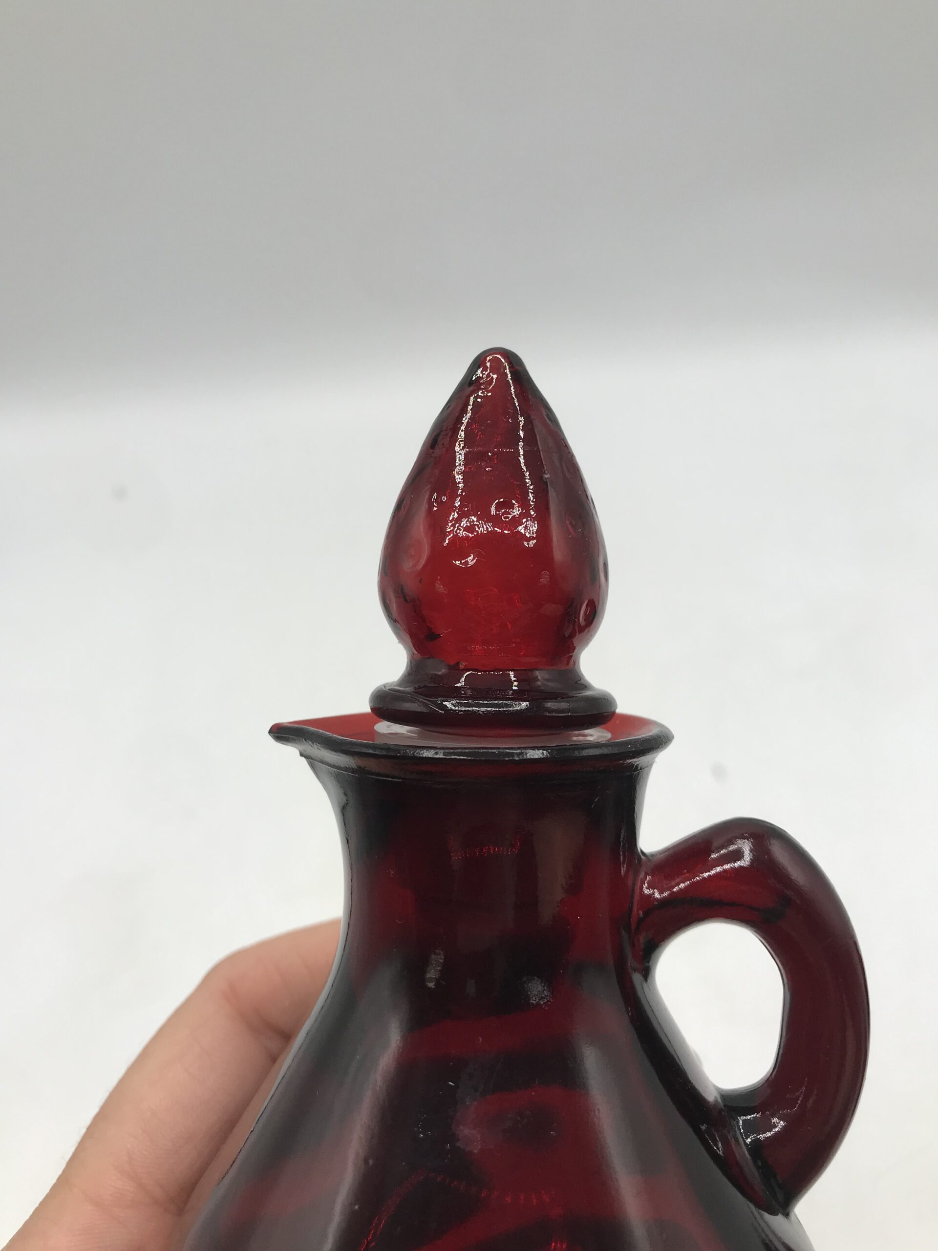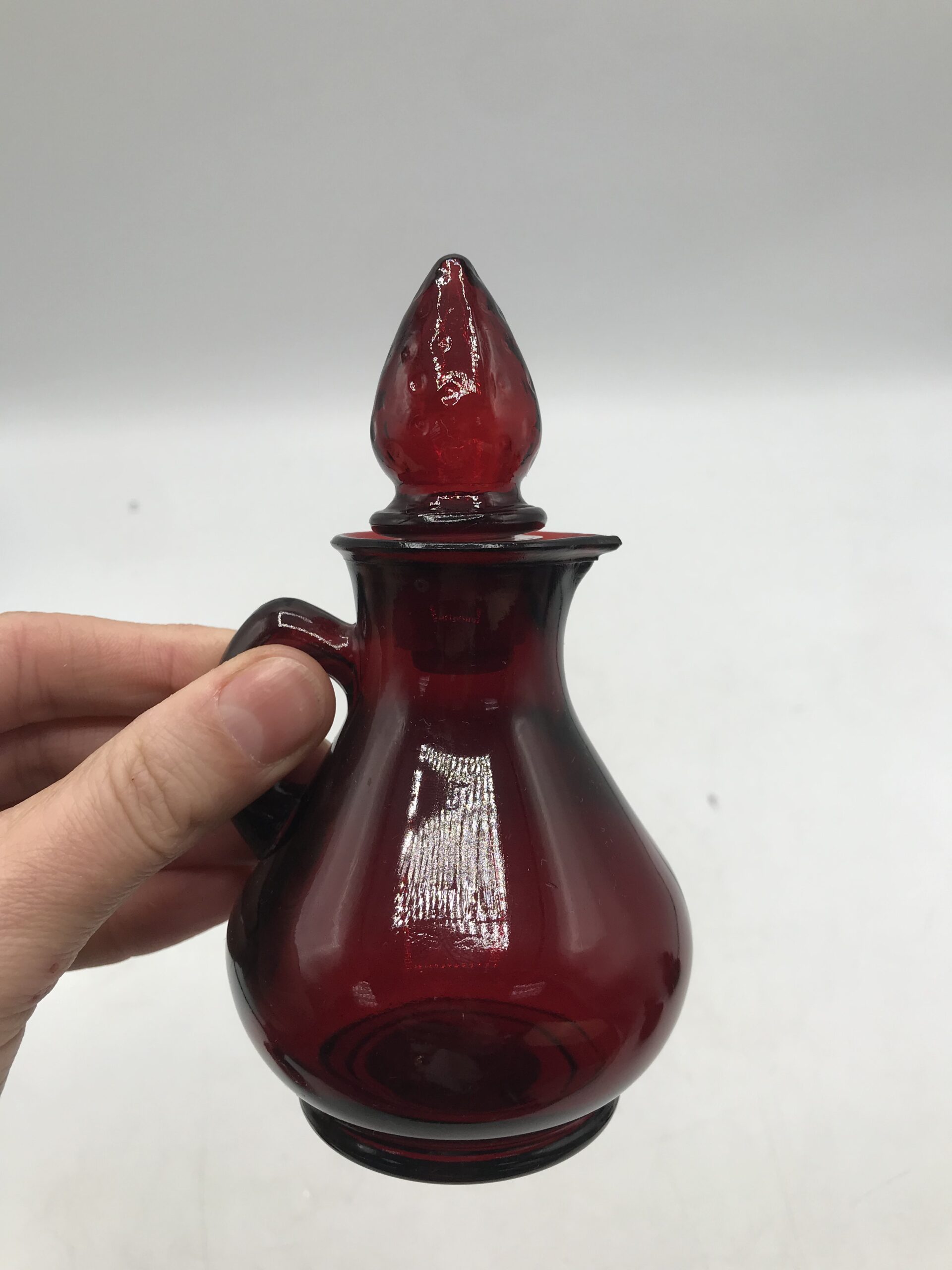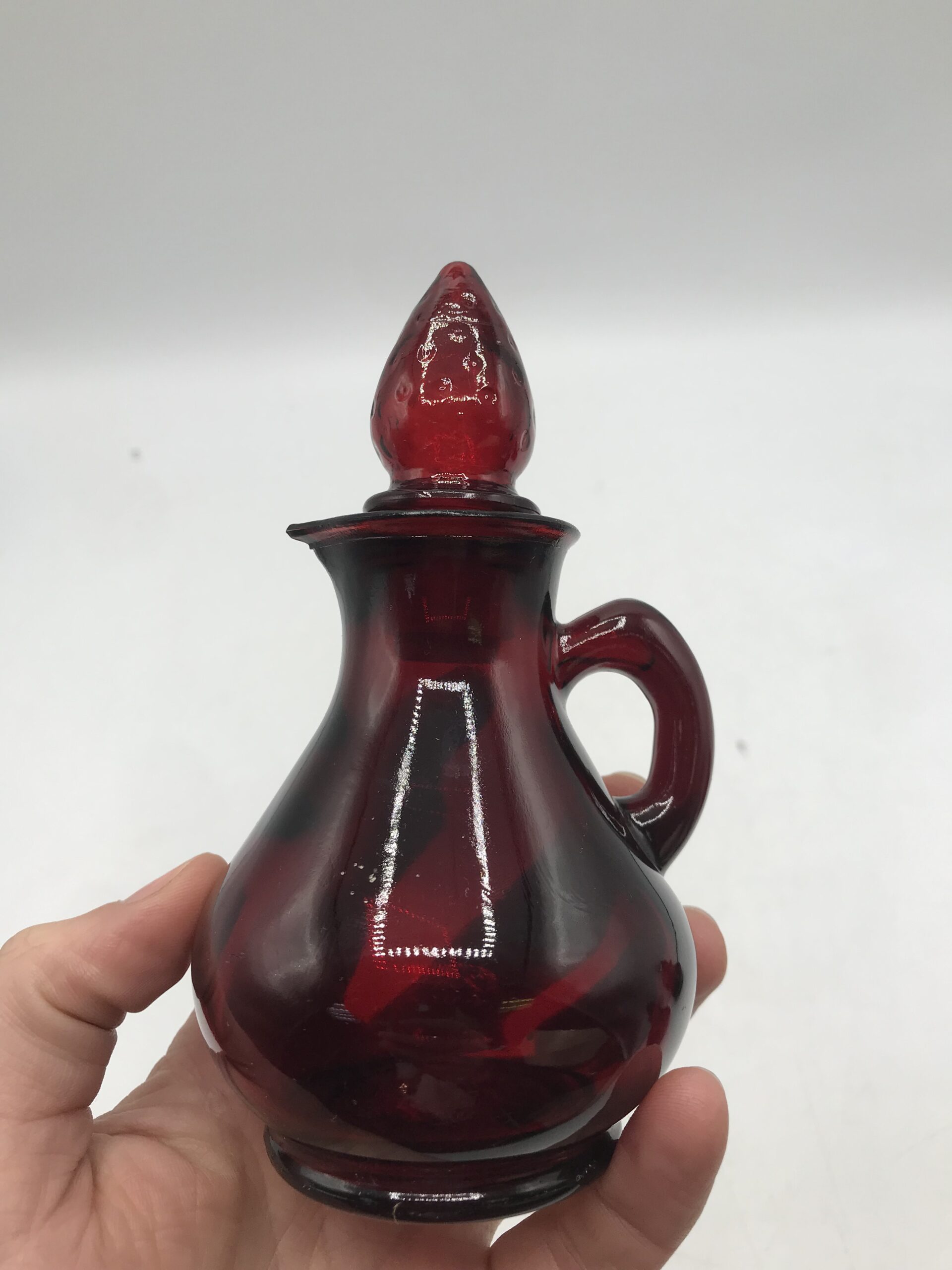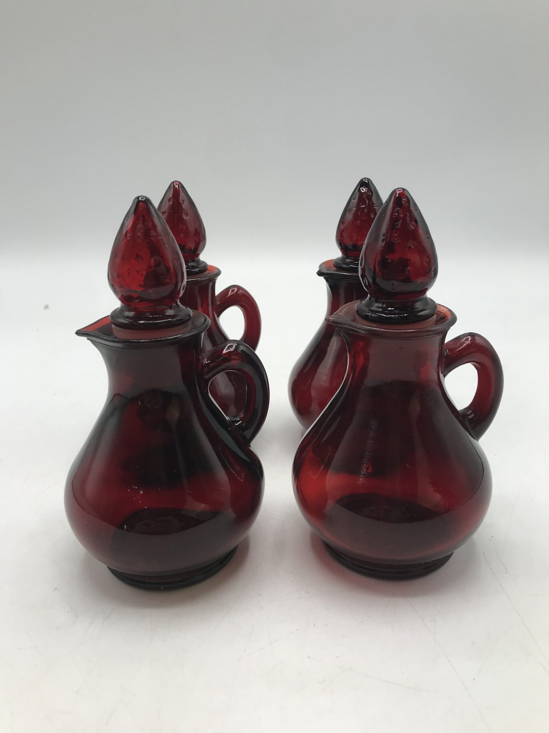 Lot de 4 petits flacons rouge en verre. Produits promotionnels de la marque AVON, modèle Strawberry, contenance 4FL OZ. Petites merveilles que sont ces flacons. Ils arborent tous un petit bouchon en forme de fraise plus que craquant. Un petit ensemble pour décorer sa salle de bain. Belle note de déco vintage pleine de charme et de douceur. Les flacons sont dans un très bon état. Avis aux amateurs ou collectionneurs de la marque AVON.