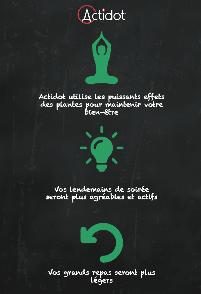 Actidot® est la boisson suisse originale de récupération. Sa formulation aide de manière efficace et naturelle votre corps comme votre esprit à vous sentir mieux et actif après un événement festif.