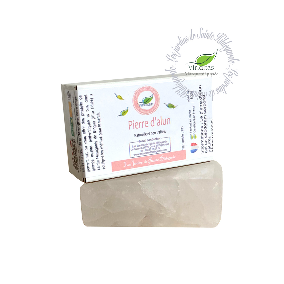 100% Alun de potassium naturel, extrait de carrière d’alunite, garantie sans chlorhydrates d’aluminium.