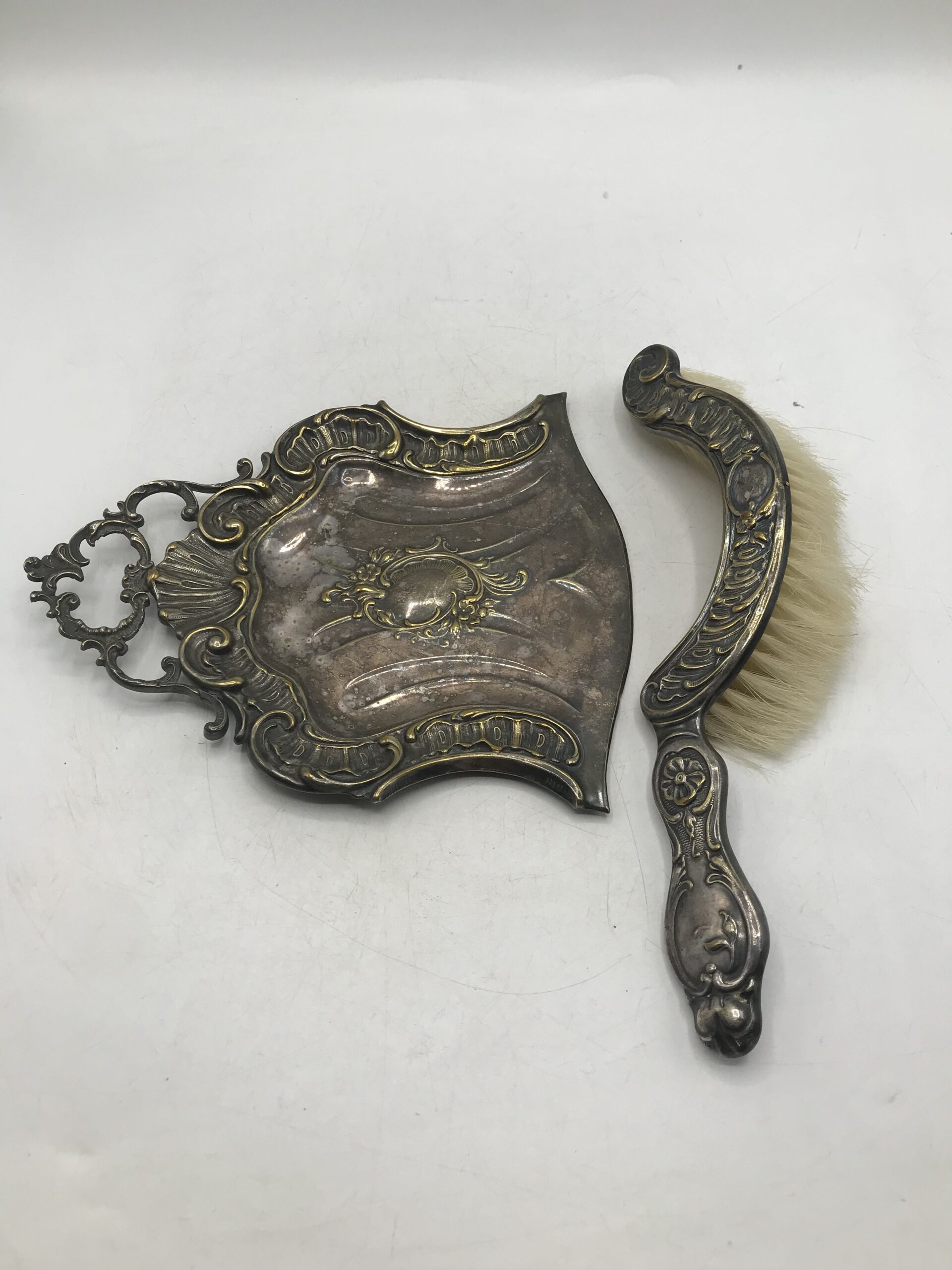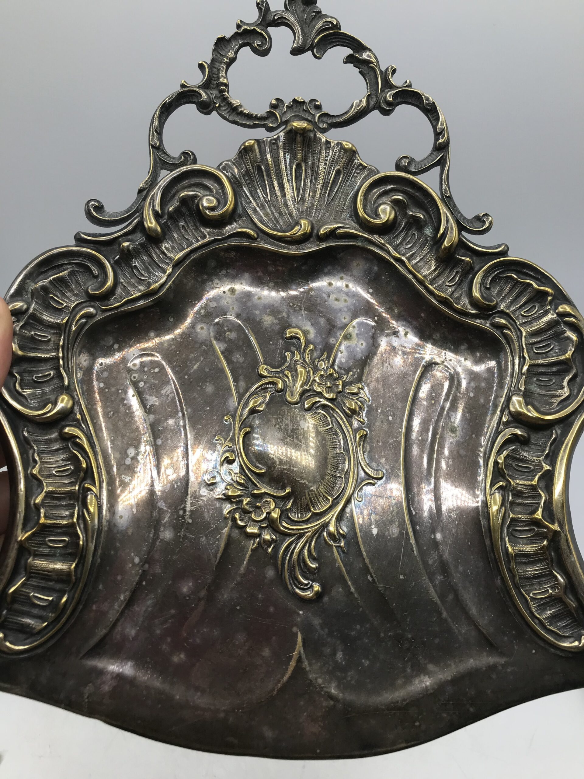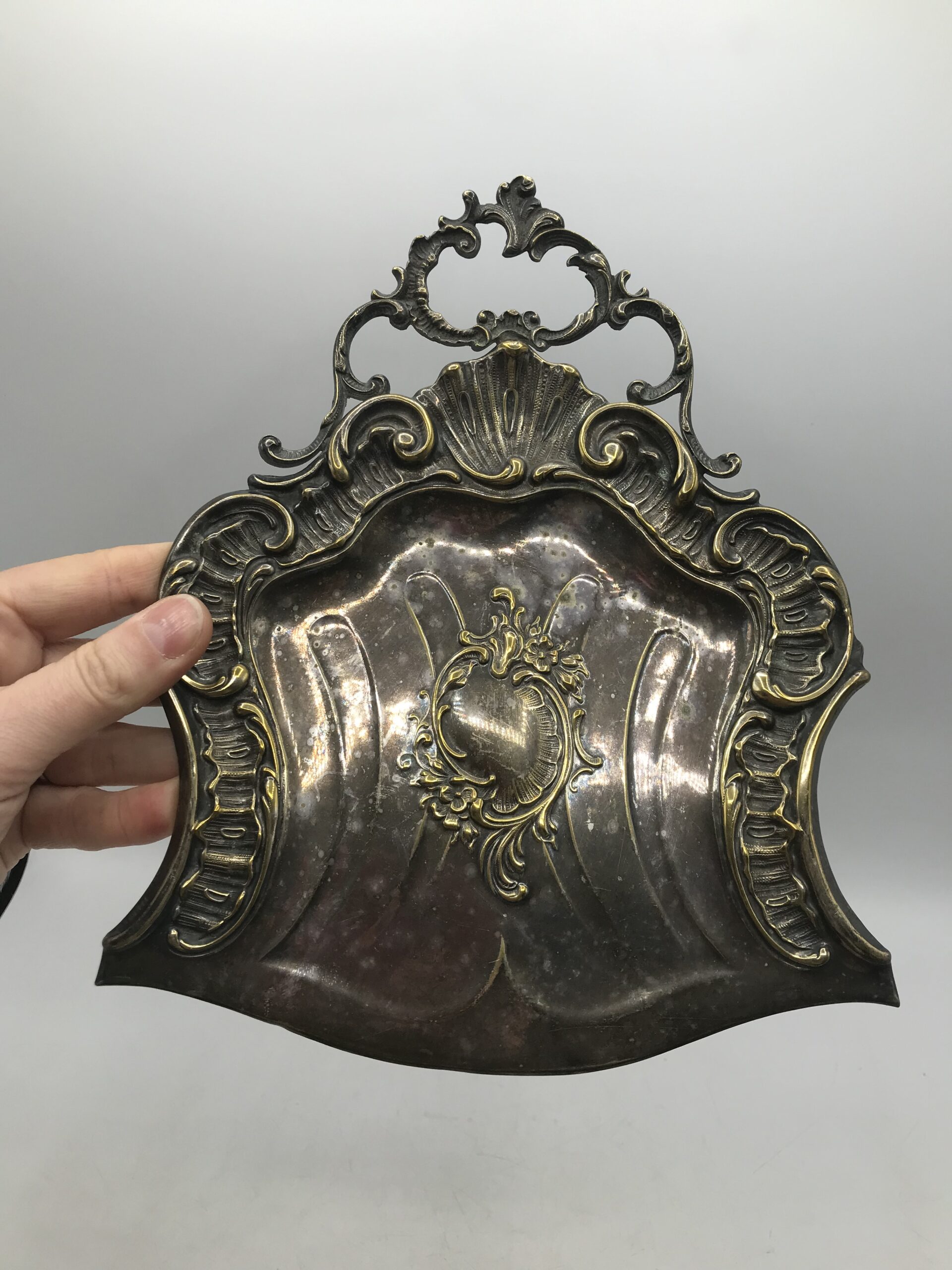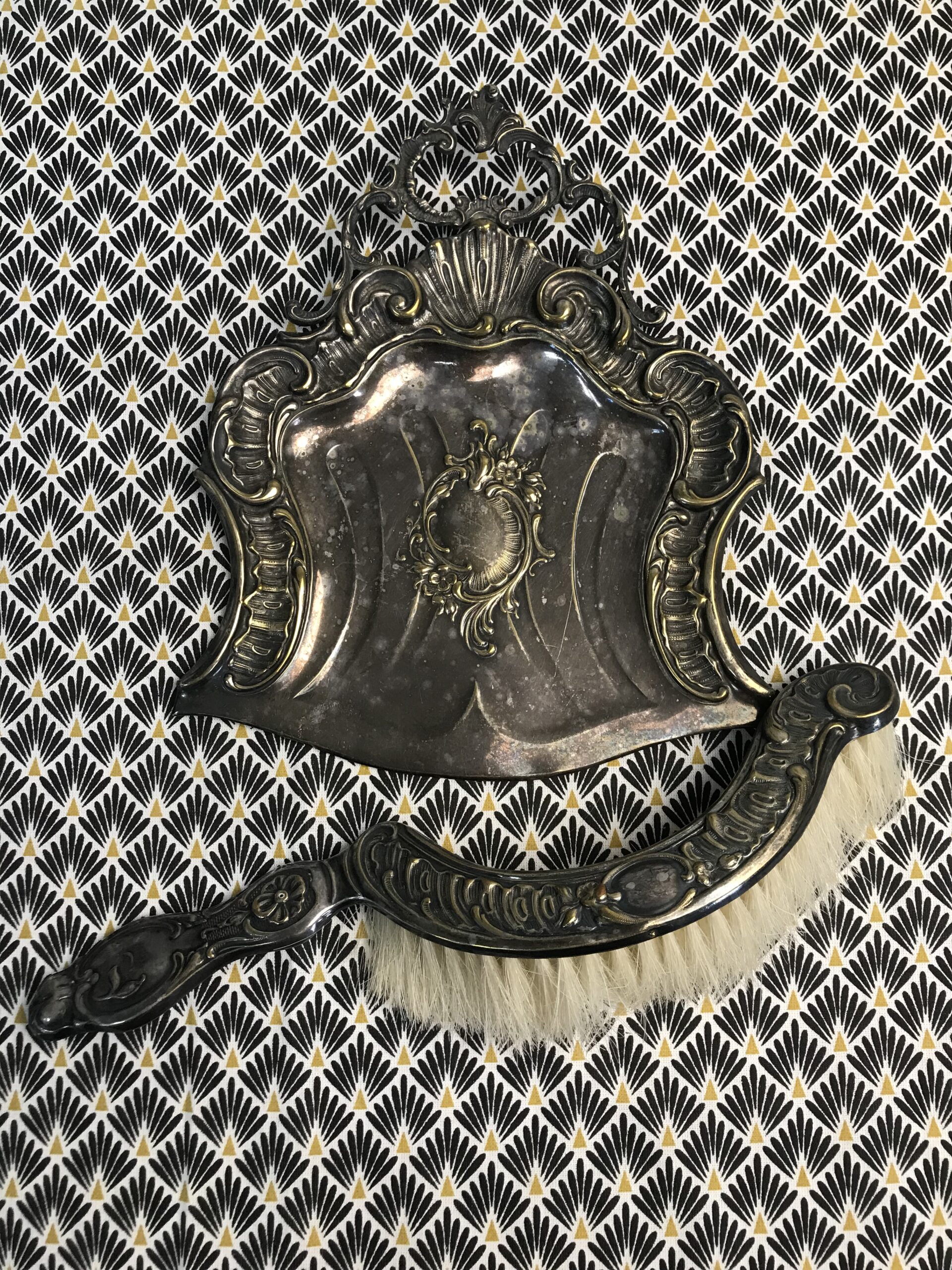 Ramasse miettes ancien. Voici un beau ramasse miettes ancien en métal accompagné de sa petite balayette de forme arrondie. Bel ensemble plein de charme, le charme d’antan, une douce sensation d’histoire nous traverse en les voyant. Les deux pièces sont décorées d’arabesques et de fleurs. Un accessoire pratique et très efficace qui ne se démode pas. Laissez rentrer cette part d’histoire chez vous, vous surprendrez vos amis et famille au moment de nettoyer la table. Le duo est en bon état de fonction mais présente des marques d’altération sur le métal cf photos) ce qui lui donne encore plus de charme. Nettoyer balayez, astiquer casa toujours pimpante !!!!