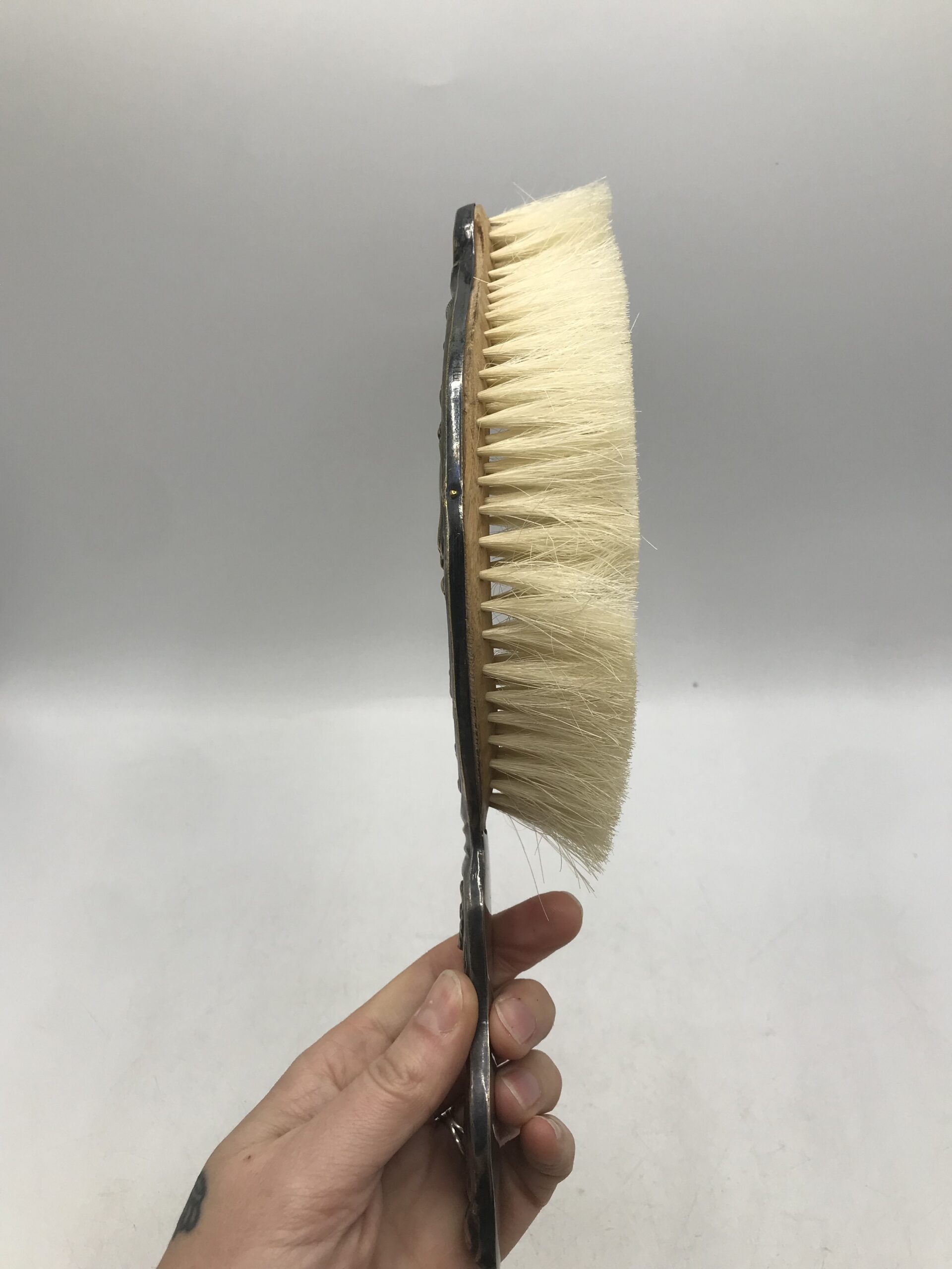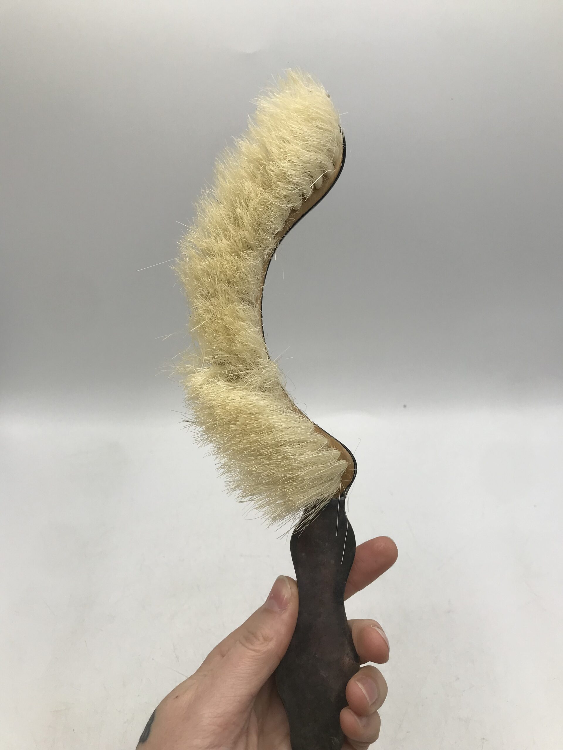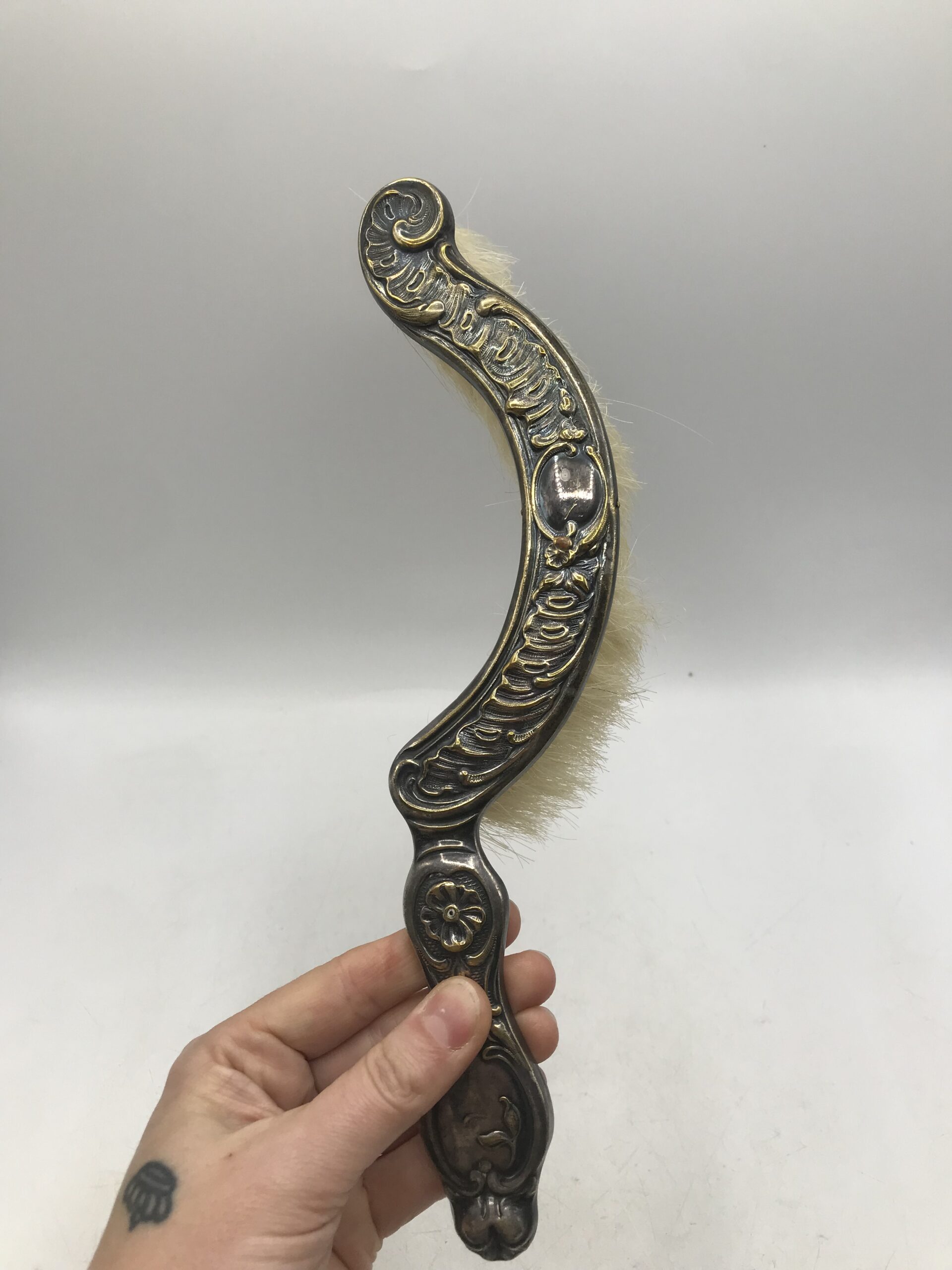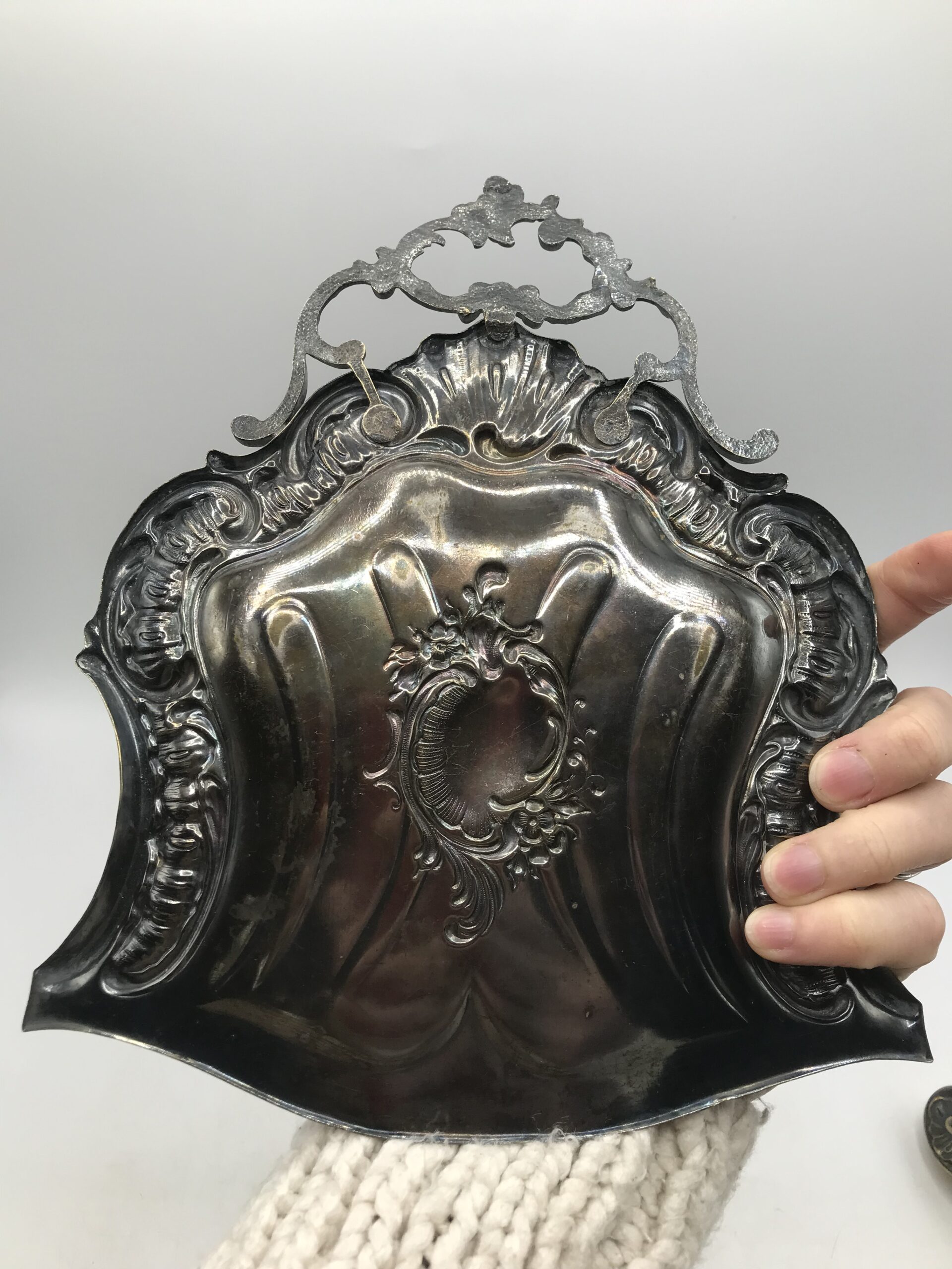Ramasse miettes ancien. Voici un beau ramasse miettes ancien en métal accompagné de sa petite balayette de forme arrondie. Bel ensemble plein de charme, le charme d’antan, une douce sensation d’histoire nous traverse en les voyant. Les deux pièces sont décorées d’arabesques et de fleurs. Un accessoire pratique et très efficace qui ne se démode pas. Laissez rentrer cette part d’histoire chez vous, vous surprendrez vos amis et famille au moment de nettoyer la table. Le duo est en bon état de fonction mais présente des marques d’altération sur le métal cf photos) ce qui lui donne encore plus de charme. Nettoyer balayez, astiquer casa toujours pimpante !!!!