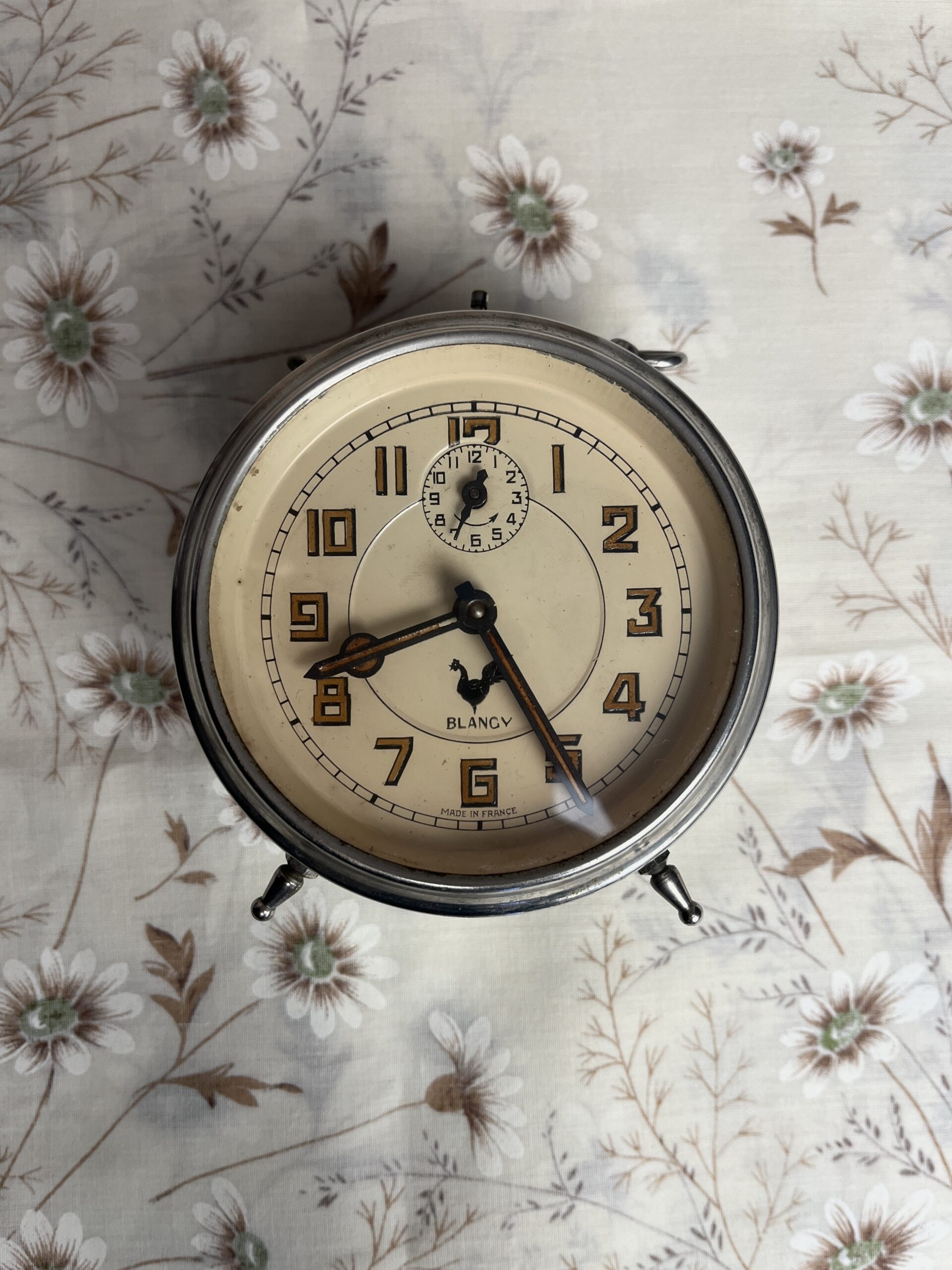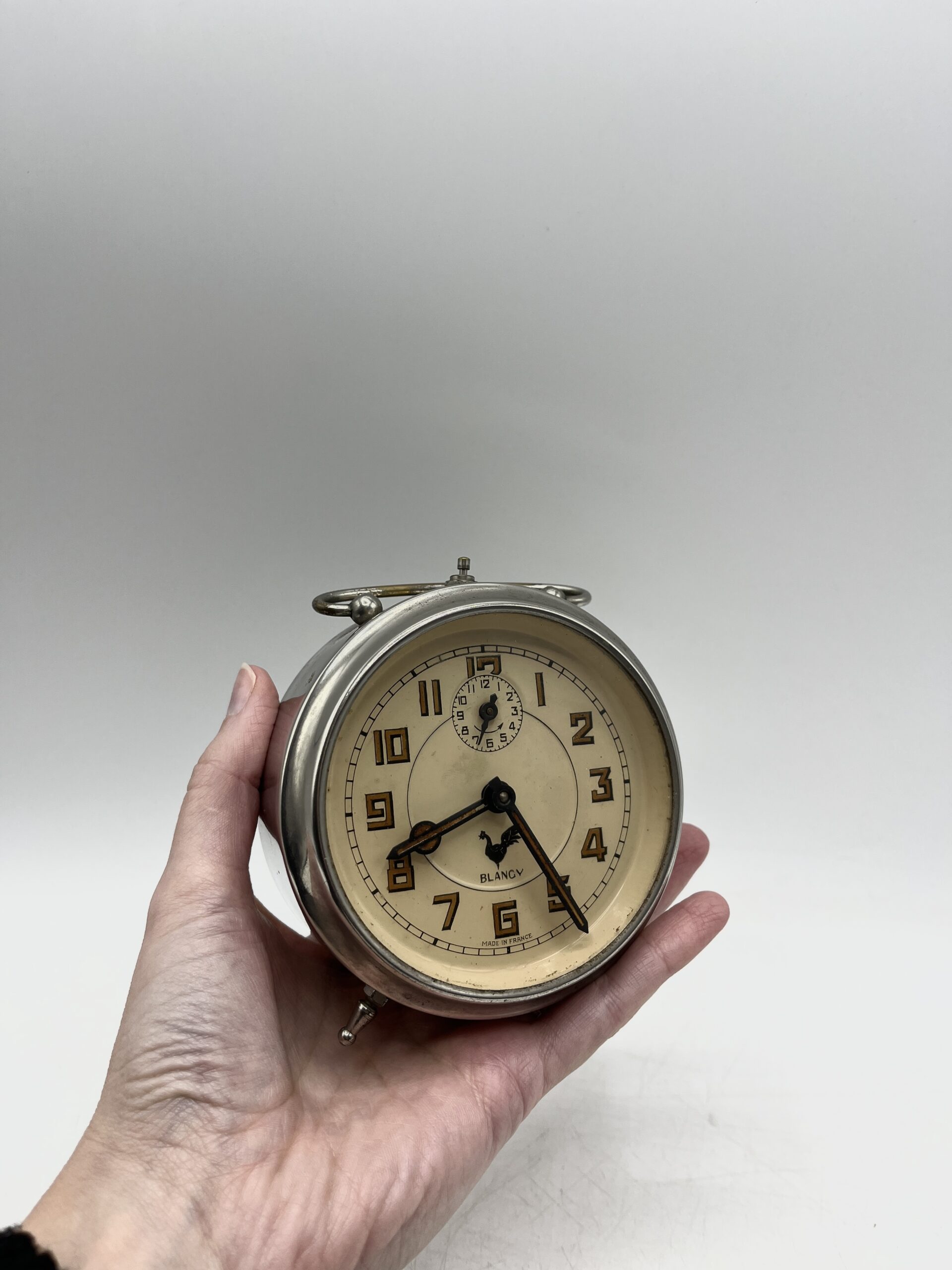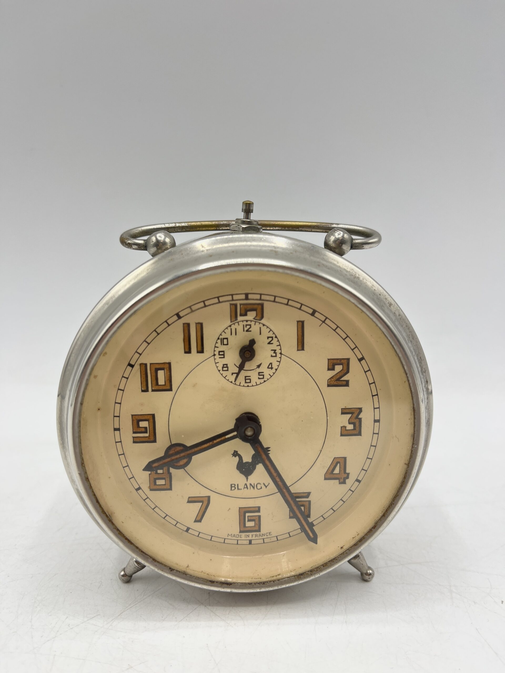 Le réveil mécanique Blangy France vous plonge dans l’élégance de son époque. Fabriqué en France, cet objet d’horlogerie incarne le charme du vintage avec son cadran patiné, ses chiffres rétro et son emblématique Coq Blangy. Vendu en tant qu’objet décoratif, le mécanisme de remontage est hors service. Avec son métal chromé, ses détails soignés et une touche d’authenticité, il s’intègrera parfaitement dans une décoration rétro ou industrielle. Passionné d’objets vintage et porteur d’histoire, ne laissez pas passer cette occasion pour apporter nostalgie et caractère à votre intérieur.