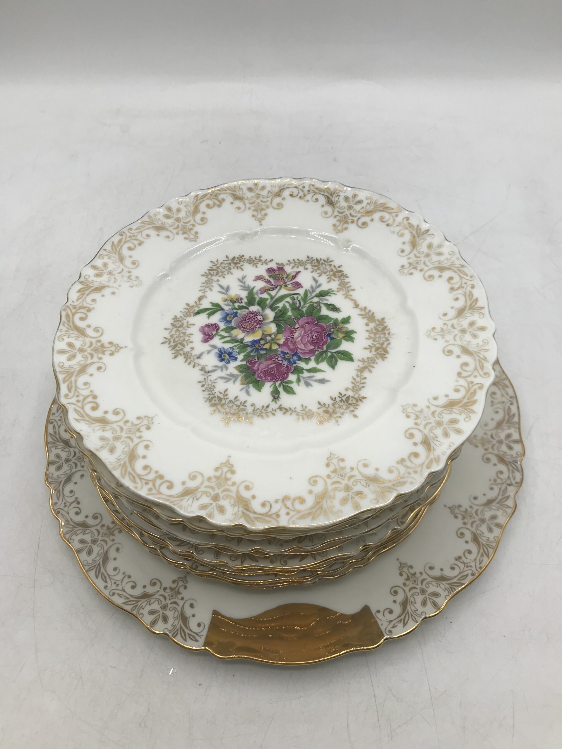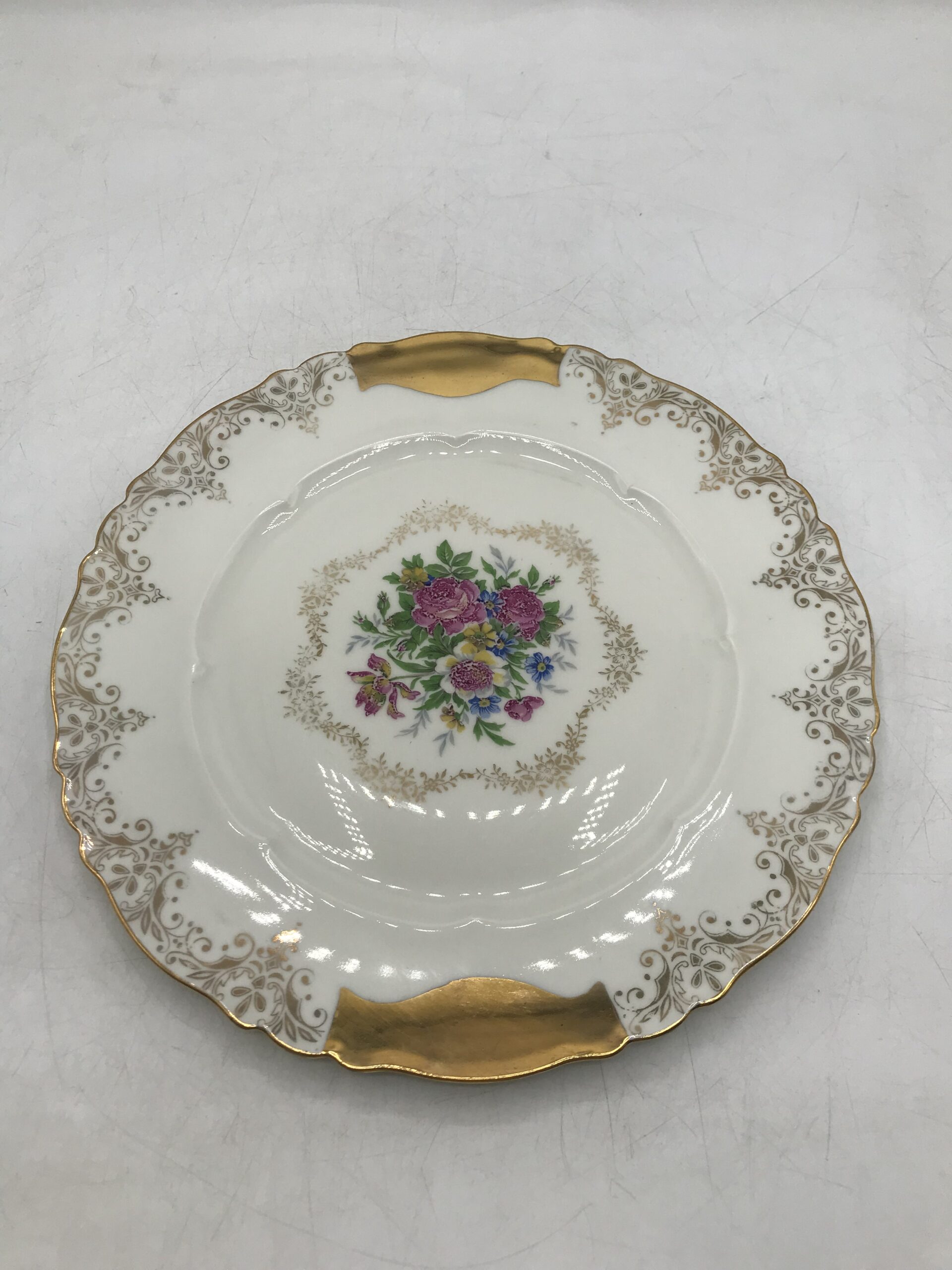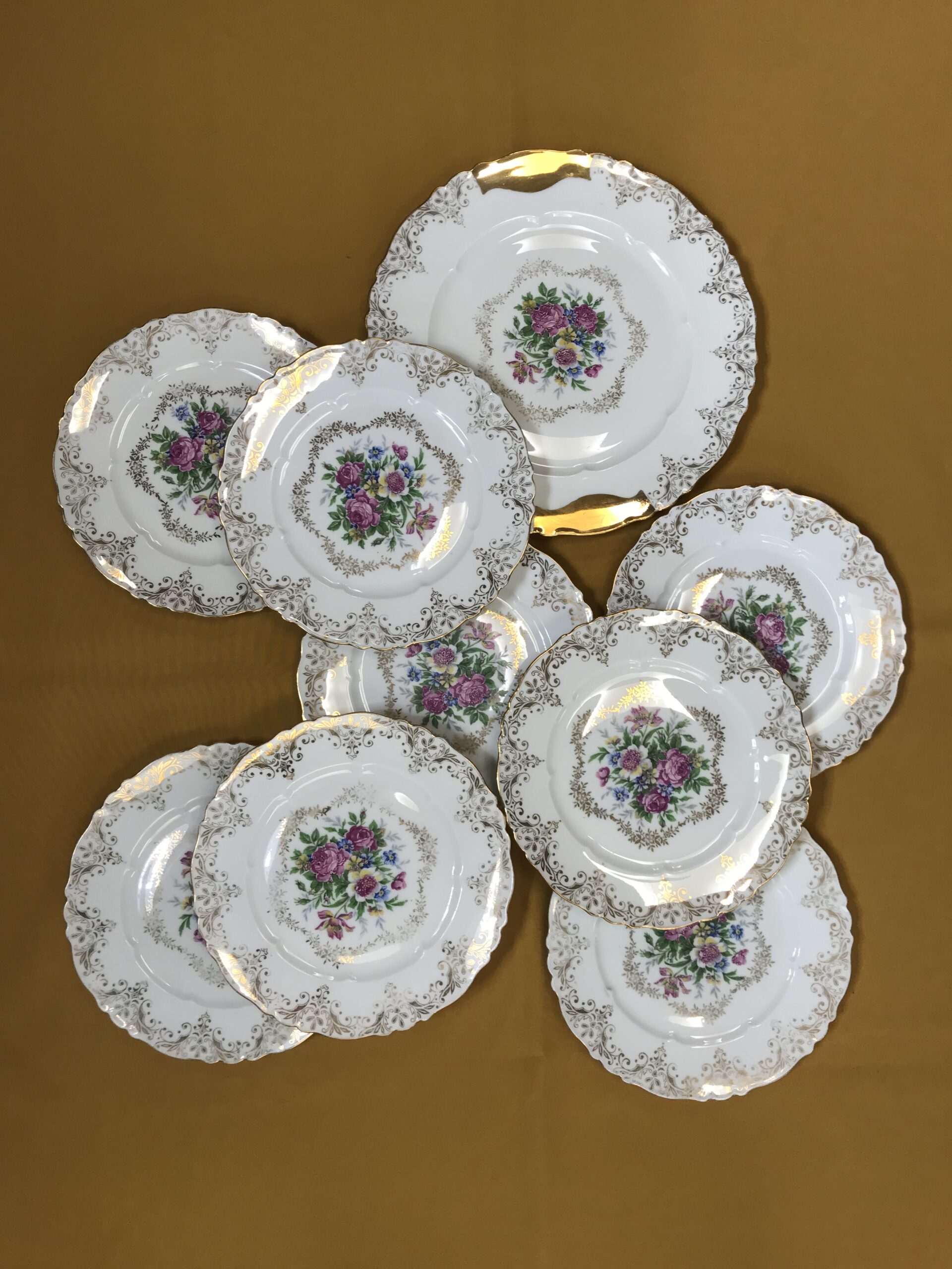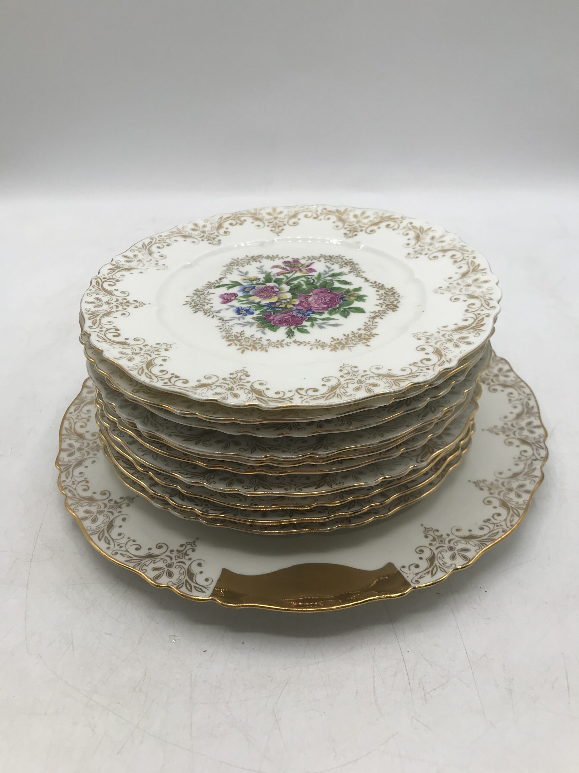 Service à desserts porcelaine de Limoges. Voici un superbe service à desserts en porcelaine de Limoges. Les service est composé de 8 assiettes et un plat à tarte. Les assiettes ont un diamètre de 19 cm pour une hauteur de 1,5 cm. Pour les accompagner nous avons un plat à tarte de diamètre 25 cm pour une hauteur de 1,5 cm. Le service est en bon état pas de casse ni d’éclats mais de l’usure présente sur les dorures (cf photos). Un joli ensemble avec un fond blanc qui sert de support pour découvrir de jolies fleurs entourées de frises dorées. Une vaisselle ancienne au style très détaillé et fin, une valeur sure pour recevoir avec gout et class vos amis et proche. Un coté bling bling assumé, et une porcelaine toujours aussi agréable au touché. Amateurs de vaisselle ancienne il vous attend.