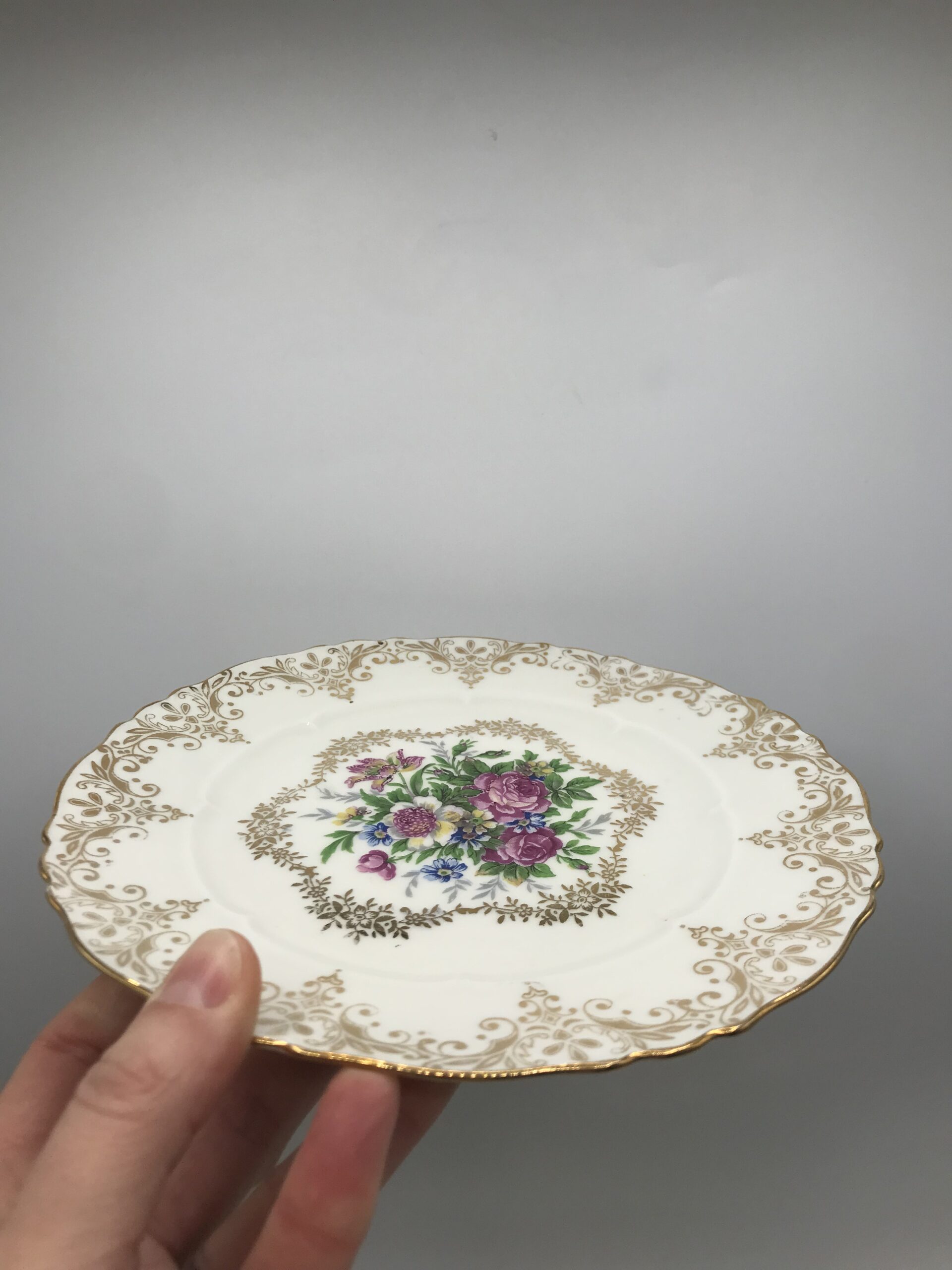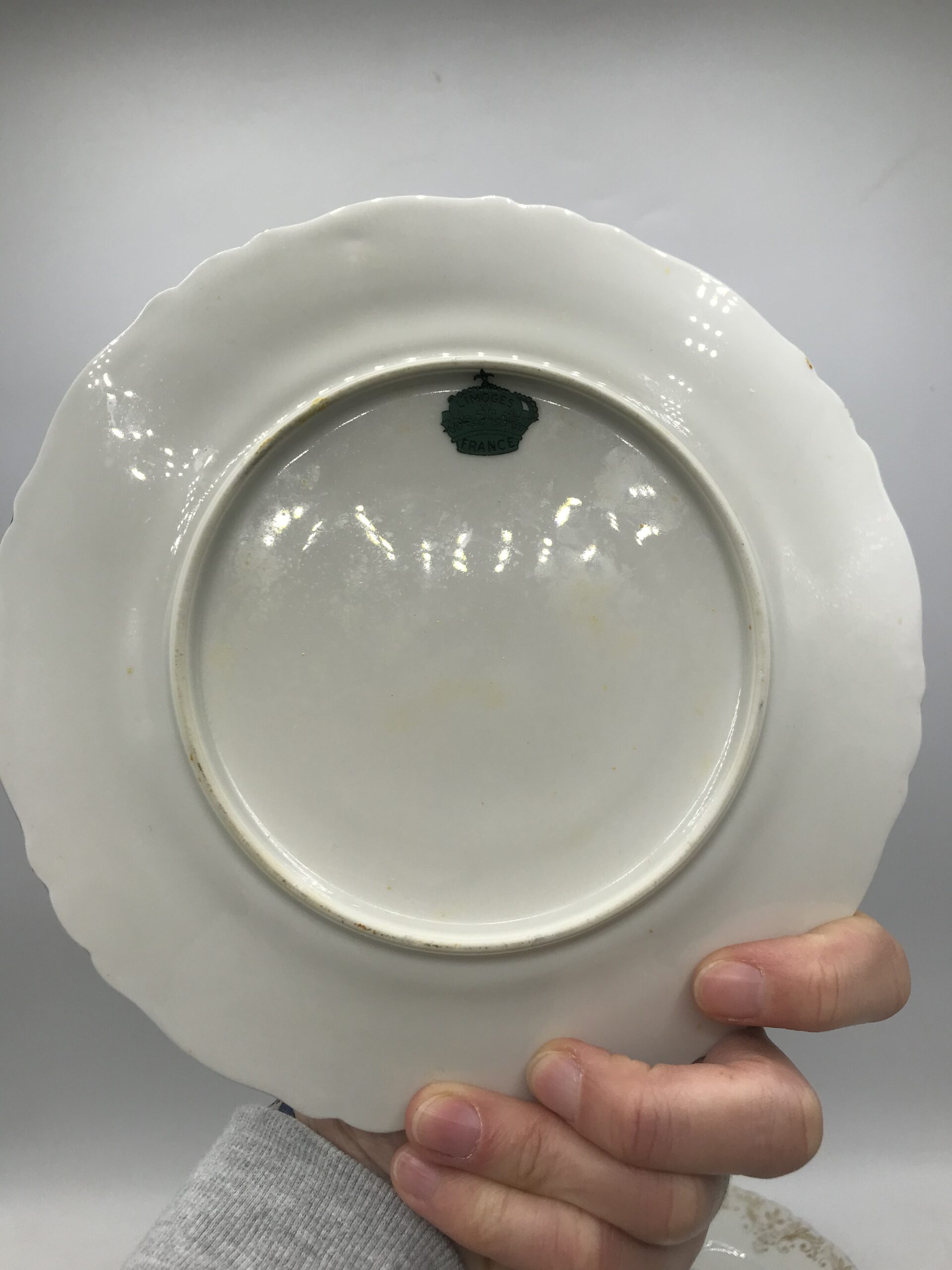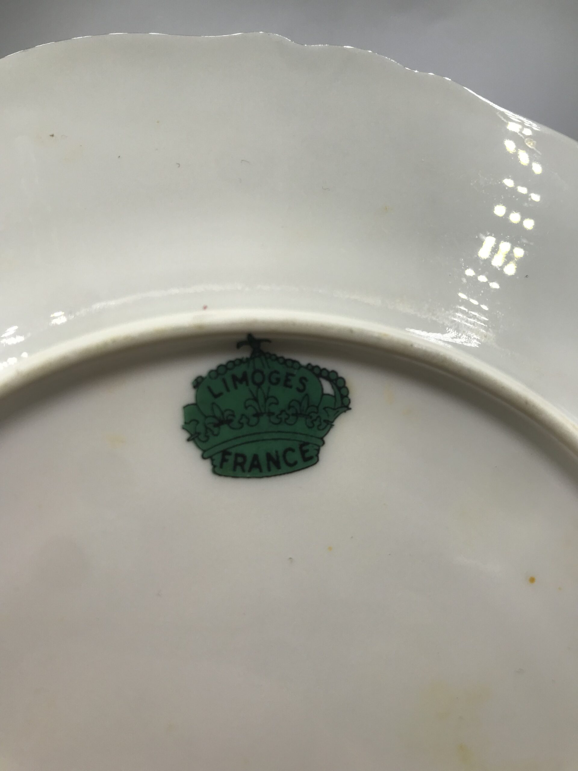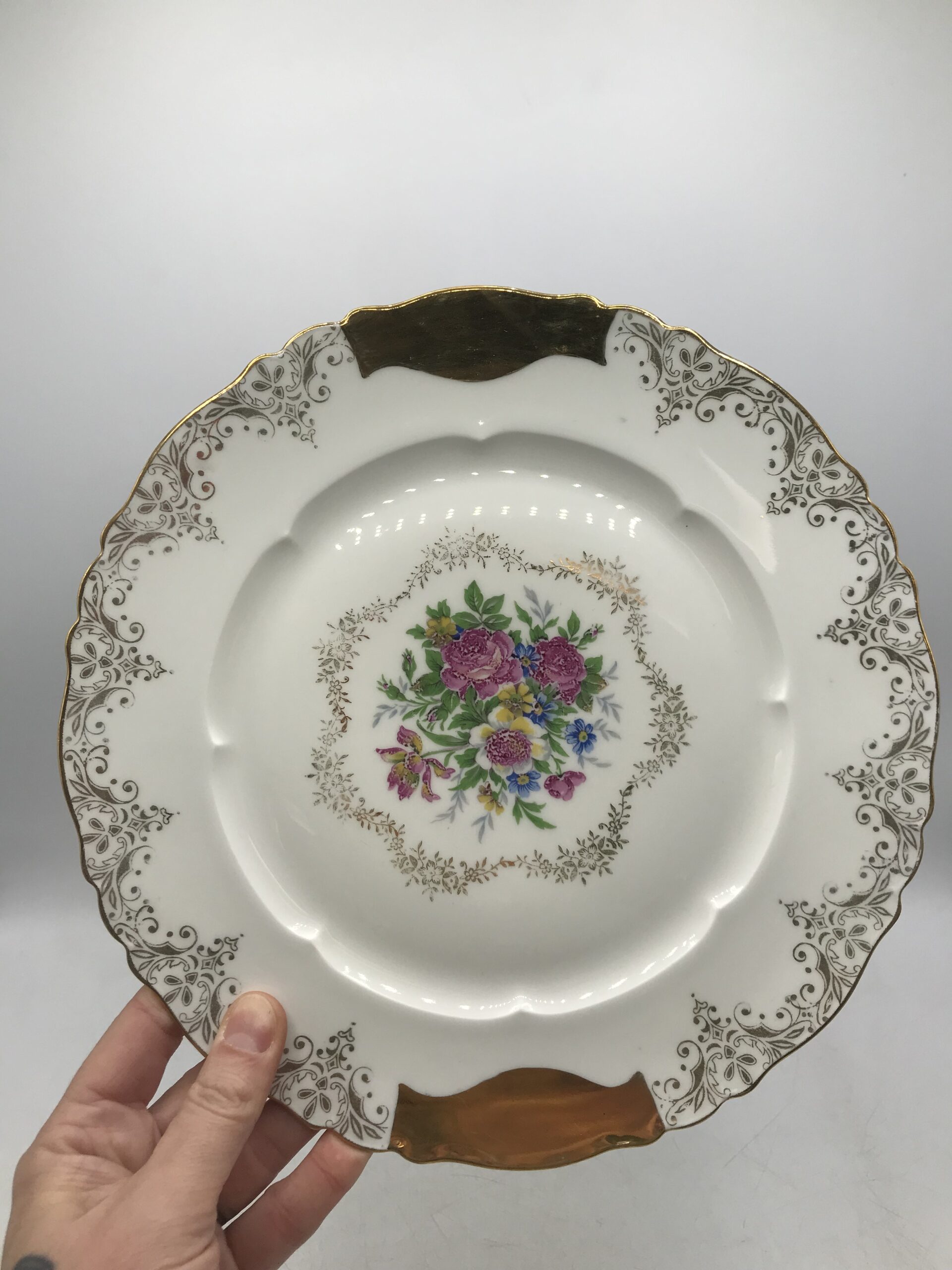 Service à desserts porcelaine de Limoges. Voici un superbe service à desserts en porcelaine de Limoges. Les service est composé de 8 assiettes et un plat à tarte. Les assiettes ont un diamètre de 19 cm pour une hauteur de 1,5 cm. Pour les accompagner nous avons un plat à tarte de diamètre 25 cm pour une hauteur de 1,5 cm. Le service est en bon état pas de casse ni d’éclats mais de l’usure présente sur les dorures (cf photos). Un joli ensemble avec un fond blanc qui sert de support pour découvrir de jolies fleurs entourées de frises dorées. Une vaisselle ancienne au style très détaillé et fin, une valeur sure pour recevoir avec gout et class vos amis et proche. Un coté bling bling assumé, et une porcelaine toujours aussi agréable au touché. Amateurs de vaisselle ancienne il vous attend.