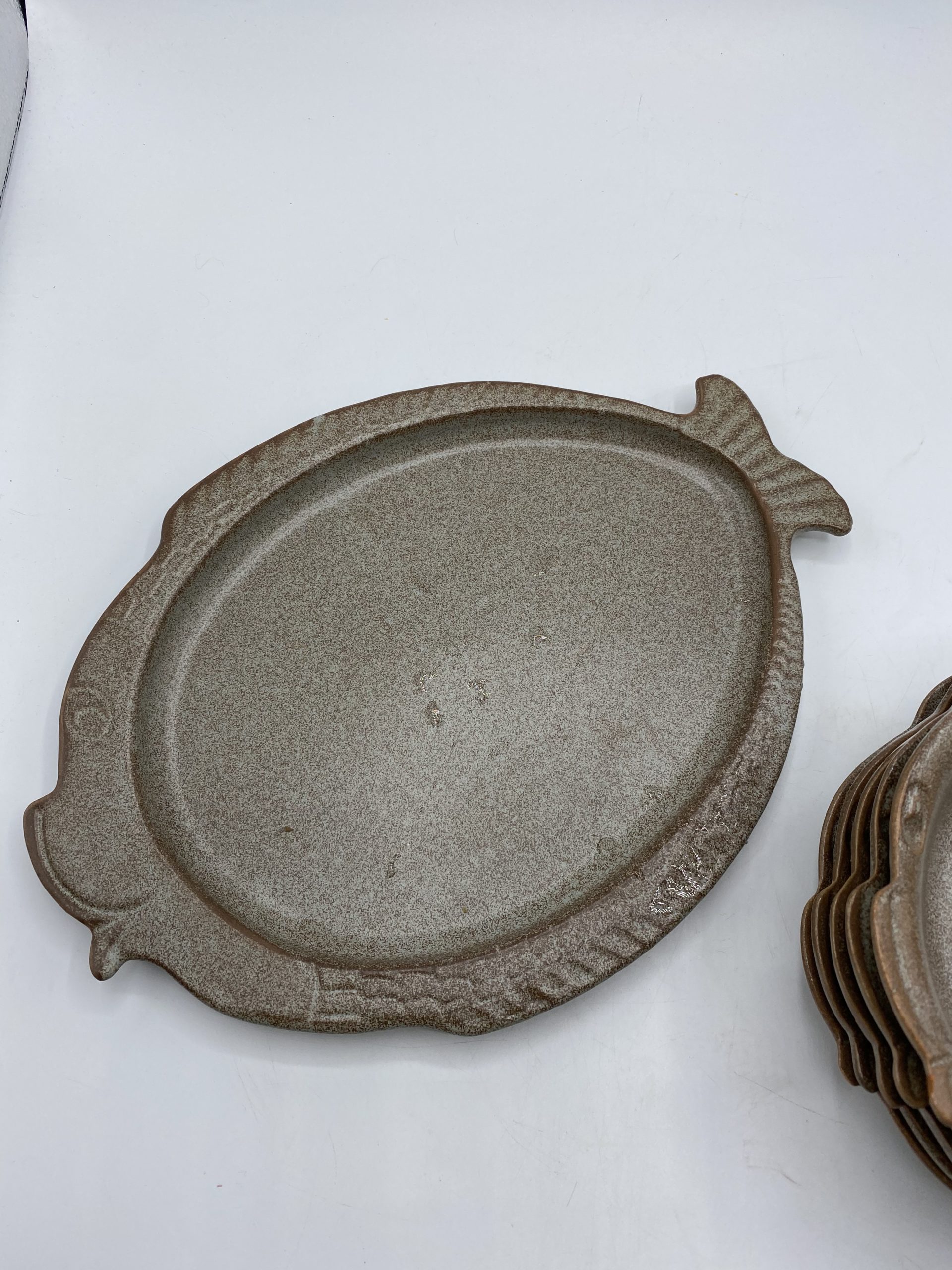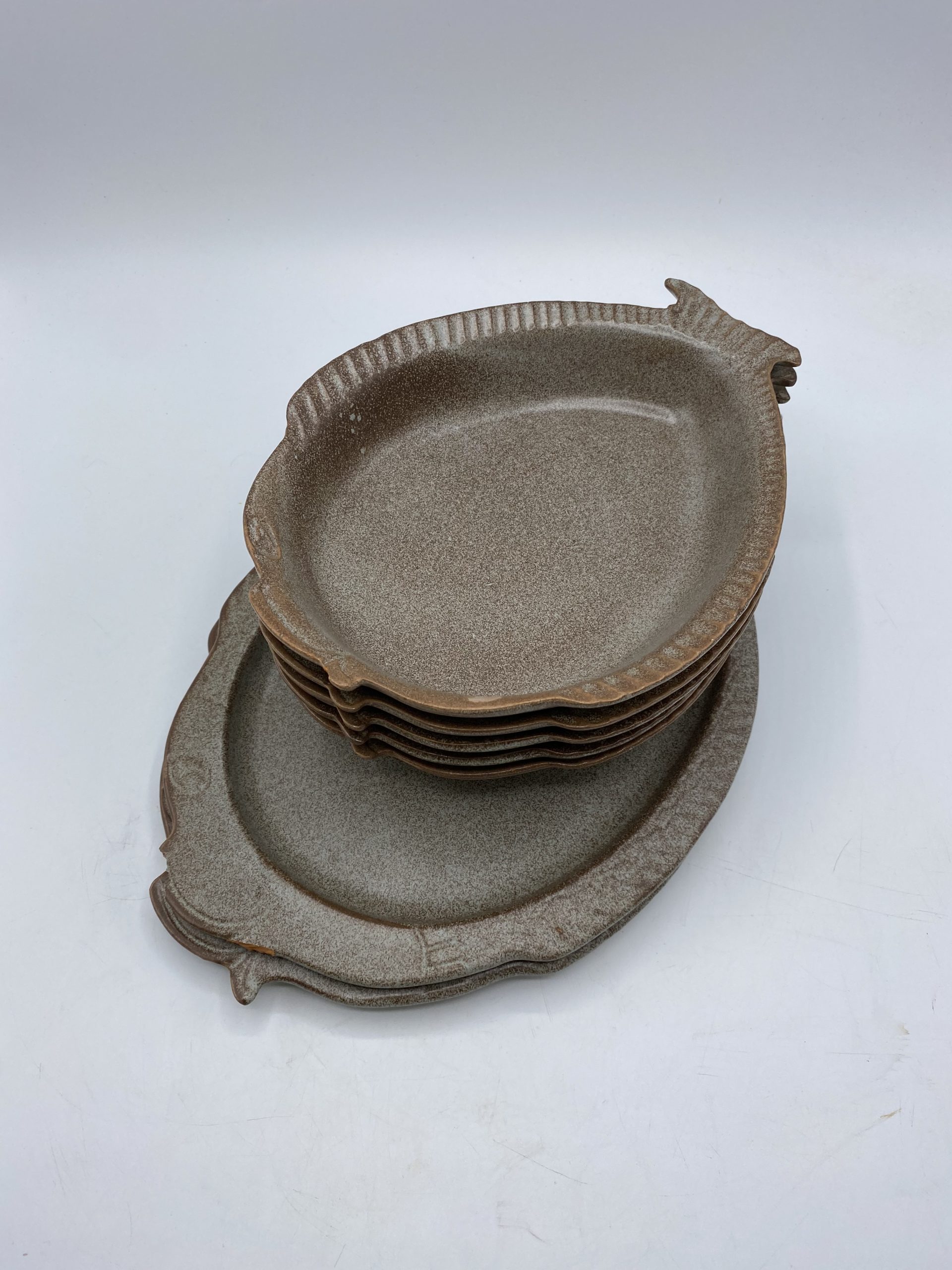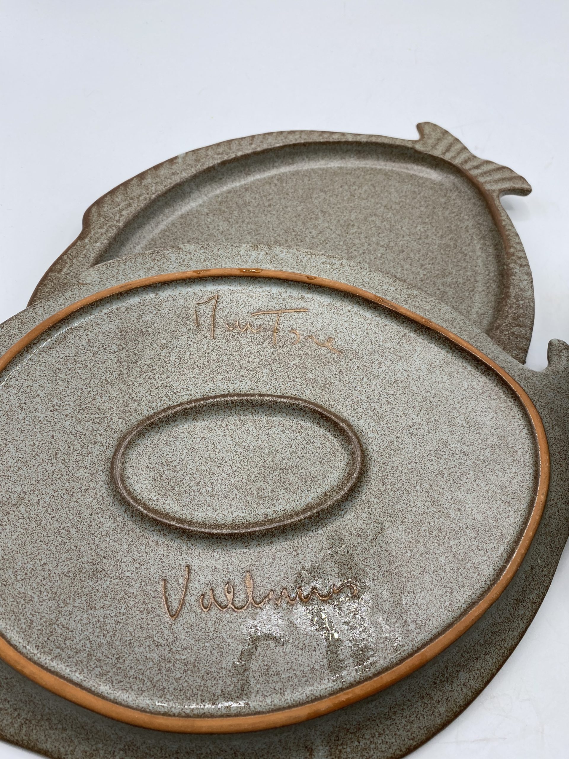 On adore ce magnifique service à poisson ! Composé de 5 assiettes creuses et de 2 plats de présentation. En céramique, le service en forme de poissons a une très jolie couleur entre le gris et le vert olive qui fait penser à du grès. Estampillé Vallauris, le service est artisanal et c’est donc une pièce unique ! Vintage, des éclats sont à prévoir (cf photos) jolies marques du temps passé. Un sublime service à shopper rapidement !