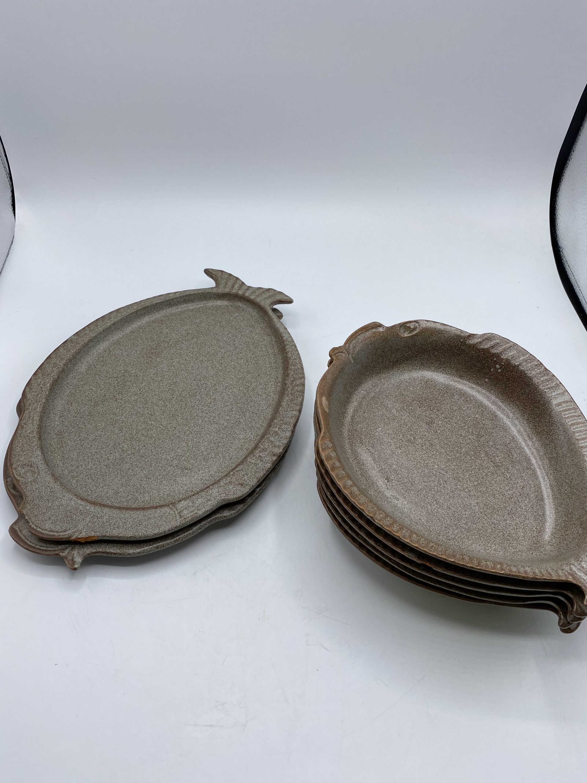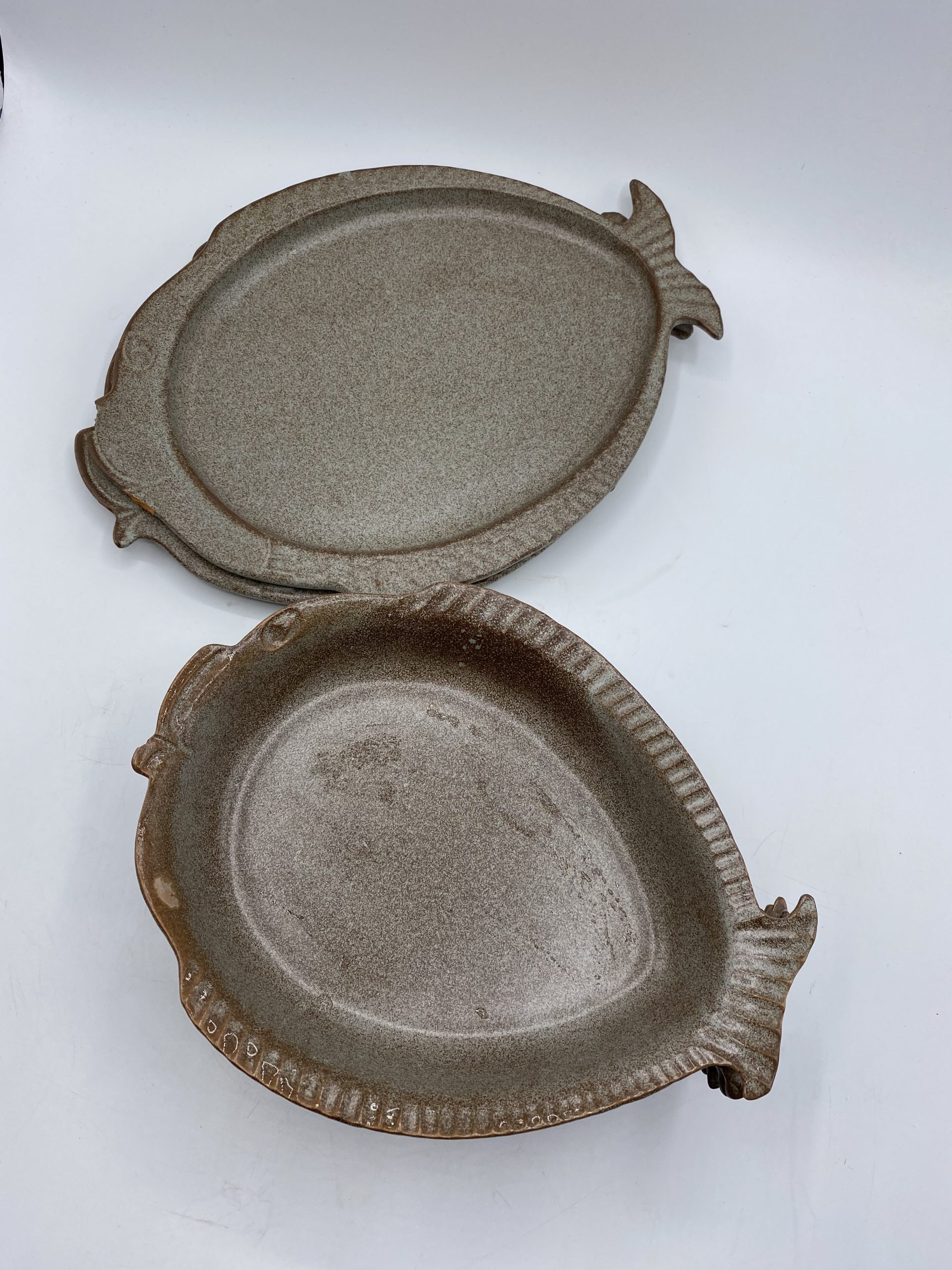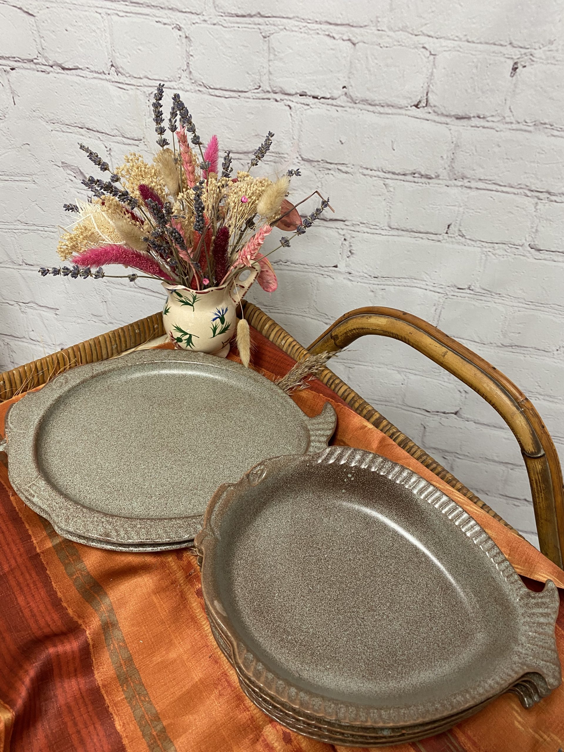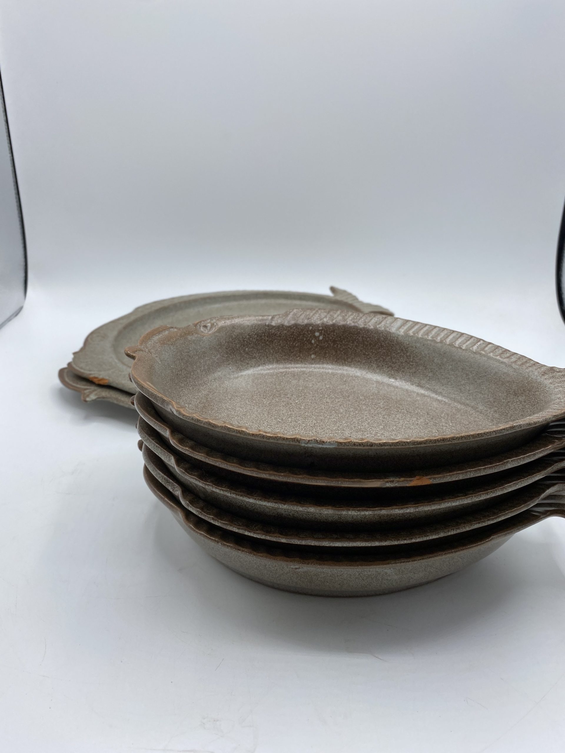 On adore ce magnifique service à poisson ! Composé de 5 assiettes creuses et de 2 plats de présentation. En céramique, le service en forme de poissons a une très jolie couleur entre le gris et le vert olive qui fait penser à du grès. Estampillé Vallauris, le service est artisanal et c’est donc une pièce unique ! Vintage, des éclats sont à prévoir (cf photos) jolies marques du temps passé. Un sublime service à shopper rapidement !