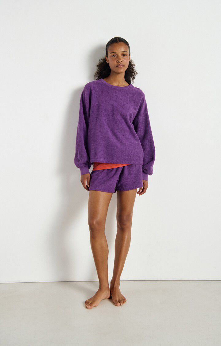 Sa matière texturée, lui donne une touche homewear. Sa couleur Figue (AH2526) sa coupe ample, et sa texture bouclette le rendent irrésistible.