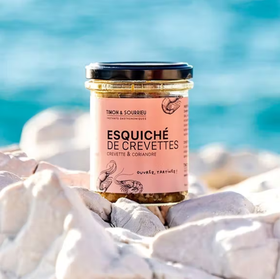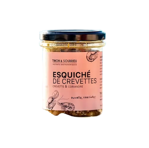 Crevettes 40 % (origine : océan indien), vin blanc, artichaut, fond de veau (contient du blé et du céleri), huile d’olive vierge extra, oignons, coriandre 2,6%, amidon de pommes de terre, confiture d’orange, ail, sel, épices (curry doux, ras el-hanout).