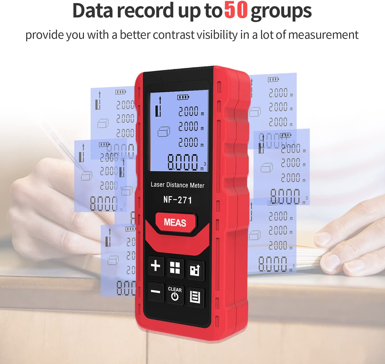 Stockage de données puissant : 50 groupes de stockage de données vous offrent une meilleure visibilité du contraste dans de nombreuses opérations de mesure. Unités pieds/mètres/pouces, grand écran LCD rétroéclairé avec 4 lignes pour une lecture plus facile.