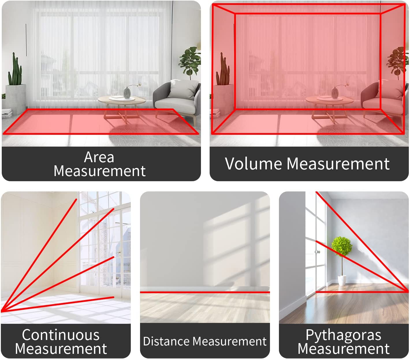 Fonctions de mesure multiples : mesure de distance unique et continue, surface, volume, Pythagore pour la hauteur et la plage de triangle ; fonction d’addition et de soustraction.