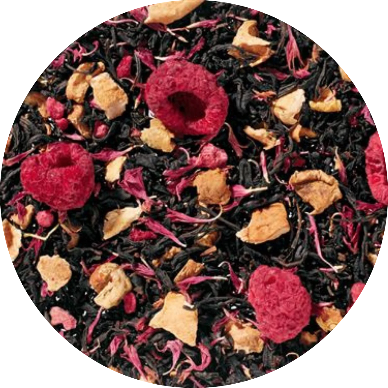 thé noir (65%), morceaux de pomme, arôme naturel, morceaux de framboise lyophilisée, framboises entières lyophilisée, fleurs de barbeau rose