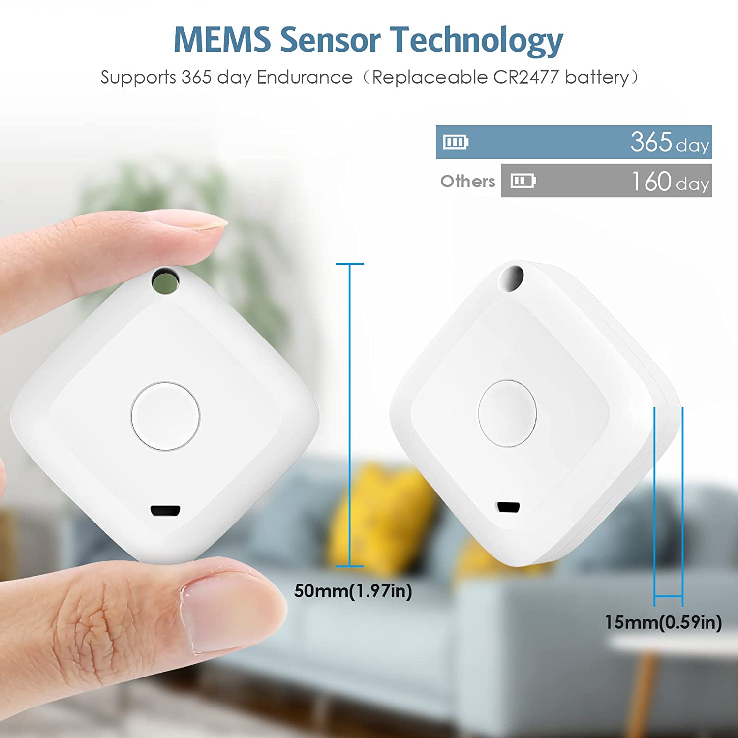 Conception portable : capteurs sans fil plus petits que les autres marques (1,97 x 0,59 pouces). Peu encombrant et portable. Un trou de suspension est conçu pour un placement différent comme vous le souhaitez. Avec une pile CR2477, il peut être utilisé pendant environ 100 jours.