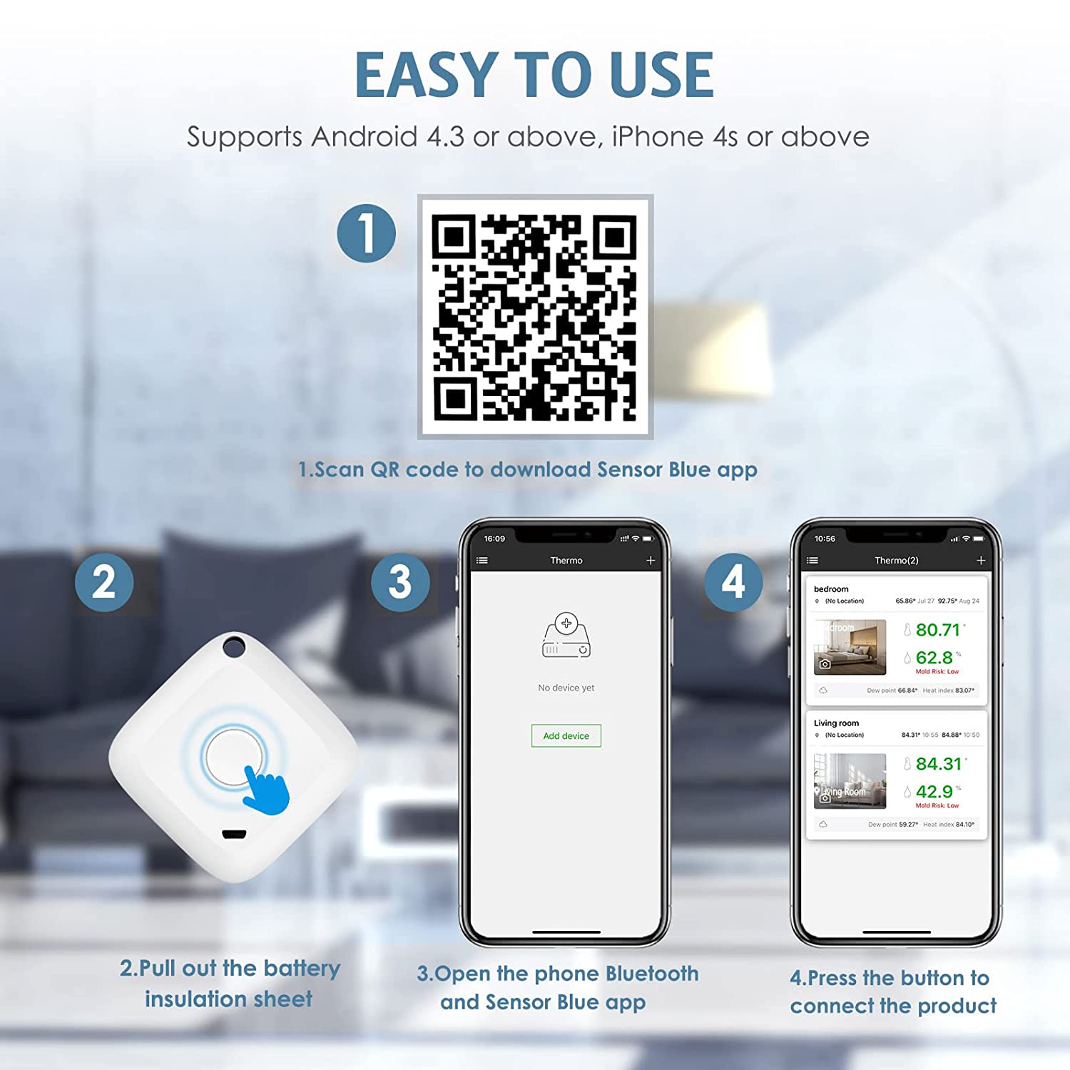 Contrôle d’application sans fil : nous utilisons une puce Bluetooth 5.0 haut de gamme et pouvons surveiller à distance les données de température et d’humidité via l’application via Bluetooth. (Téléchargement gratuit sur App Store et Google Play)