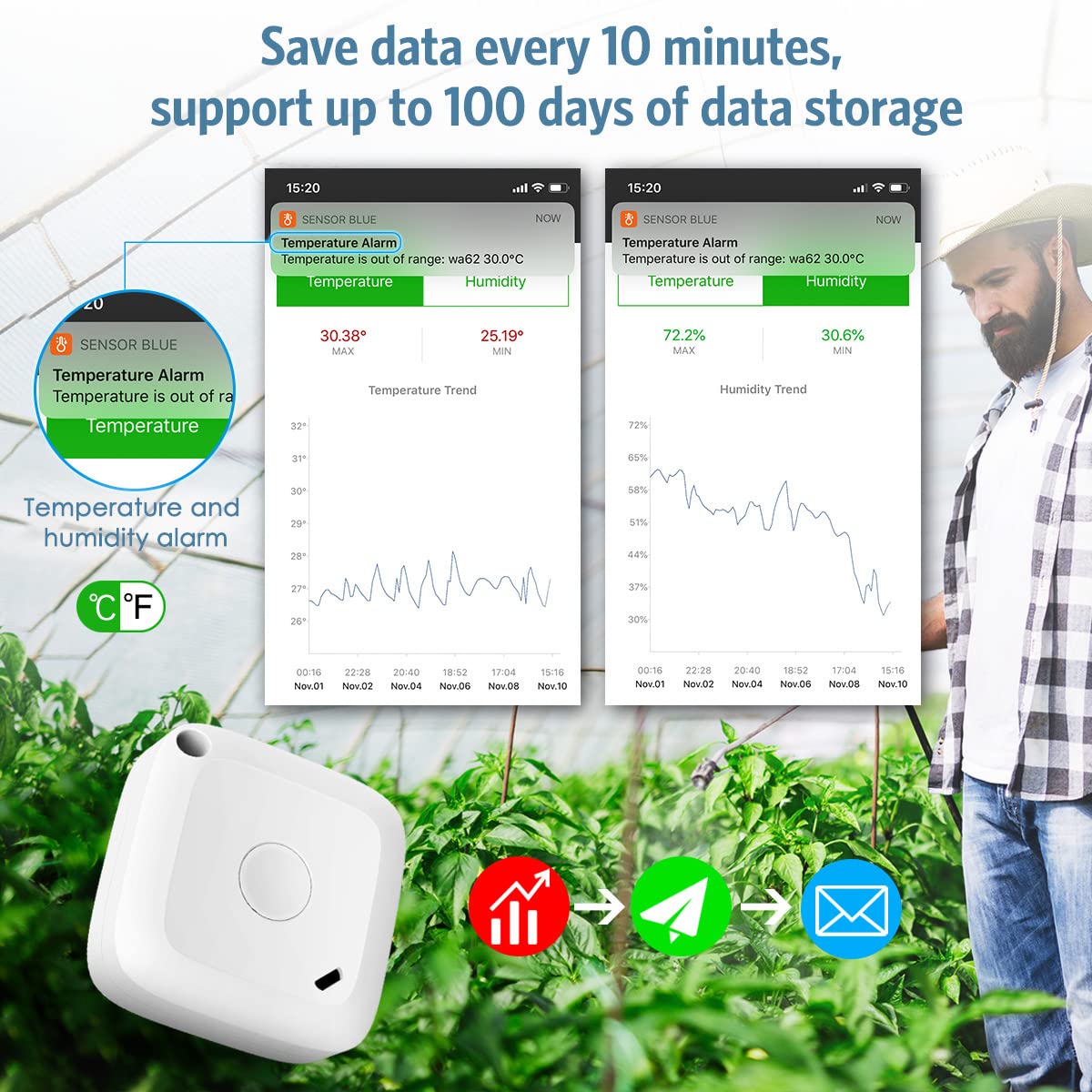 Exportation de stockage de données : le thermomètre hygromètre prend en charge la fonction d’exportation de données de température, enregistrant un certain nombre de données toutes les 10 minutes, jusqu’à 100 jours de données peuvent être stockées. Vous pouvez afficher les valeurs maximales et minimales de température et d’humidité sur l’application mobile, vous pouvez régler la plage de surveillance de la température et de l’humidité, la valeur sur l’application devient rouge pour indiquer qu’elle est hors plage et le téléphone peut déclencher l’alarme. .