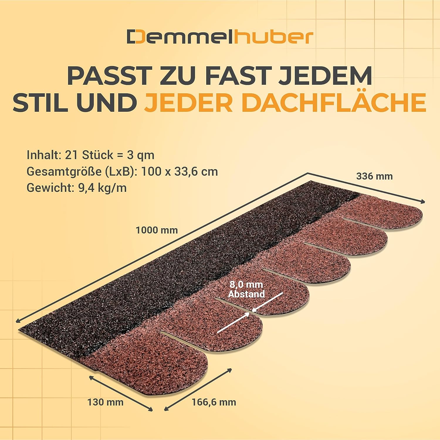 Original DEMMELHUBER : Les bardeaux de toit en bitume se composent d’un insert en voile de verre, qui est recouvert de bitume des deux côtés. Grâce au bitume, les bardeaux sont un matériau de couverture complètement dense et de haute qualité. Sur le dessus du bardeau de bitume, vous appliquez un granulat coloré résistant aux UV pendant la production. Contenu : 21 pièces = 3 m², longueur : 100 cm