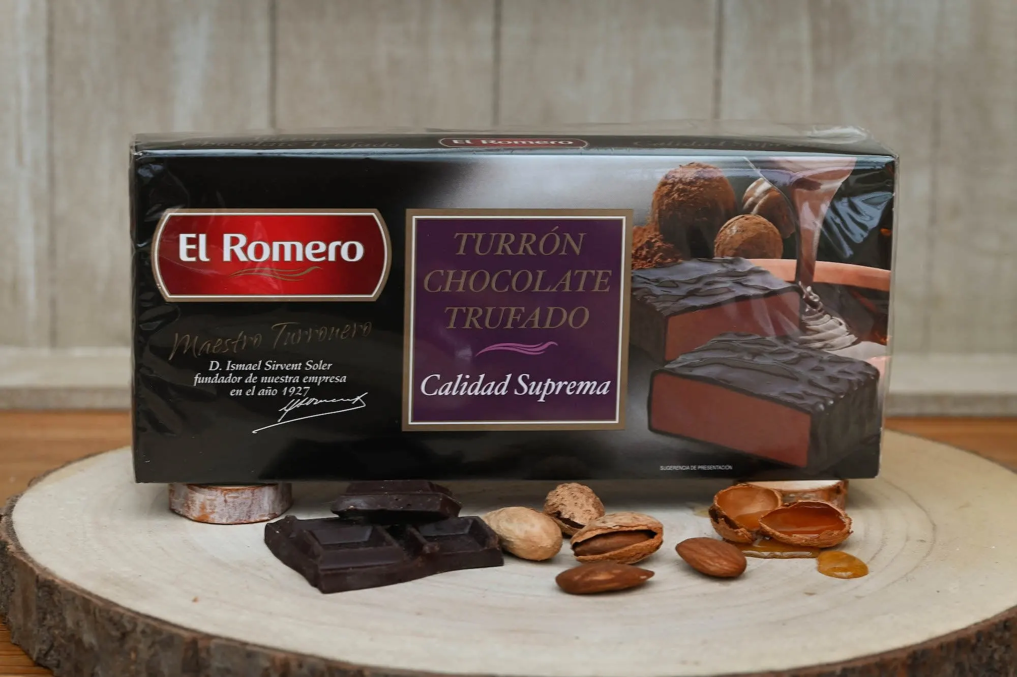 Turrón (nougat) au chocolat truffé (200g) de la marque El Romero est un nougat espagnol traditionnellement réalisé à base de miel, sucre, blanc d’oeuf et amandes.