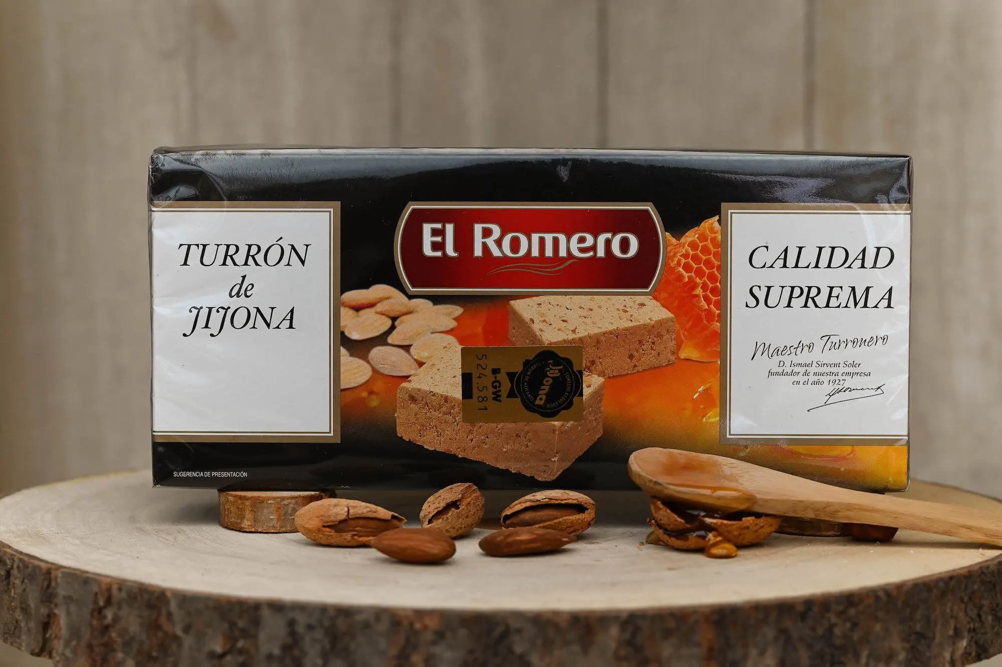 Turrón (nougat) de Jijona (300g) de la marque El Romero est un nougat espagnol traditionnellement réalisé à base de miel, sucre, blanc d’oeuf et amandes.
